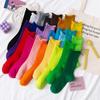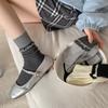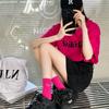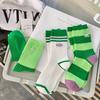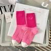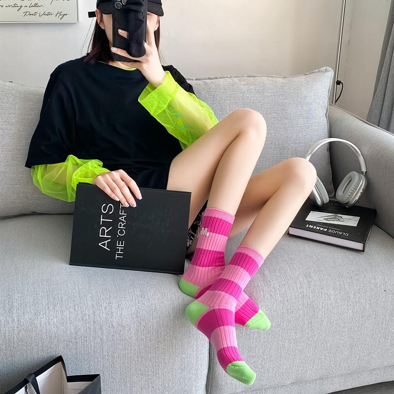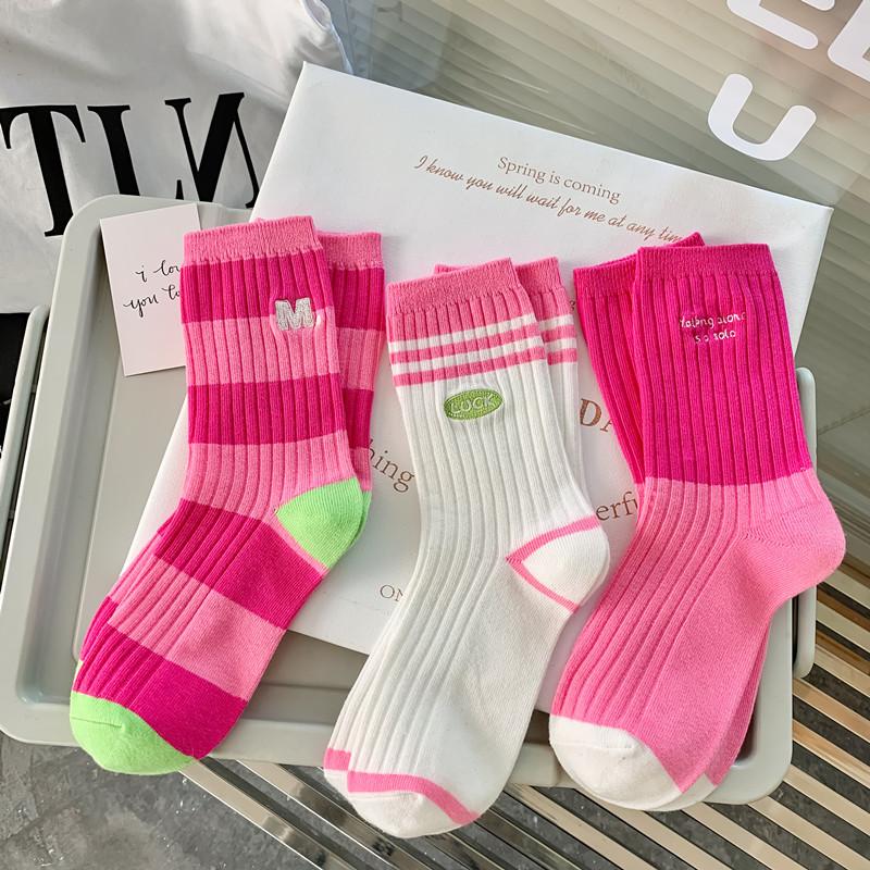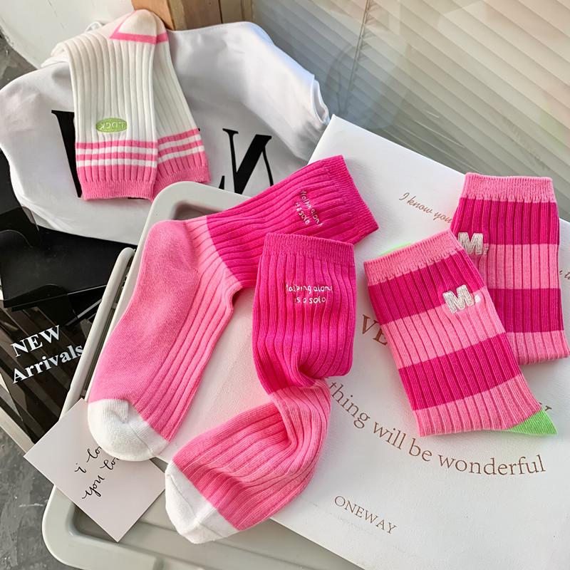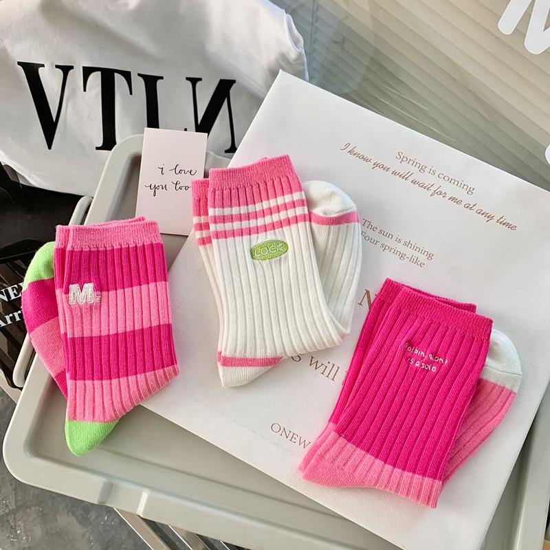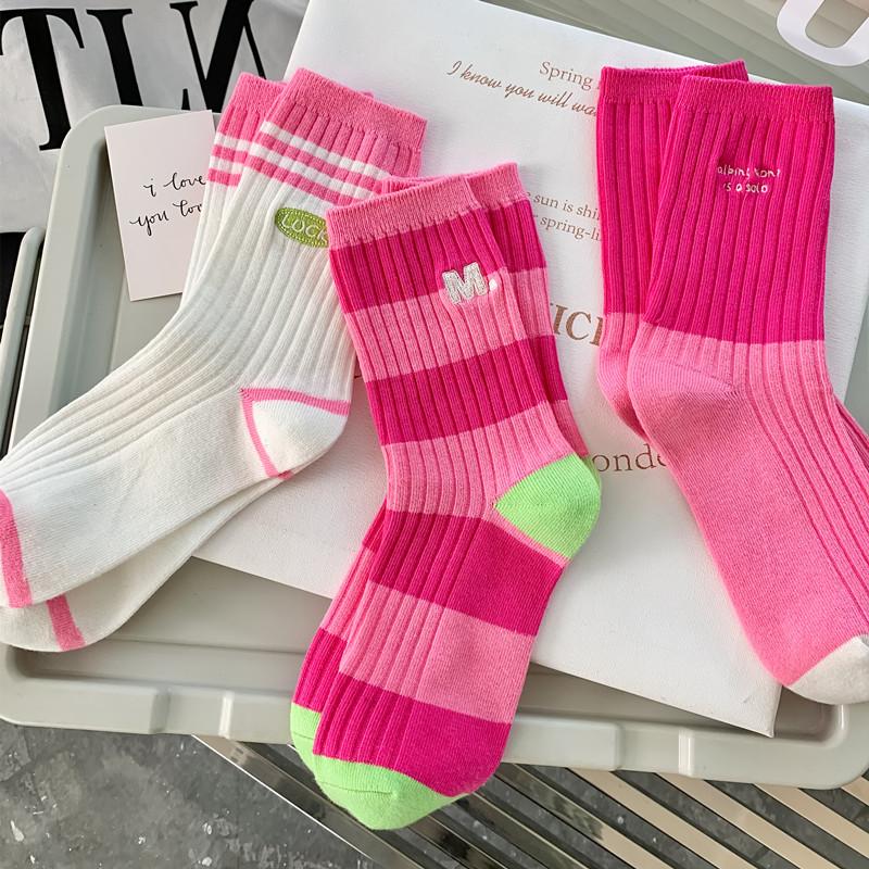 Calcetines de mujer con bordado de doble aguja, color rojo rosa, hasta media pantorrilla, de algodón, a rayas, de primavera y verano, de colores contrastantes, populares en red roja.