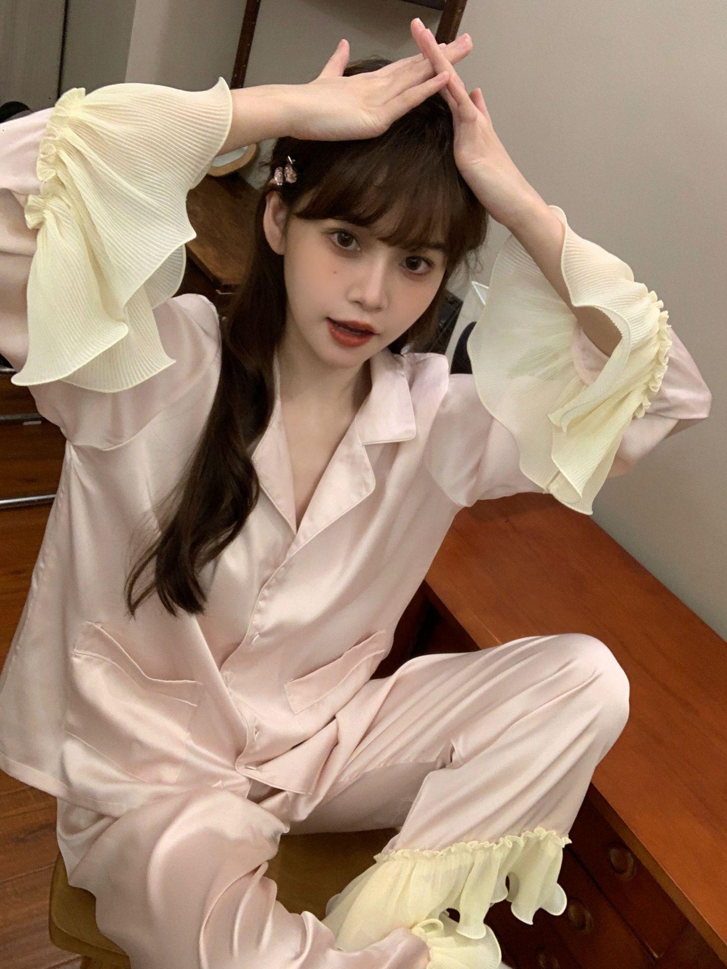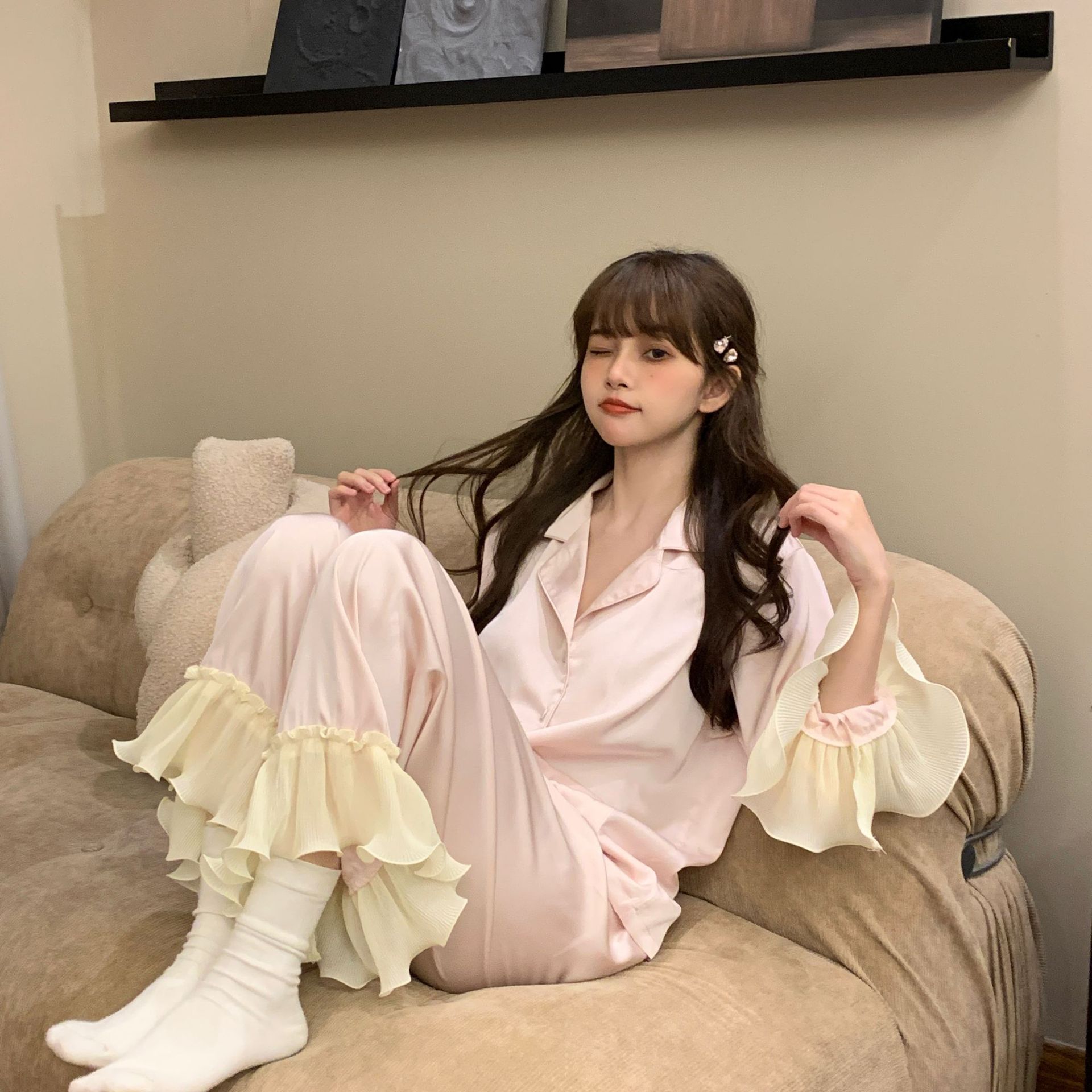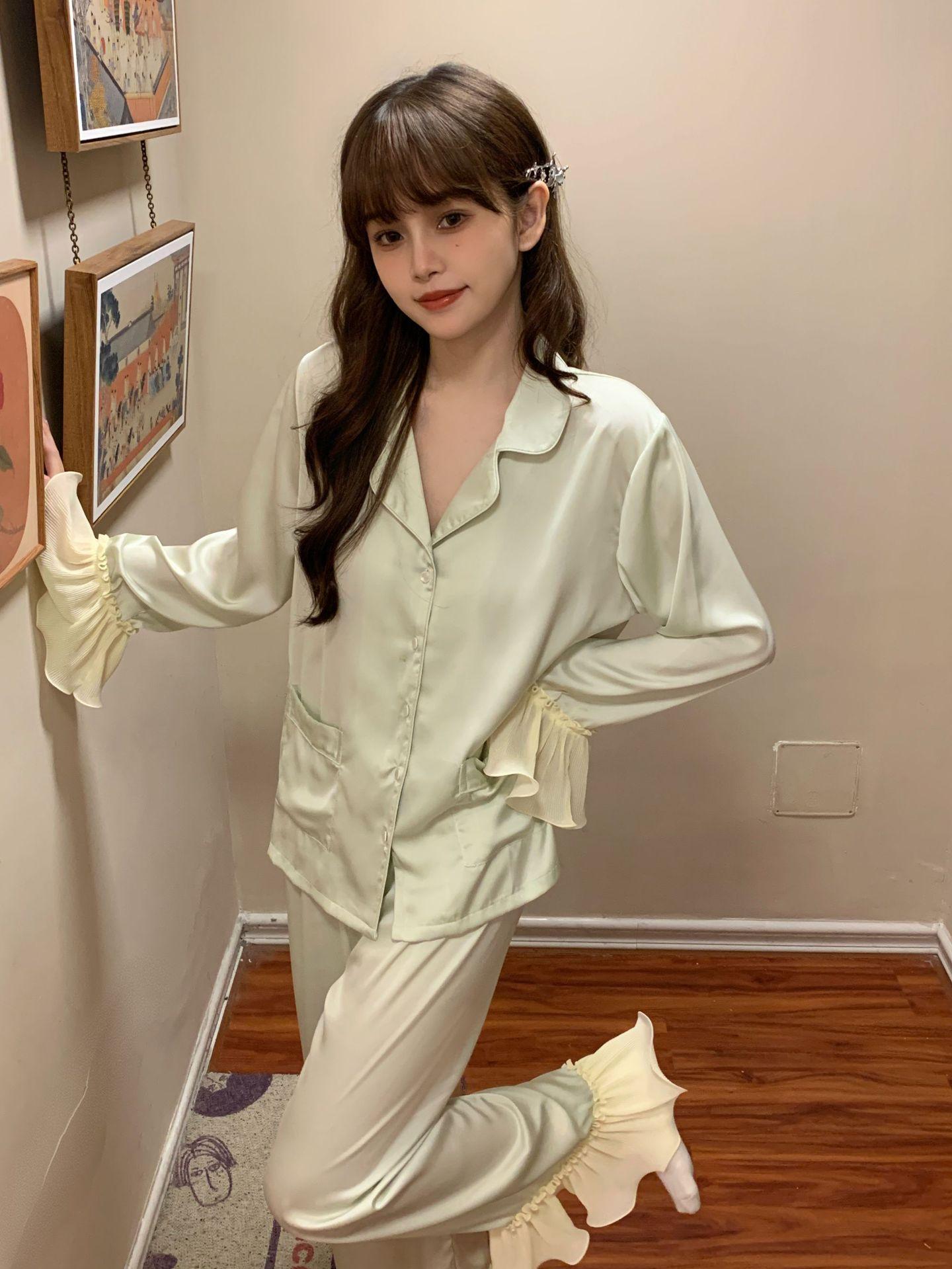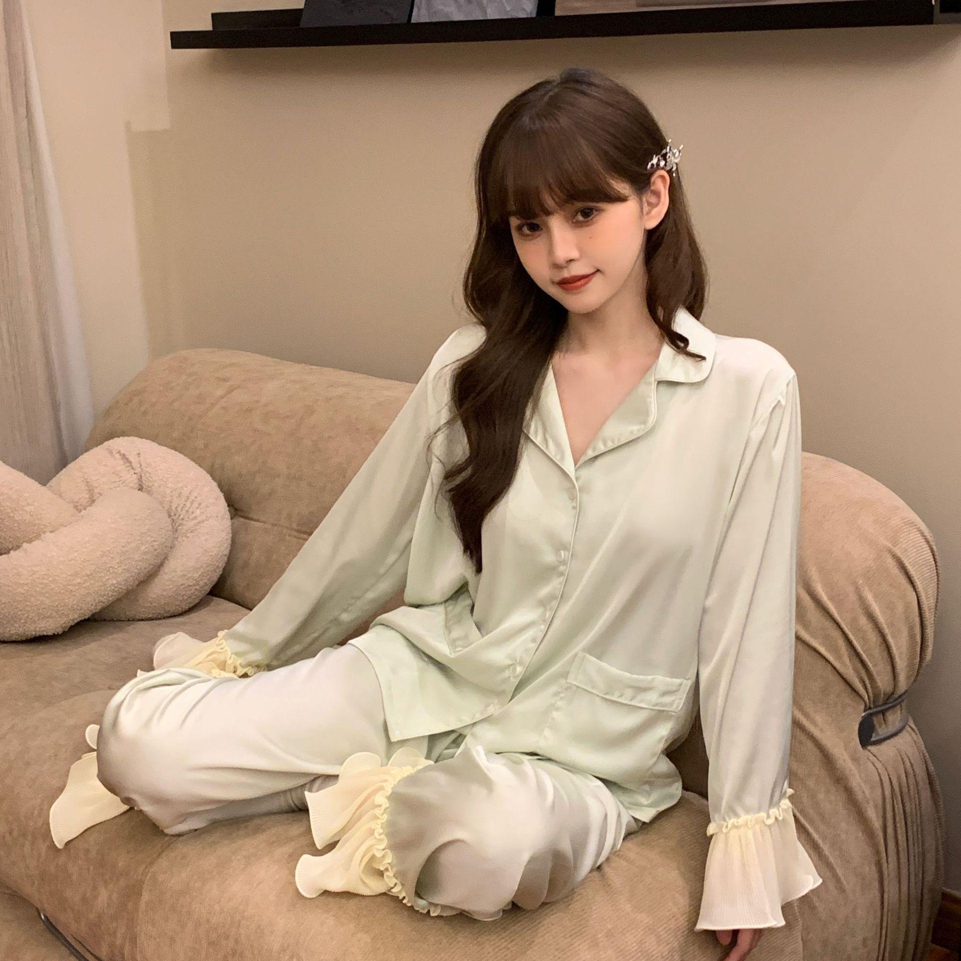Pijamas de seda de hielo para primavera y verano, nuevos pijamas de estilo corte de manga larga con volantes de alta calidad para el hogar, pijamas de estilo dulce para niñas.