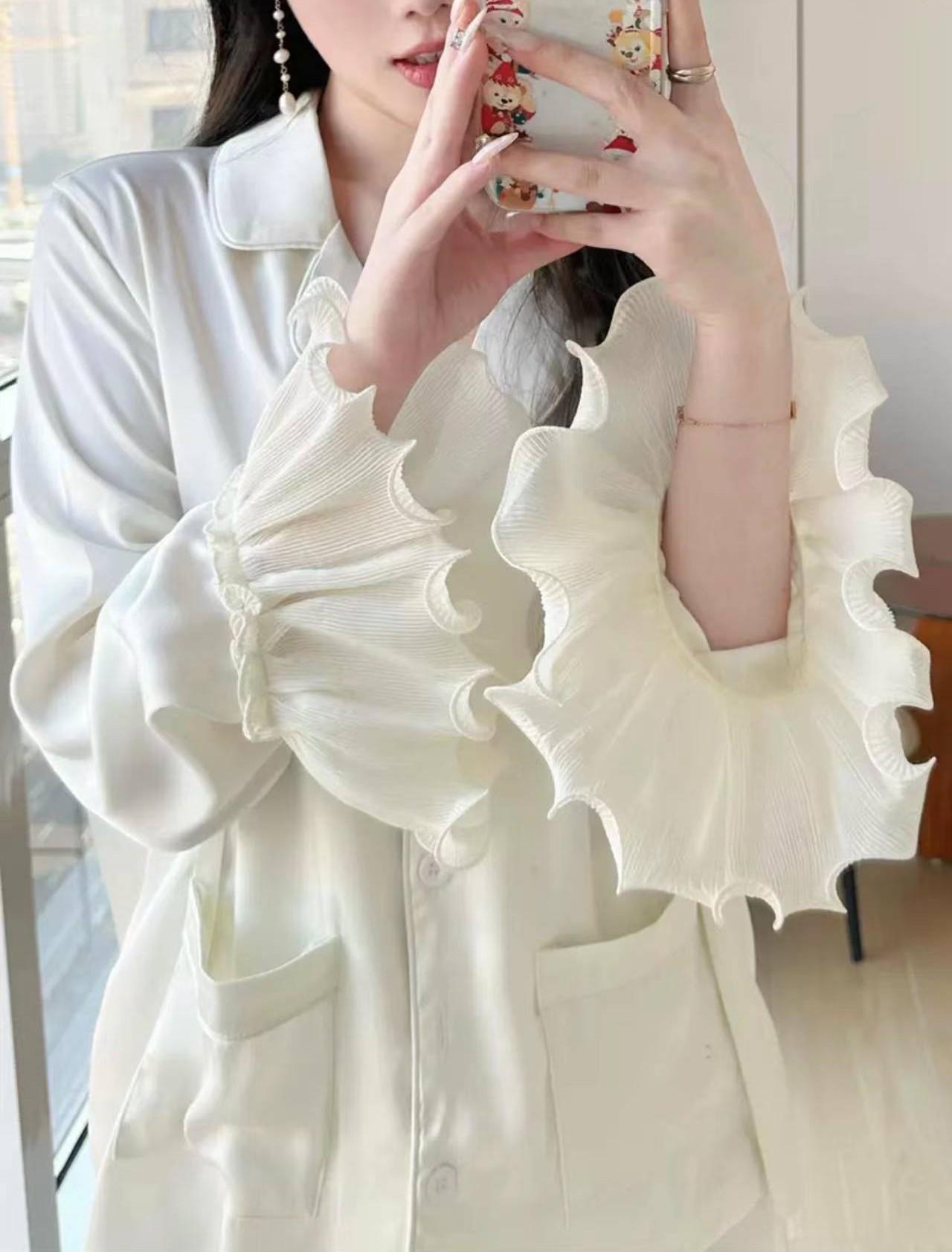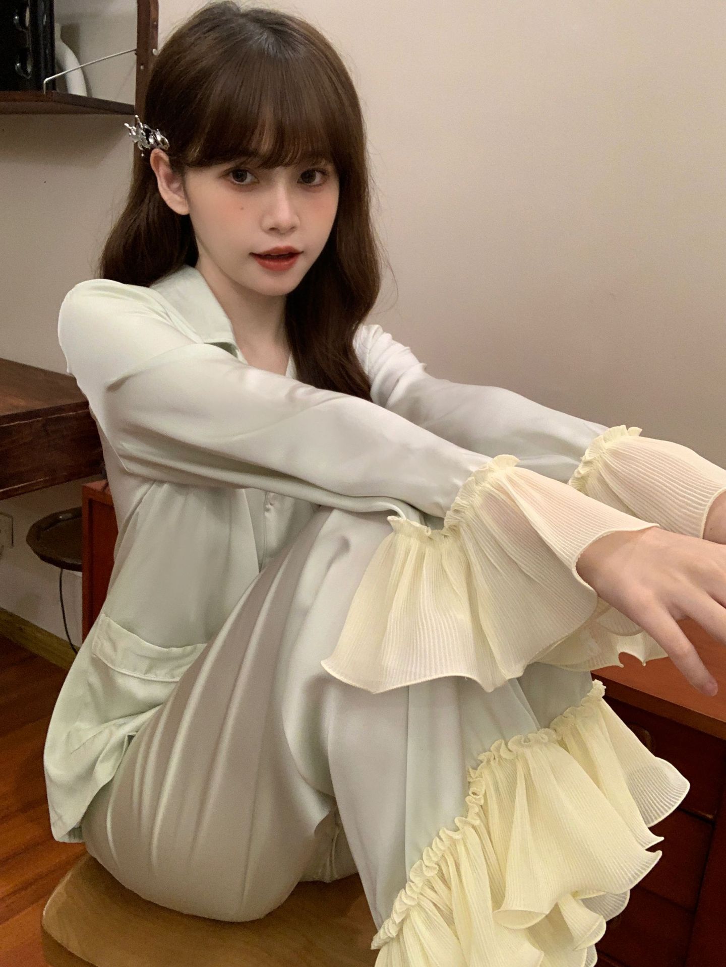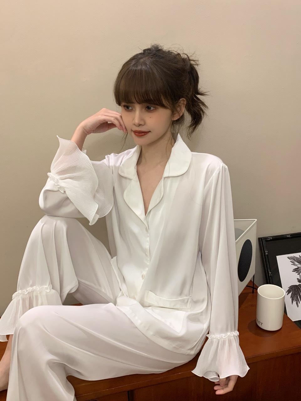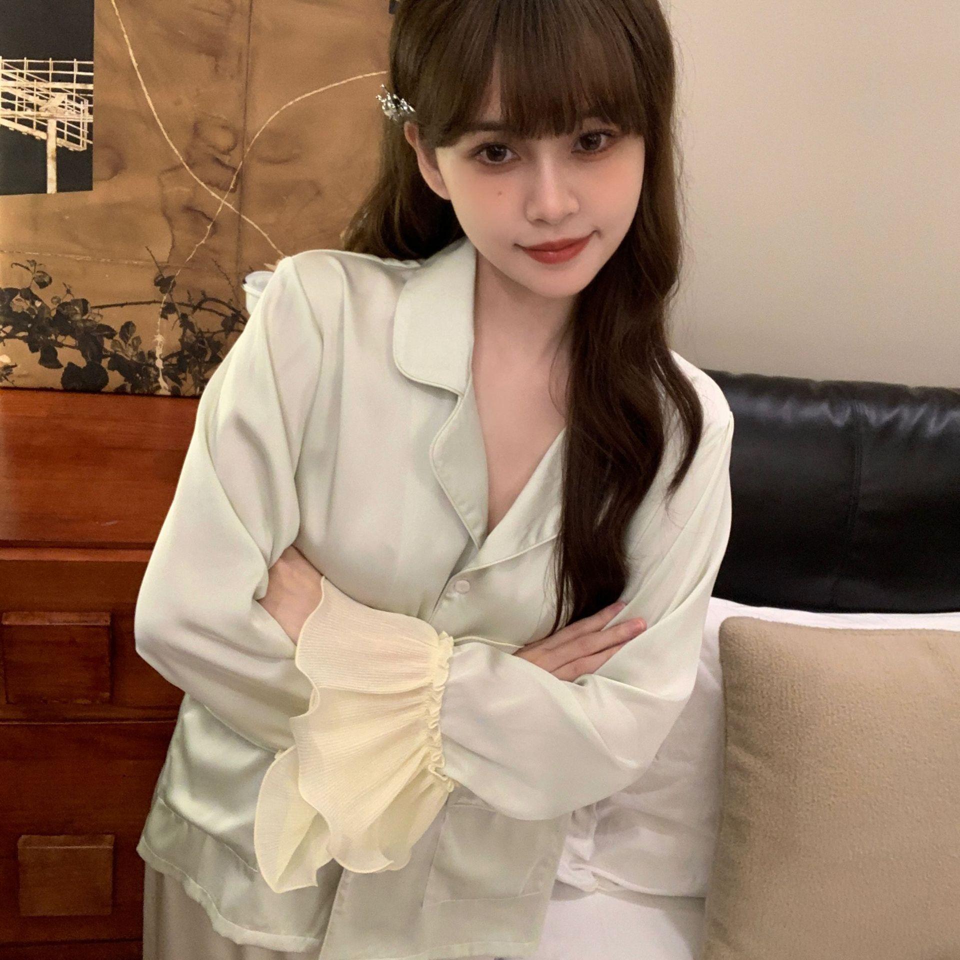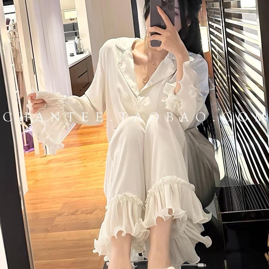 Pijamas de seda de hielo para primavera y verano, nuevos pijamas de estilo corte de manga larga con volantes de alta calidad para el hogar, pijamas de estilo dulce para niñas.