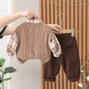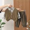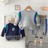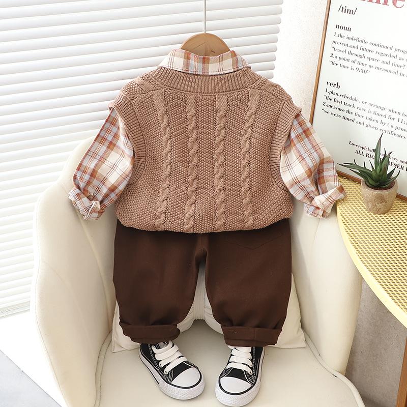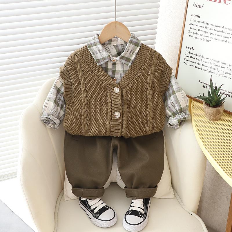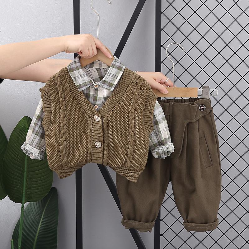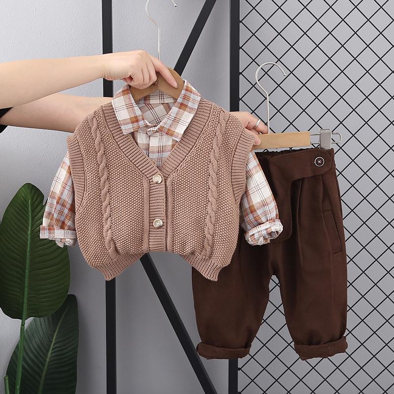 Traje de primavera y otoño para niños, guapo suéter a cuadros de otoño para niños de moda, ropa de tres piezas 2023, ropa para niños al por mayor