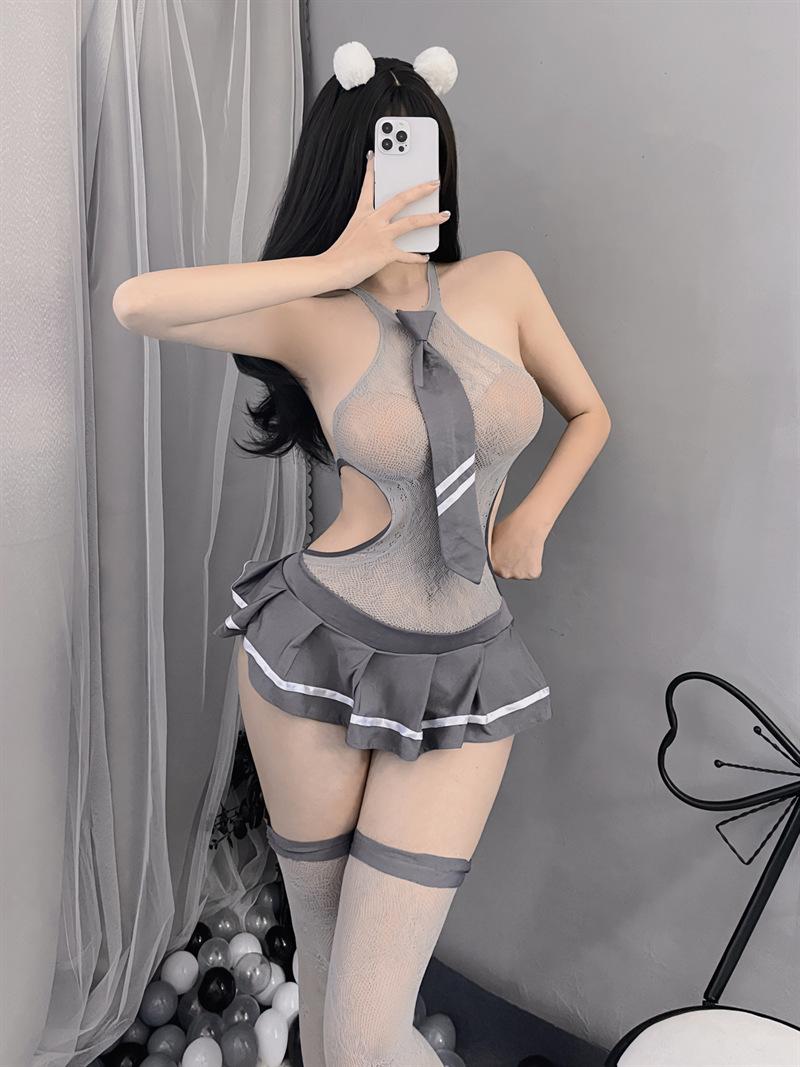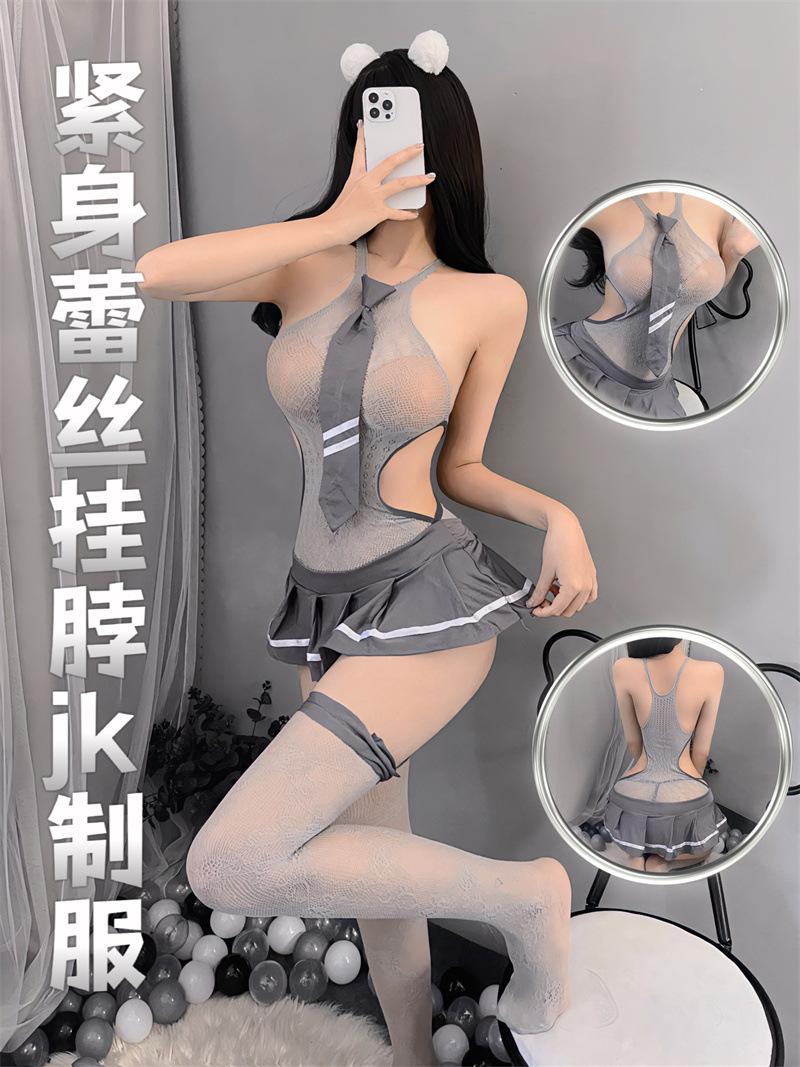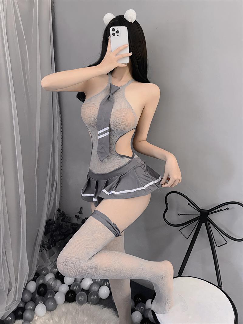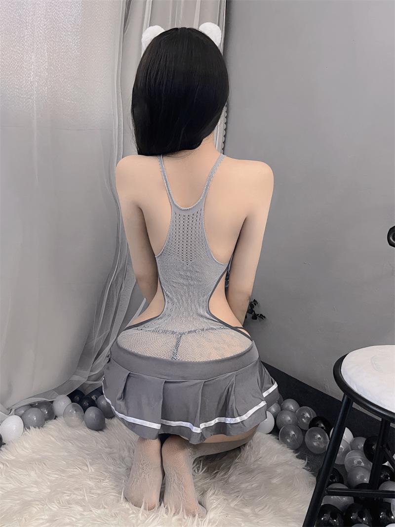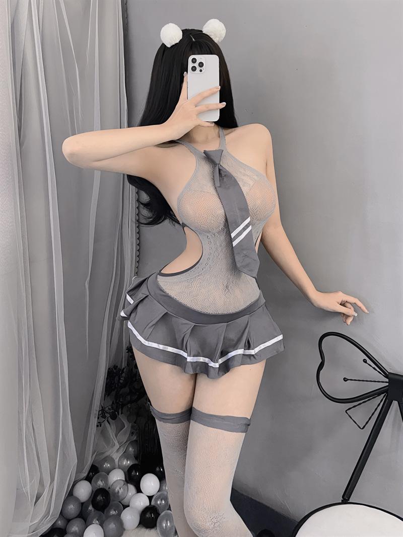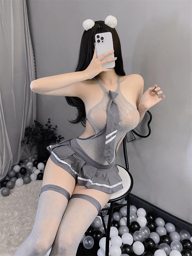 Lencería erótica sexy dulce traje de colegiala cool estudiante uniforme hueco medias tentación vestido de malla de una pieza verano