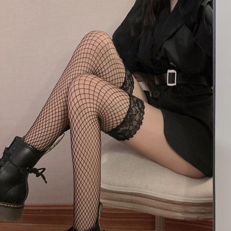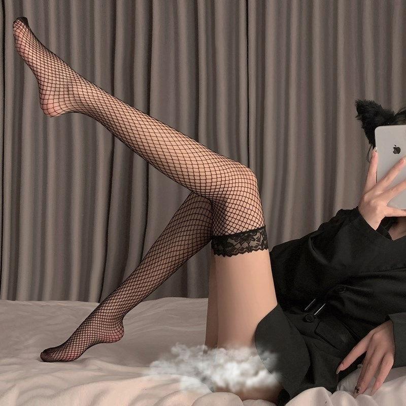 Calcetines largos de encaje por encima de la rodilla, sexys, de malla media, de seda negra, de rejilla, hasta el muslo, para mujer.