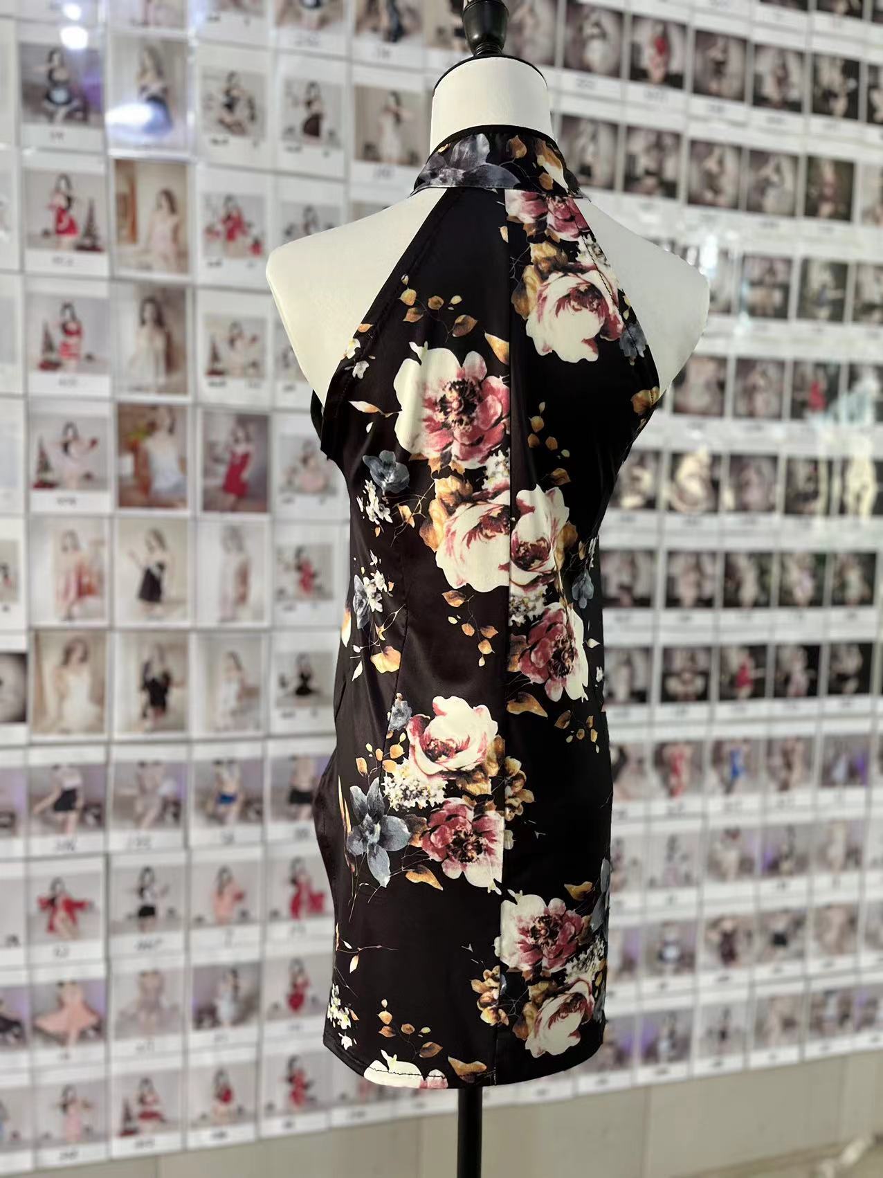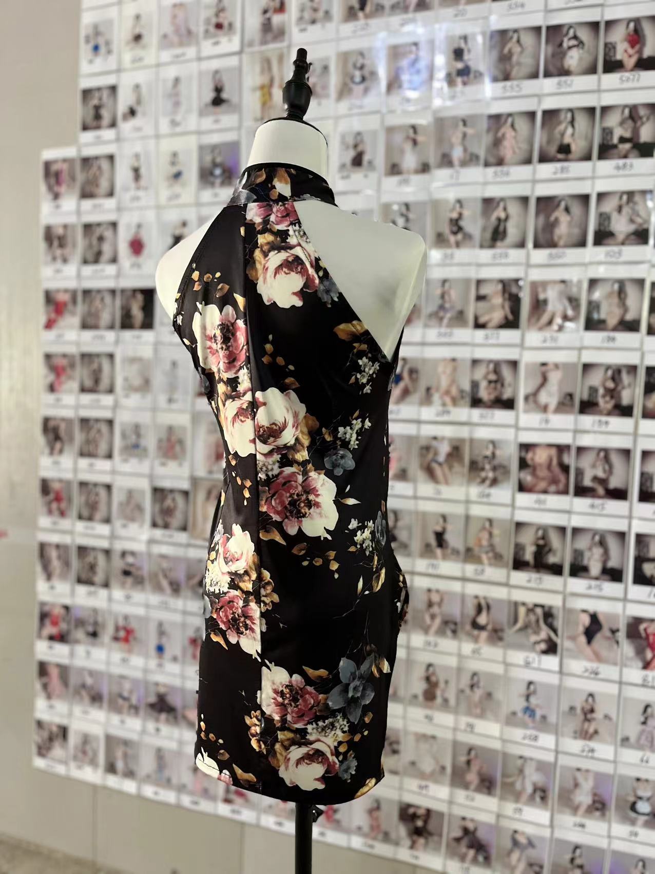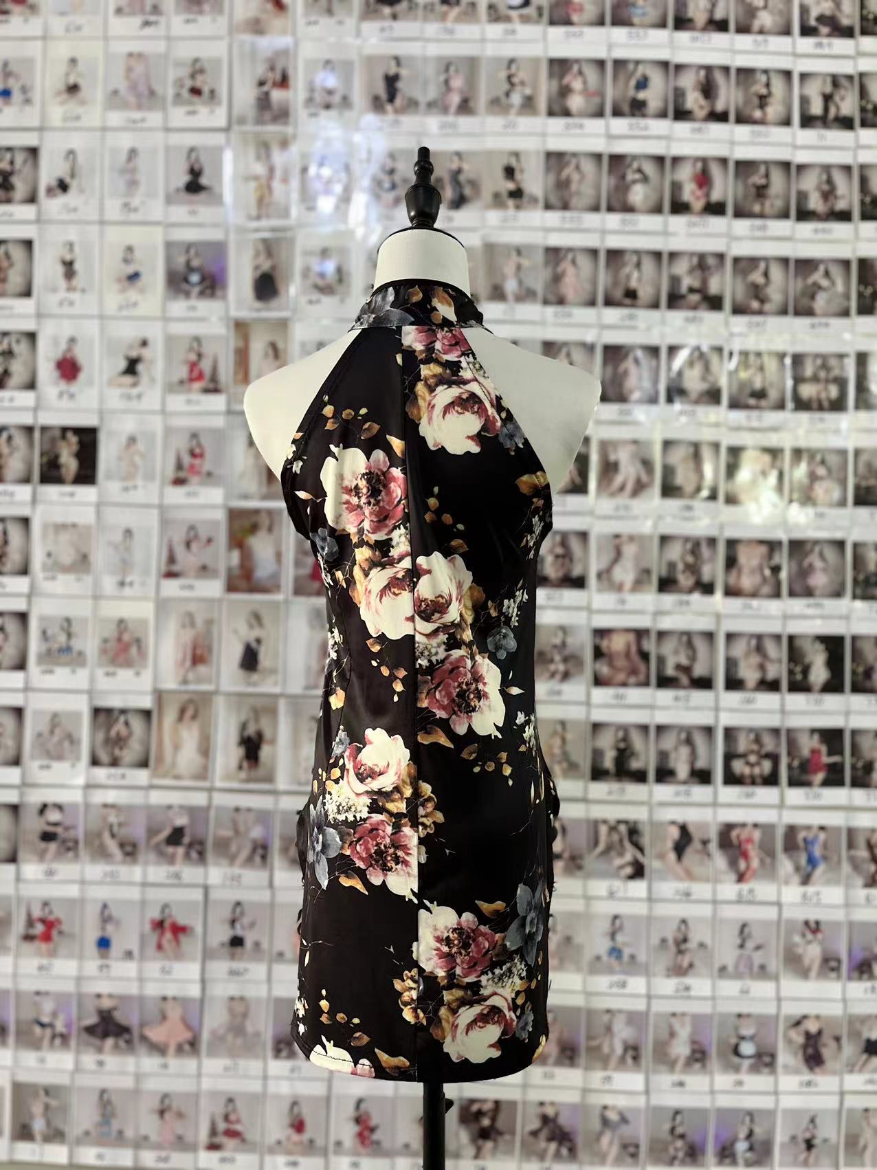 Black printed cheongsam, Black printed cheongsam + black net stockings, Black printed cheongsam + black lace s...
