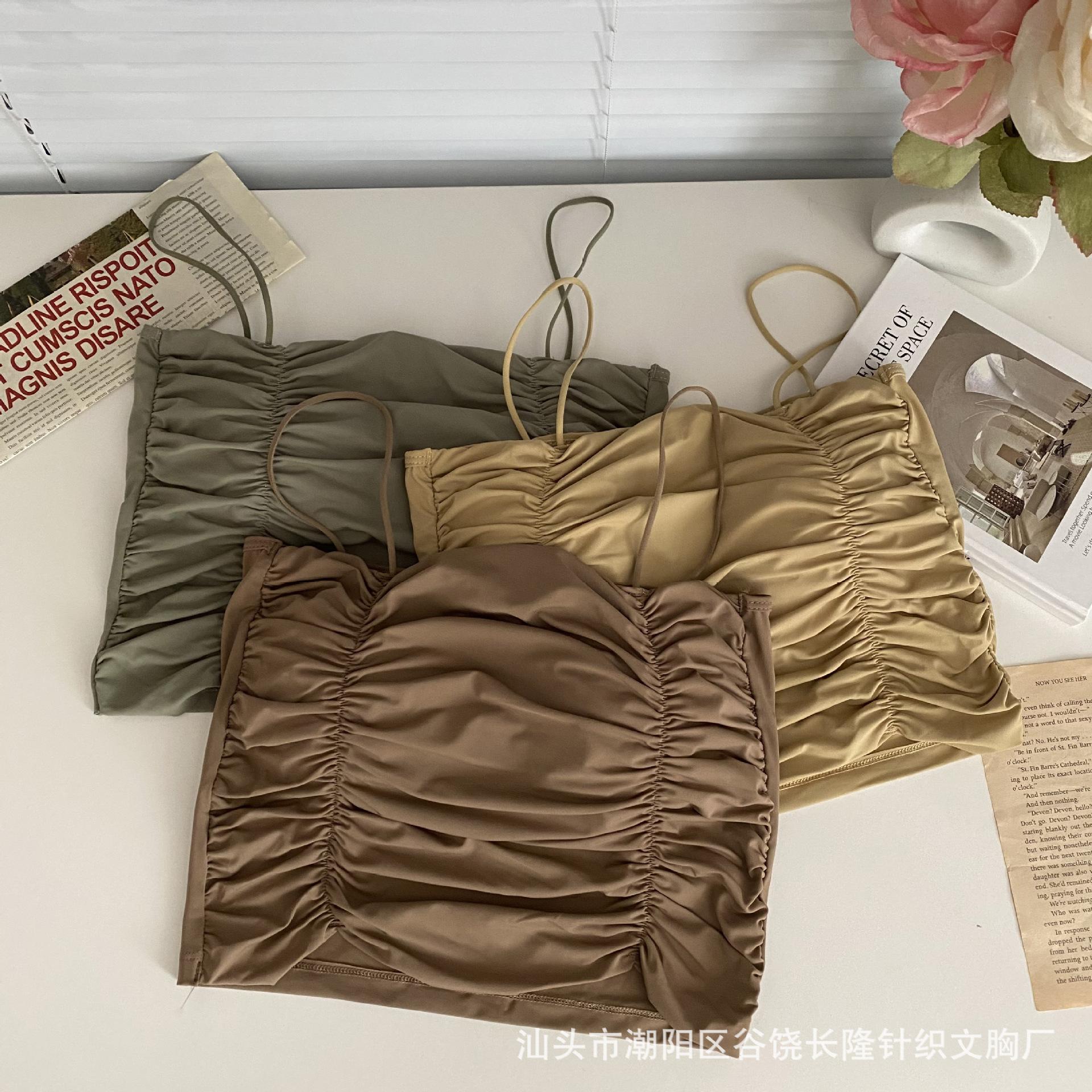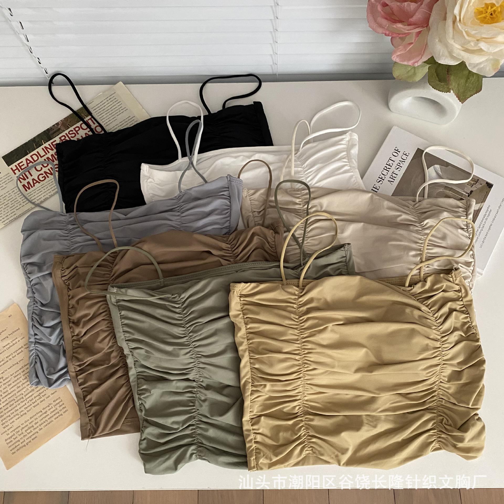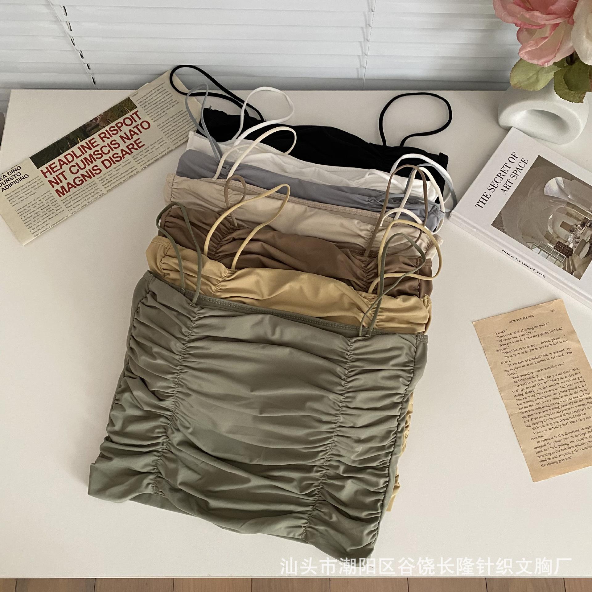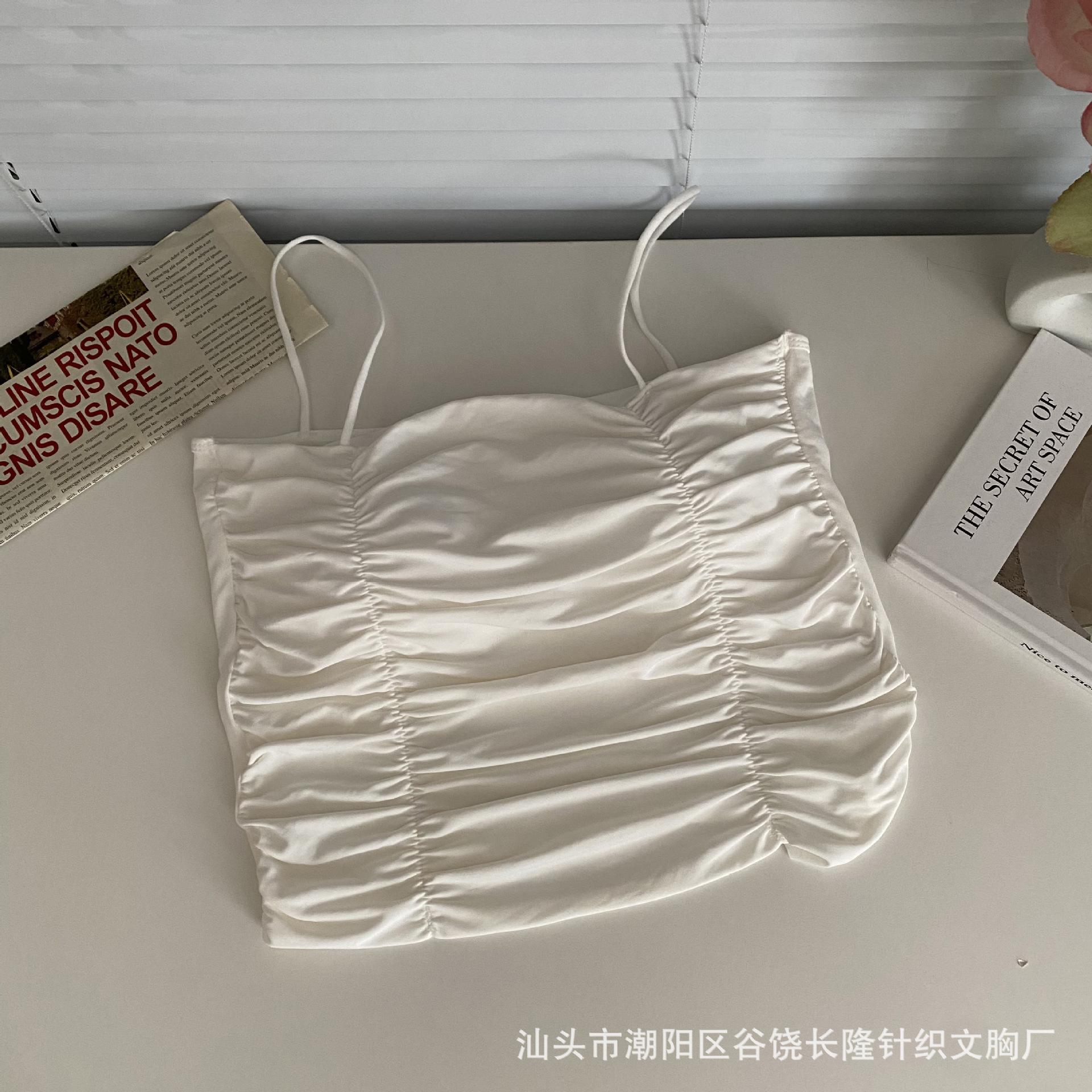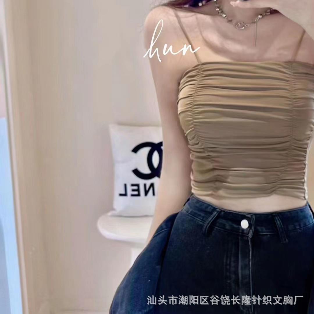 Camiseta de verano con tirantes finos y plisada de seda helada para mujer, elegante, con base interior, ajustada
