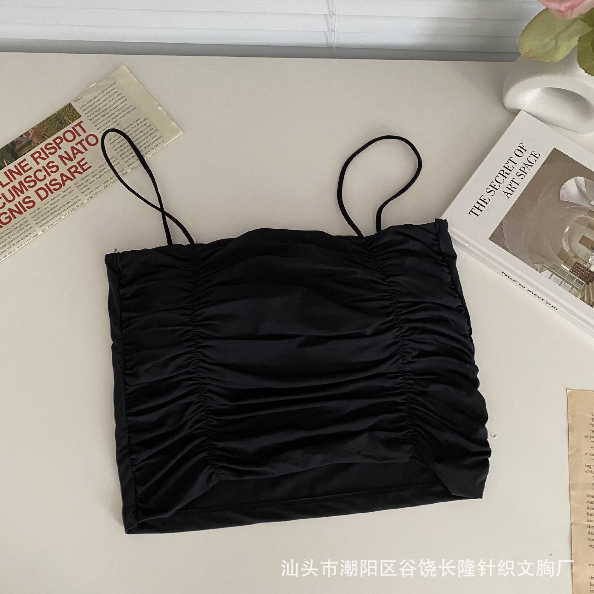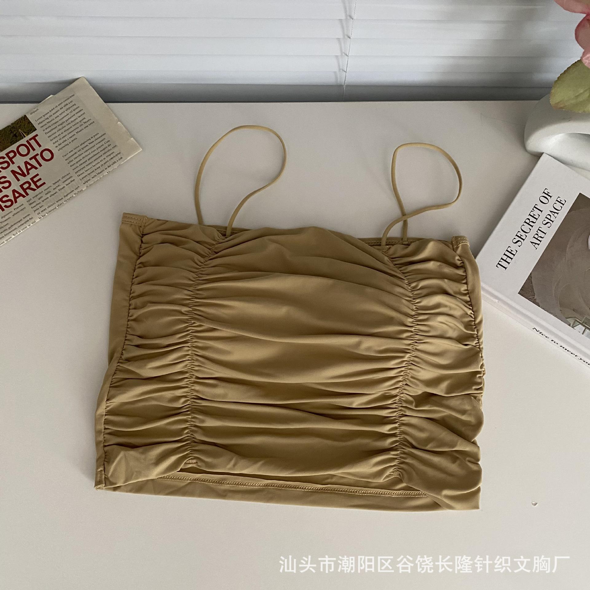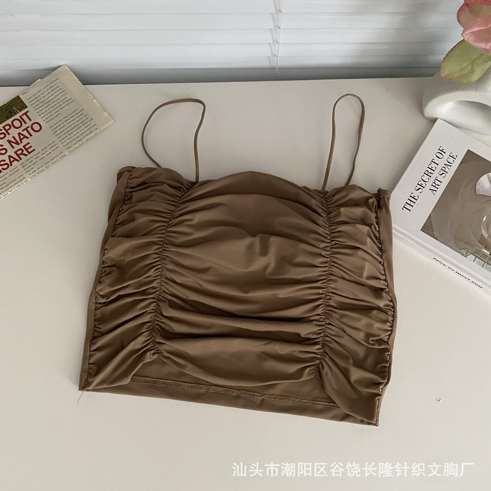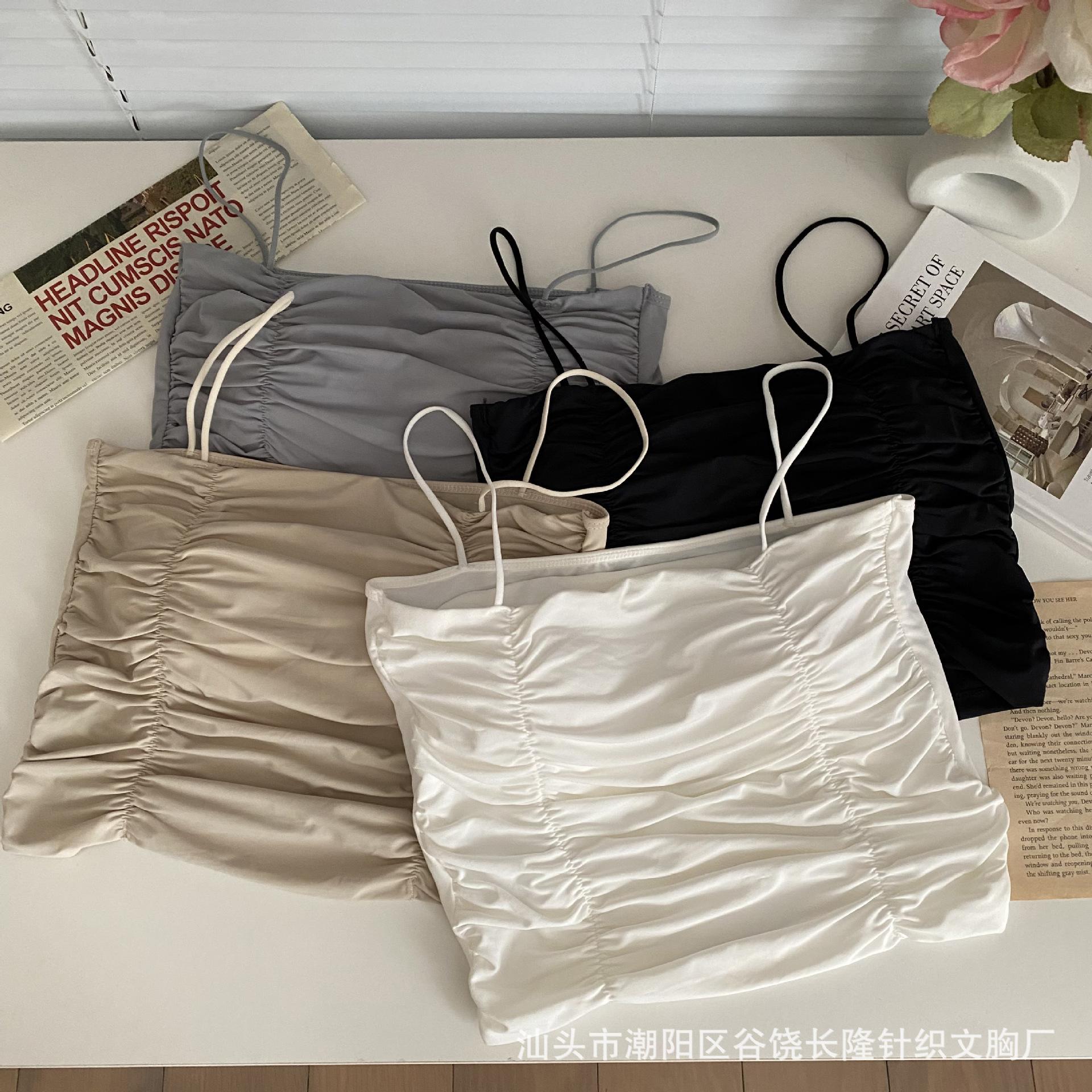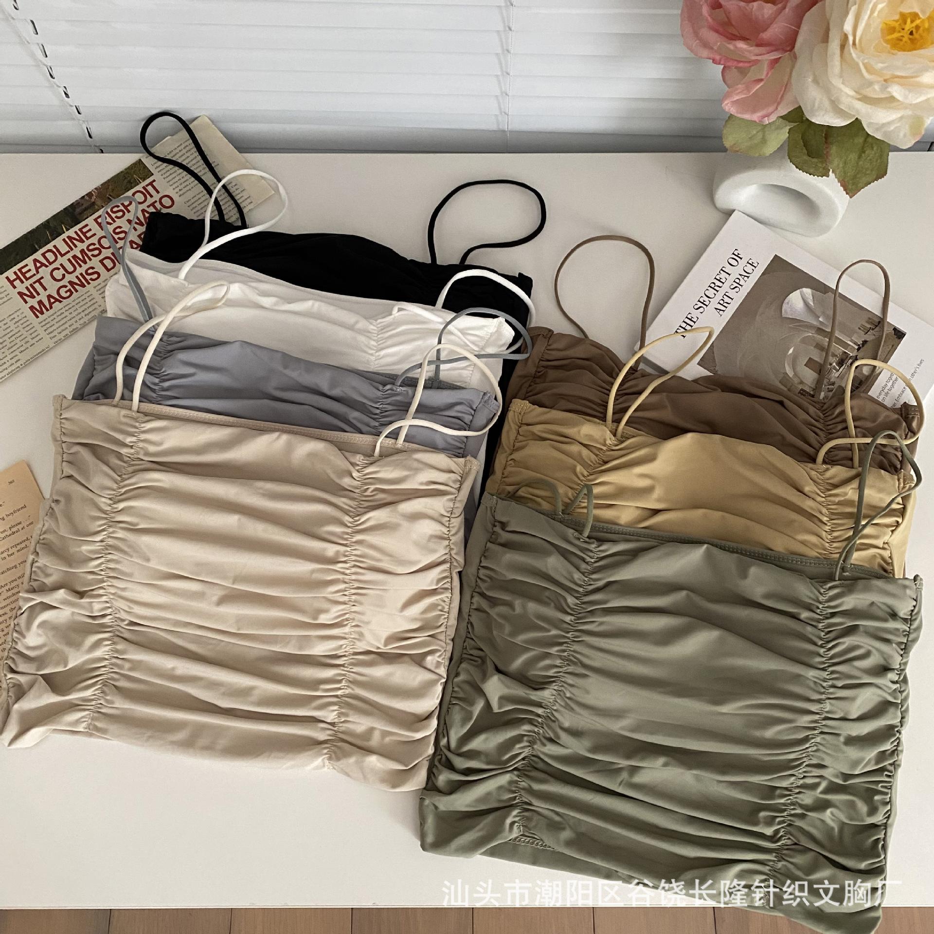 Camiseta de verano con tirantes finos y plisada de seda helada para mujer, elegante, con base interior, ajustada