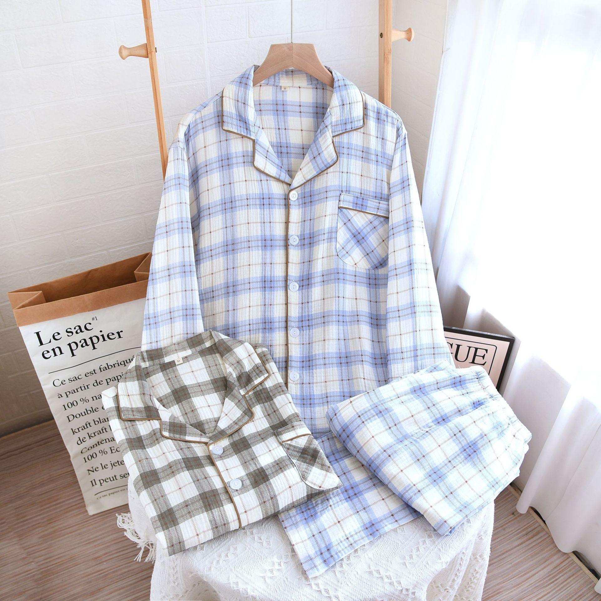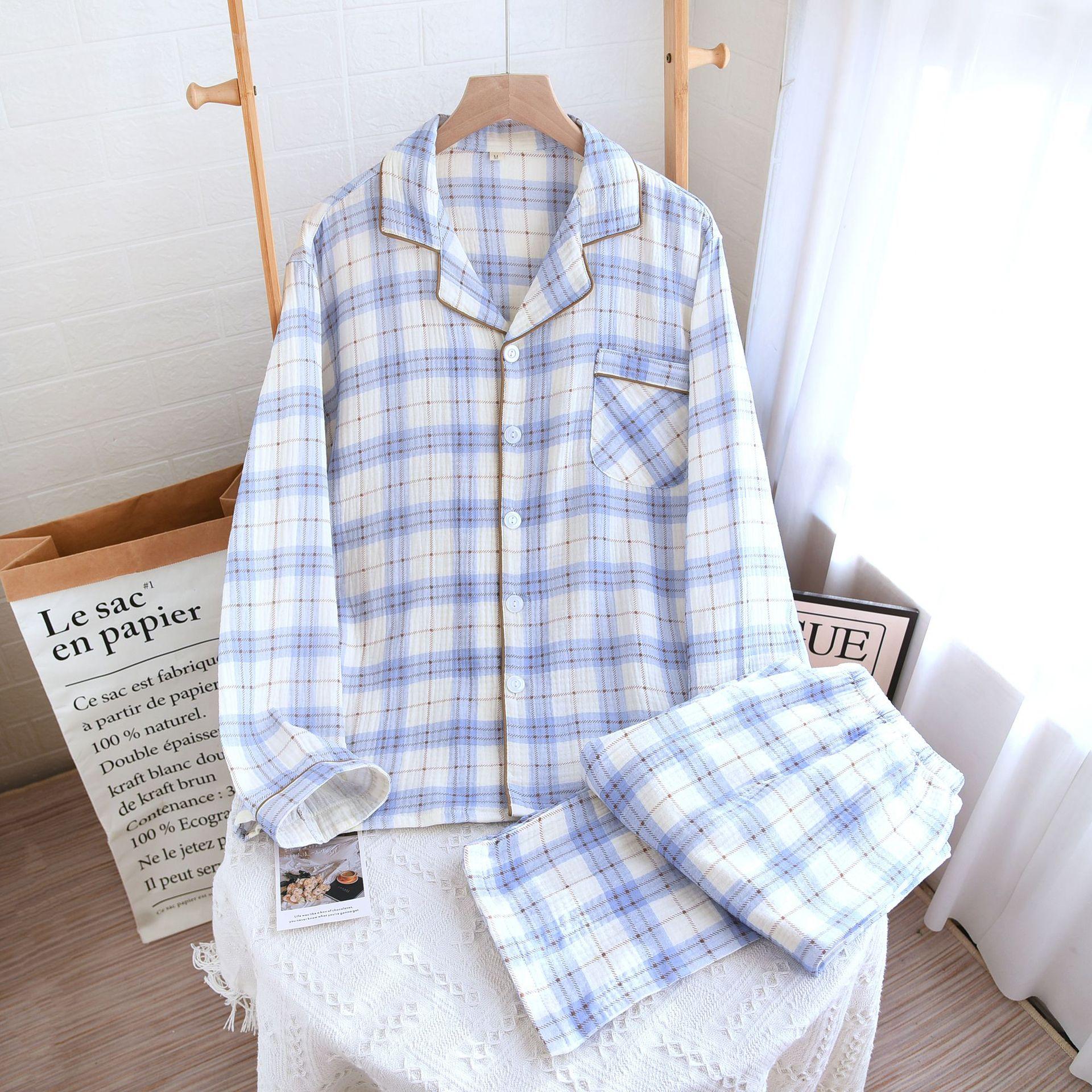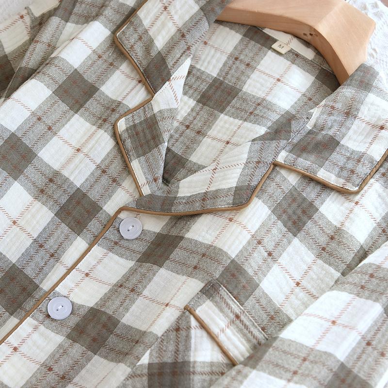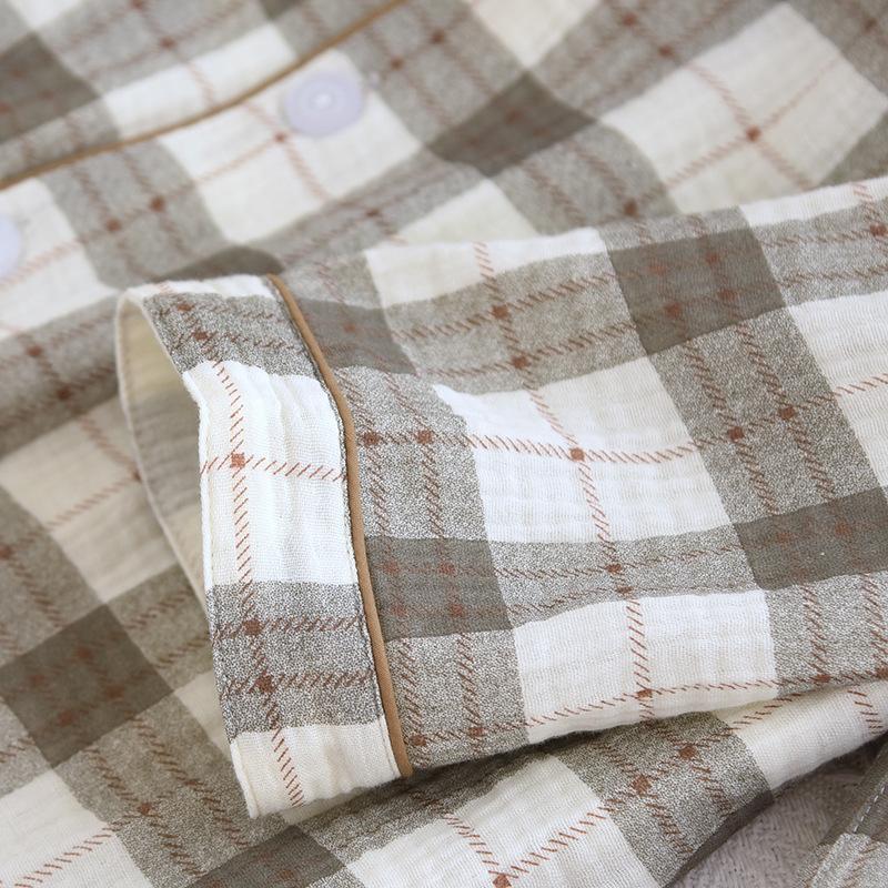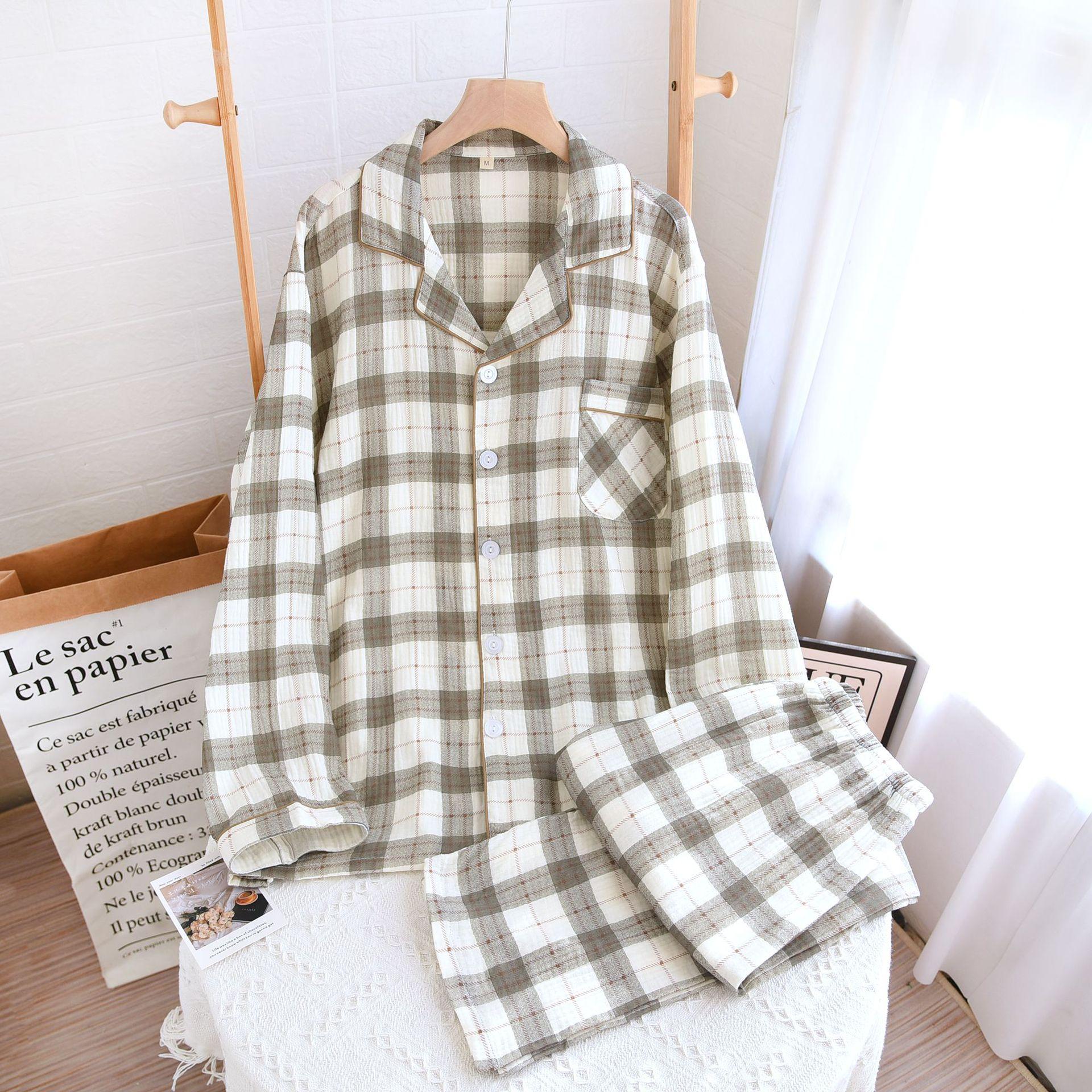 Primavera, Verano y Otoño Cuatro Estaciones Nuevo Traje de Pijama de Cuadros de Crepé para Hombre Hilado de Algodón de Doble Capa Ropa para el Hogar Casual y Sencilla
