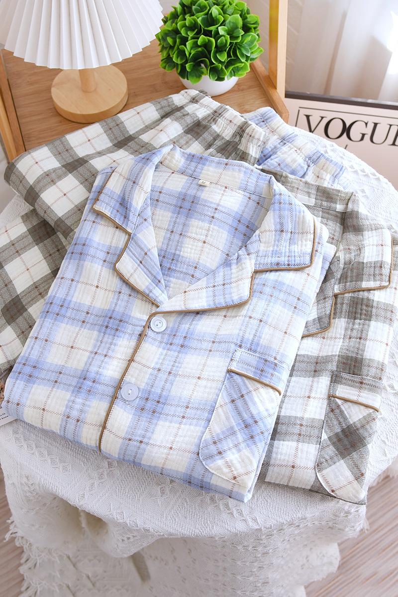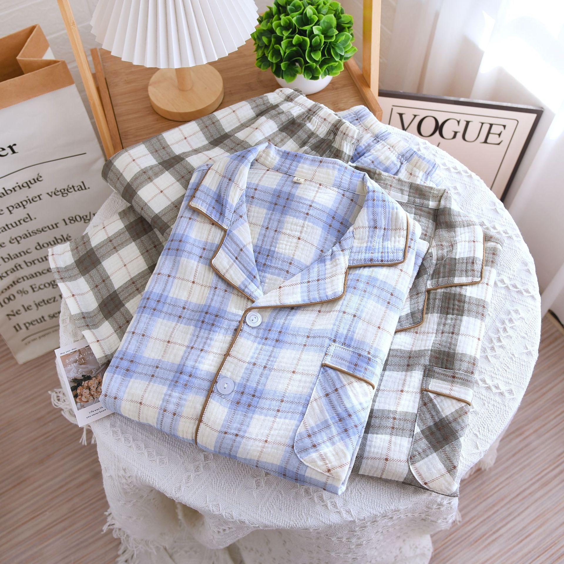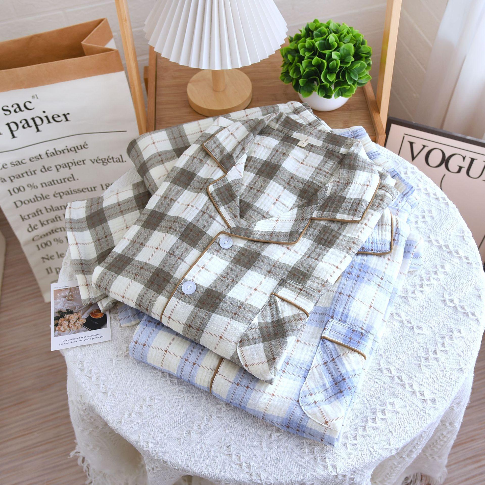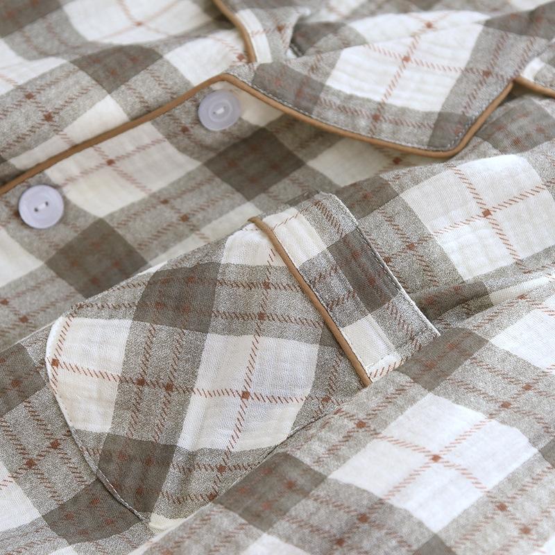 Primavera, Verano y Otoño Cuatro Estaciones Nuevo Traje de Pijama de Cuadros de Crepé para Hombre Hilado de Algodón de Doble Capa Ropa para el Hogar Casual y Sencilla
