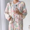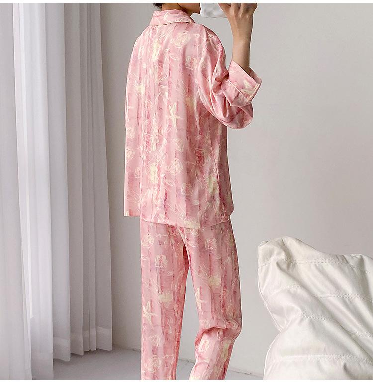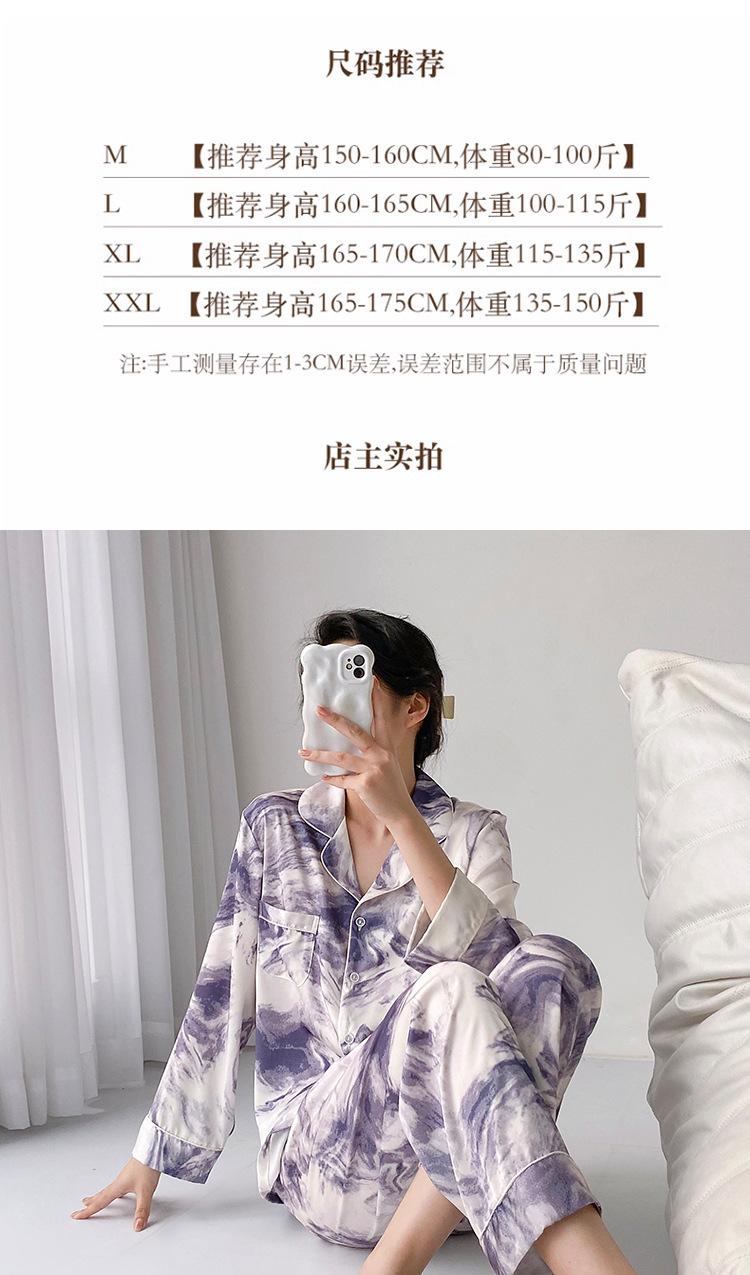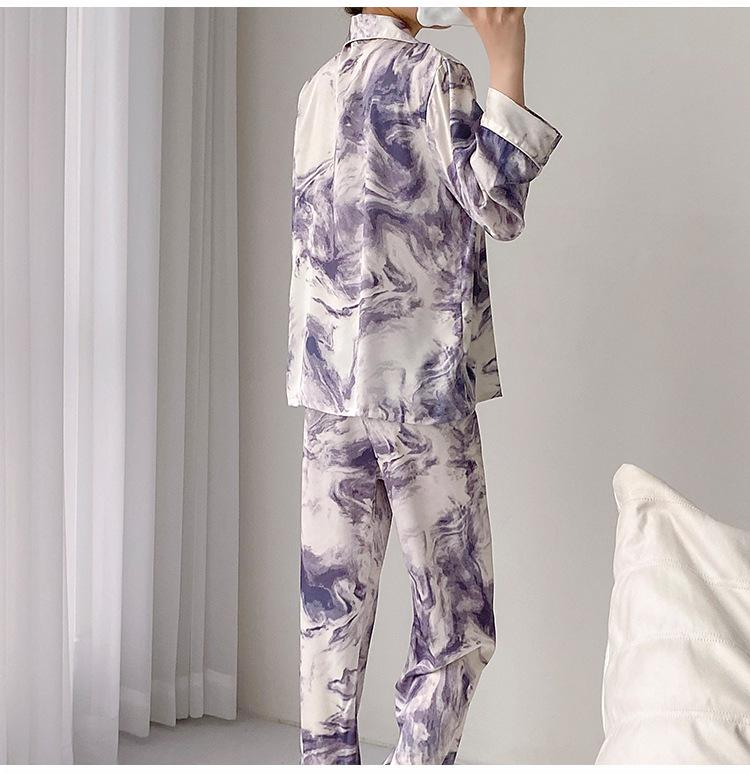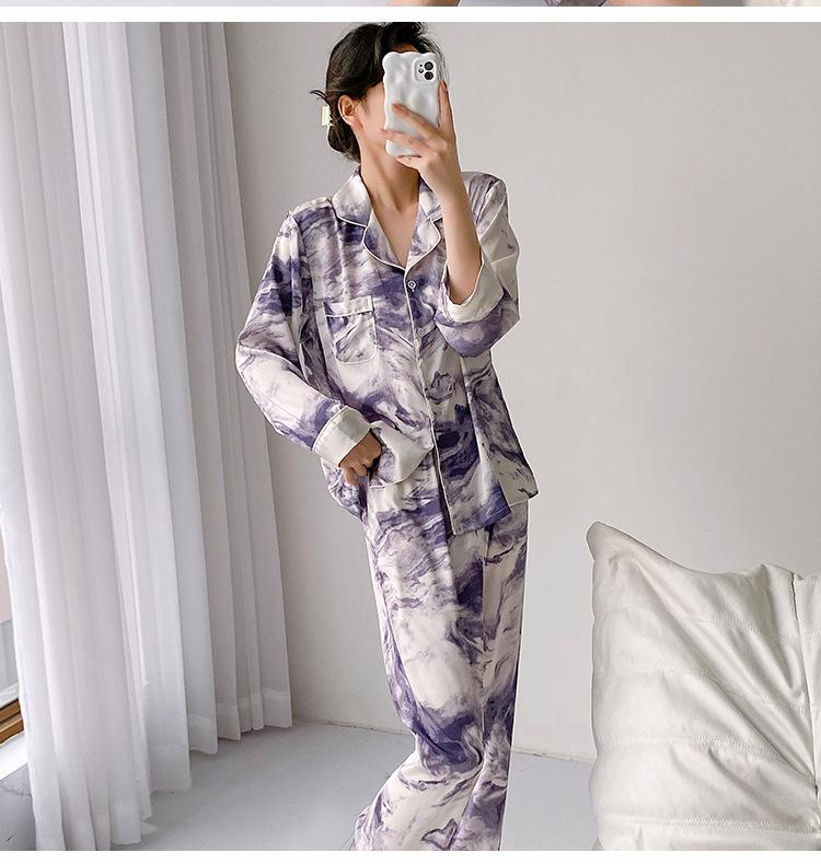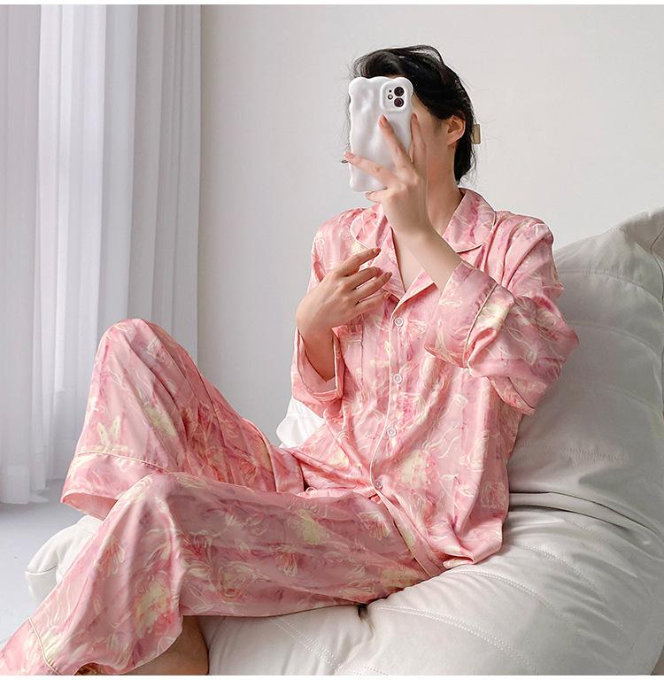 Pijama de mujer de primavera y otoño de seda de hielo, pantalones de manga larga de dos piezas, traje de casa estampado con solapa de seda de hielo fina que se puede usar al aire libre