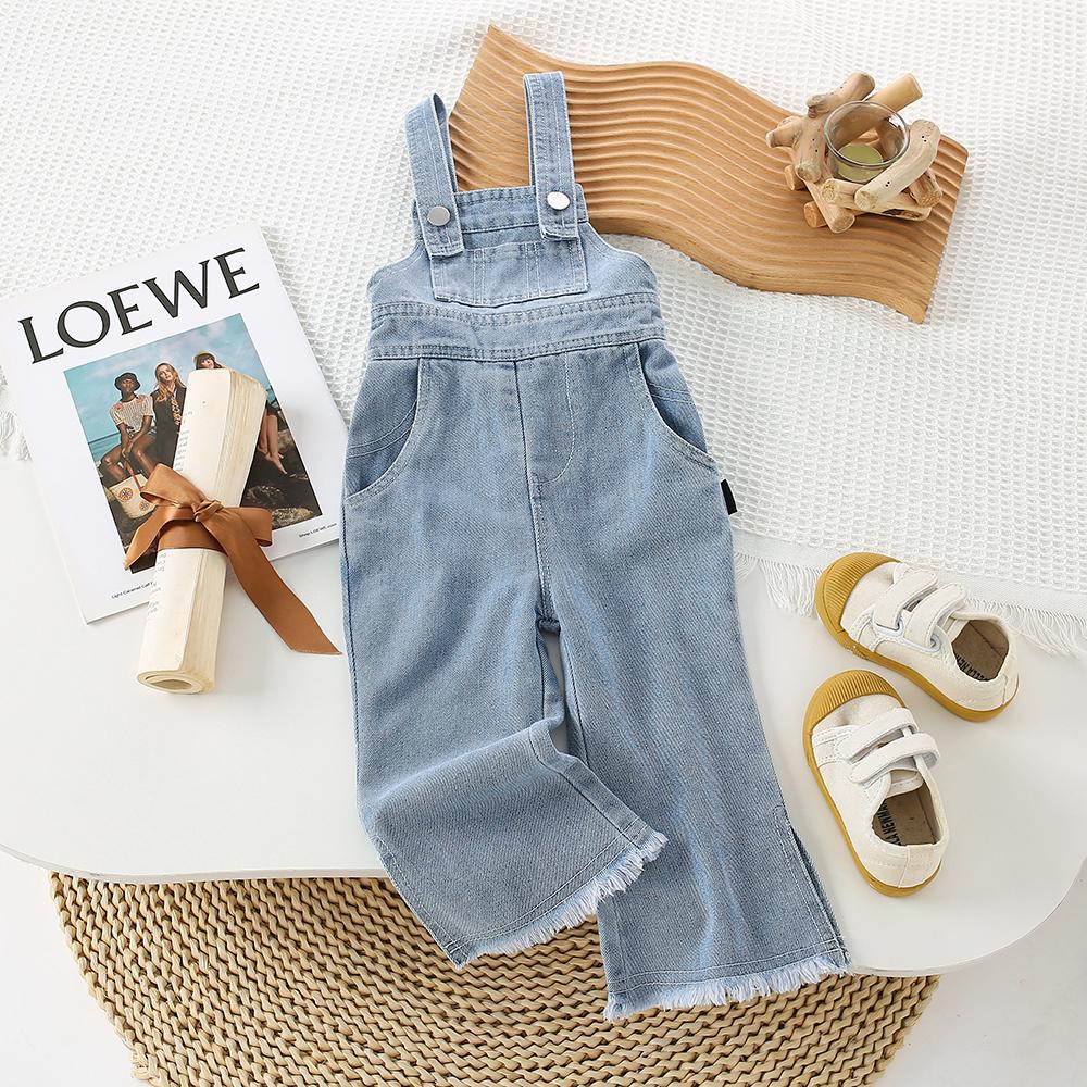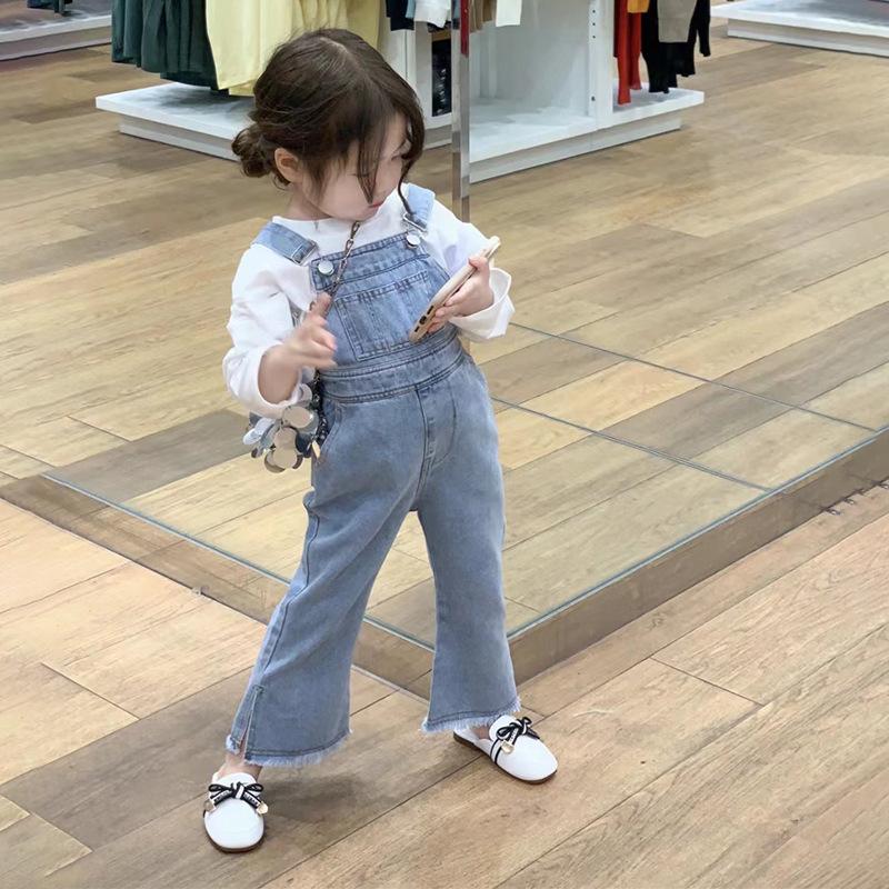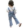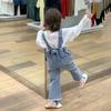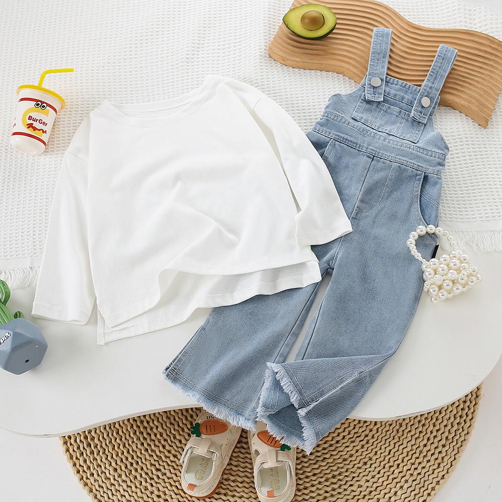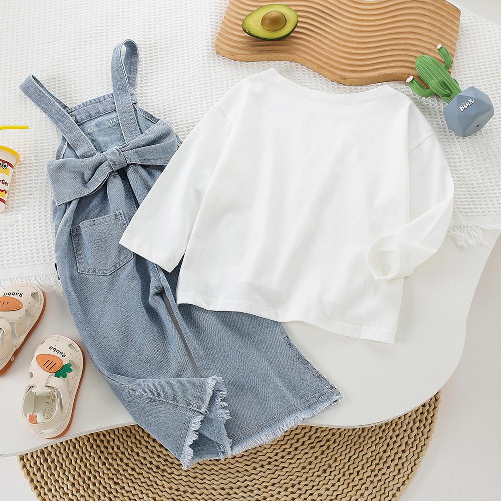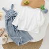 Traje de niña, primavera 2023, nuevo, para niños, pantalones vaqueros con tirantes, camiseta blanca, traje de estilo occidental de moda, estilo coreano