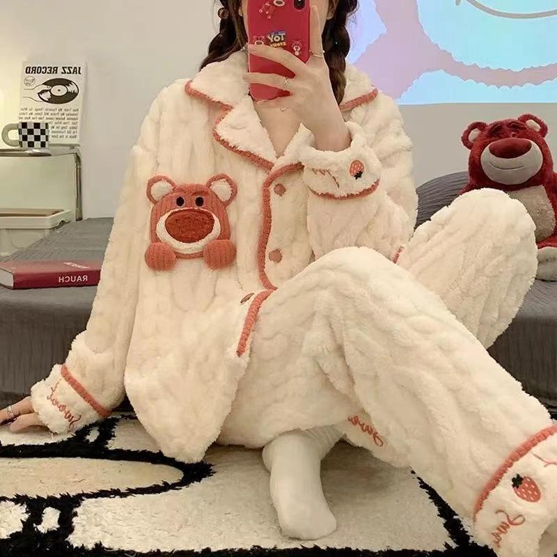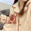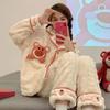 Compra Pijama de invierno para mujer cárdigan felpa fresa oso bordado pantalones de manga larga traje cálido para estar en casa se puede usar afuera al por mayor en Joom.pro