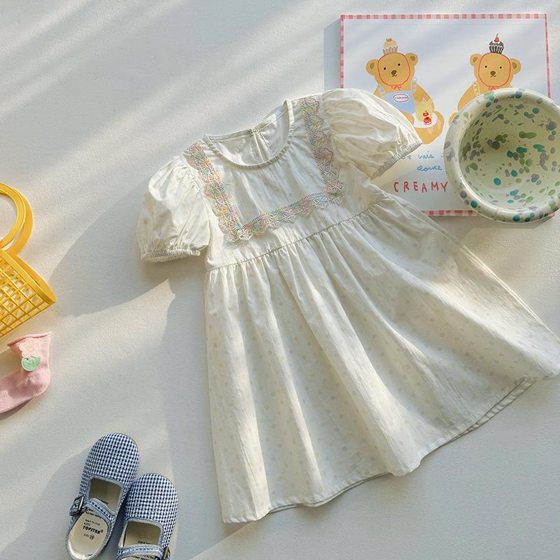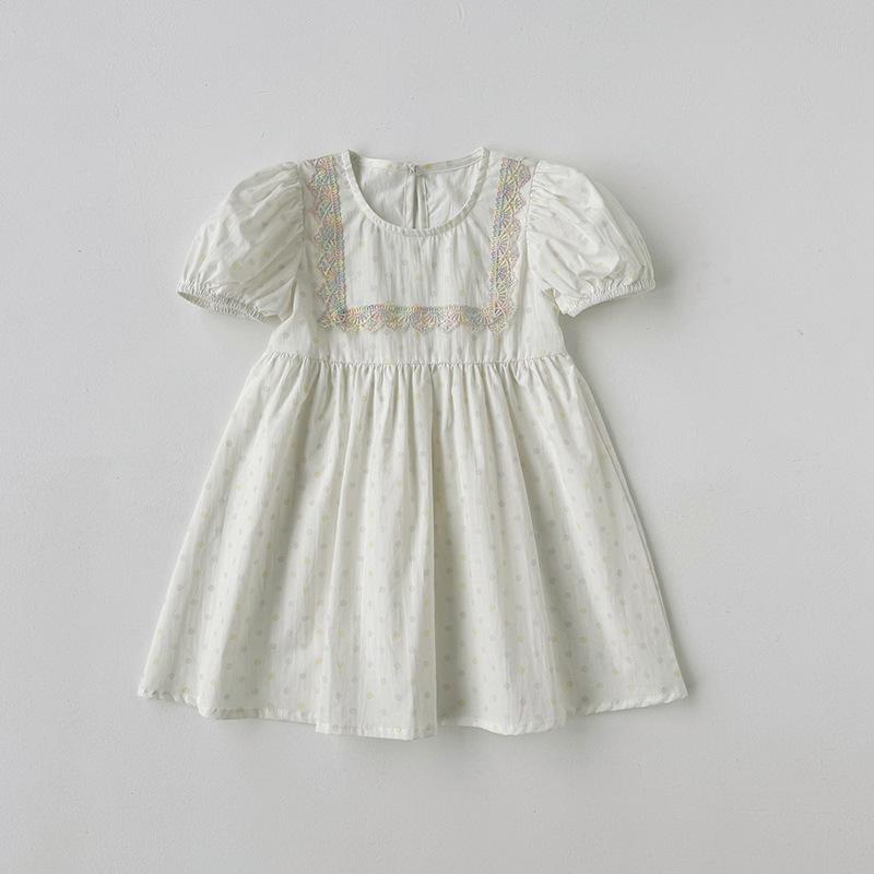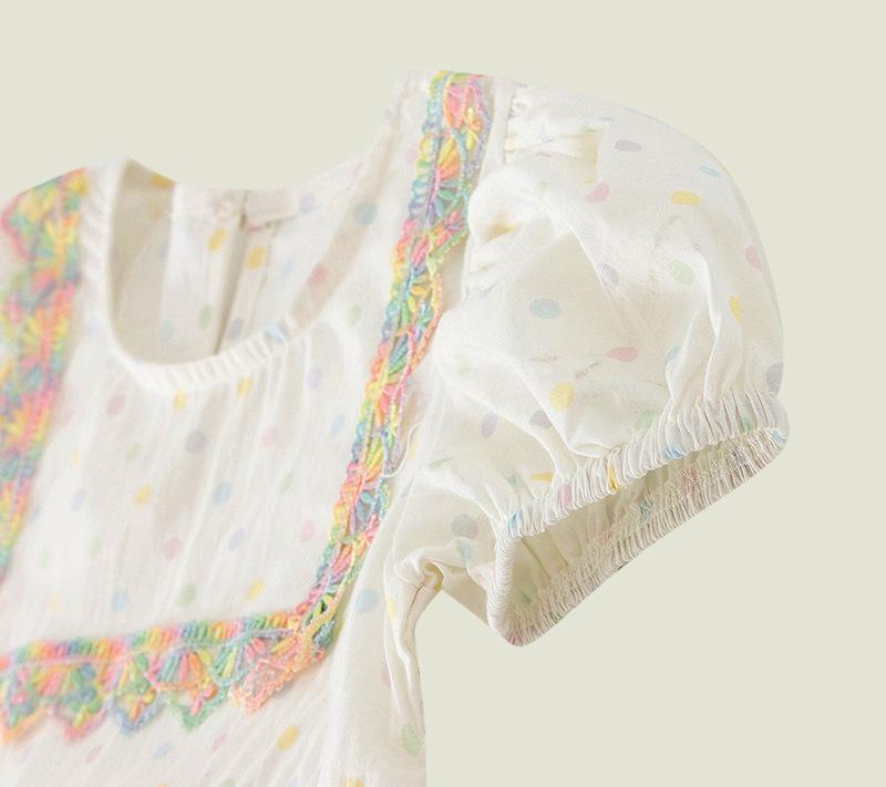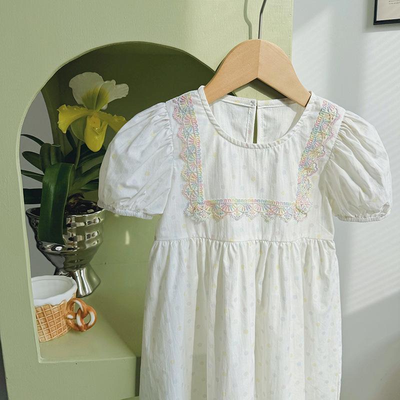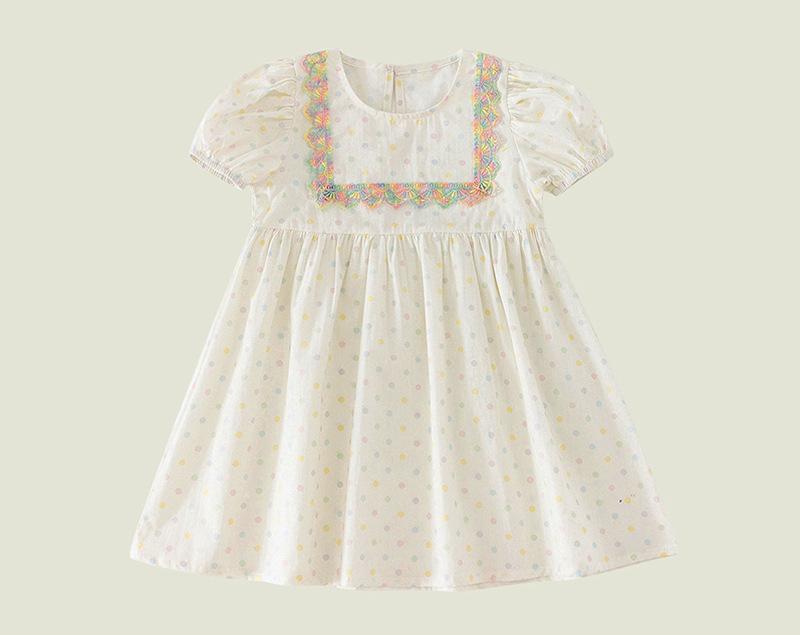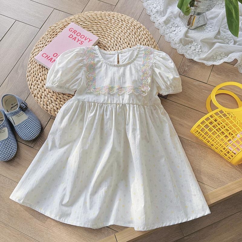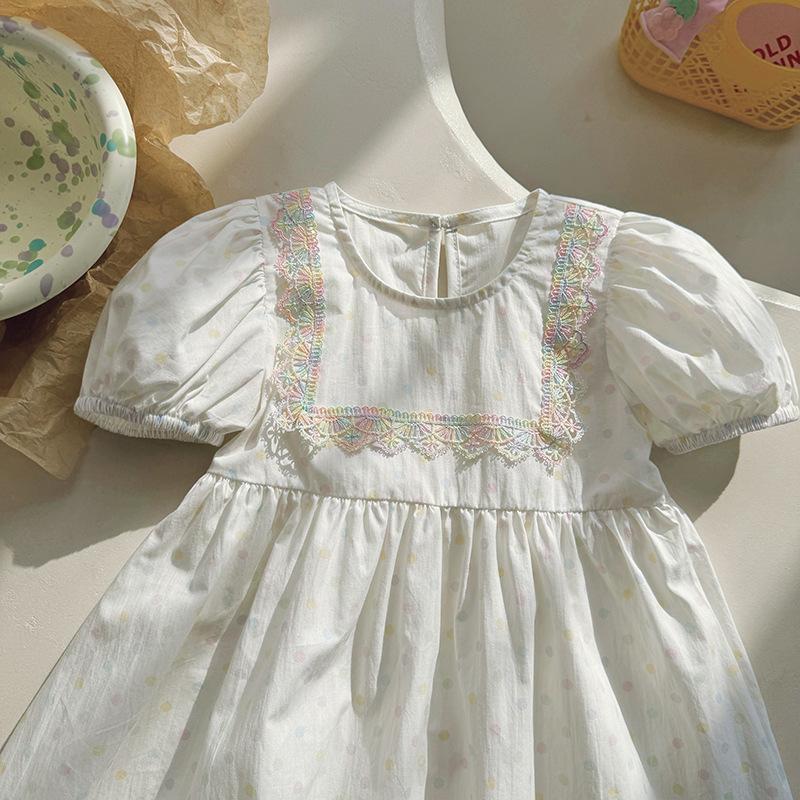 Verano 2025 Nuevo Vestido de Niña de Manga Abullonada con Lunares de Color Cuello Cuadrado Manga Corta Encaje Vestido de Princesa para Niños