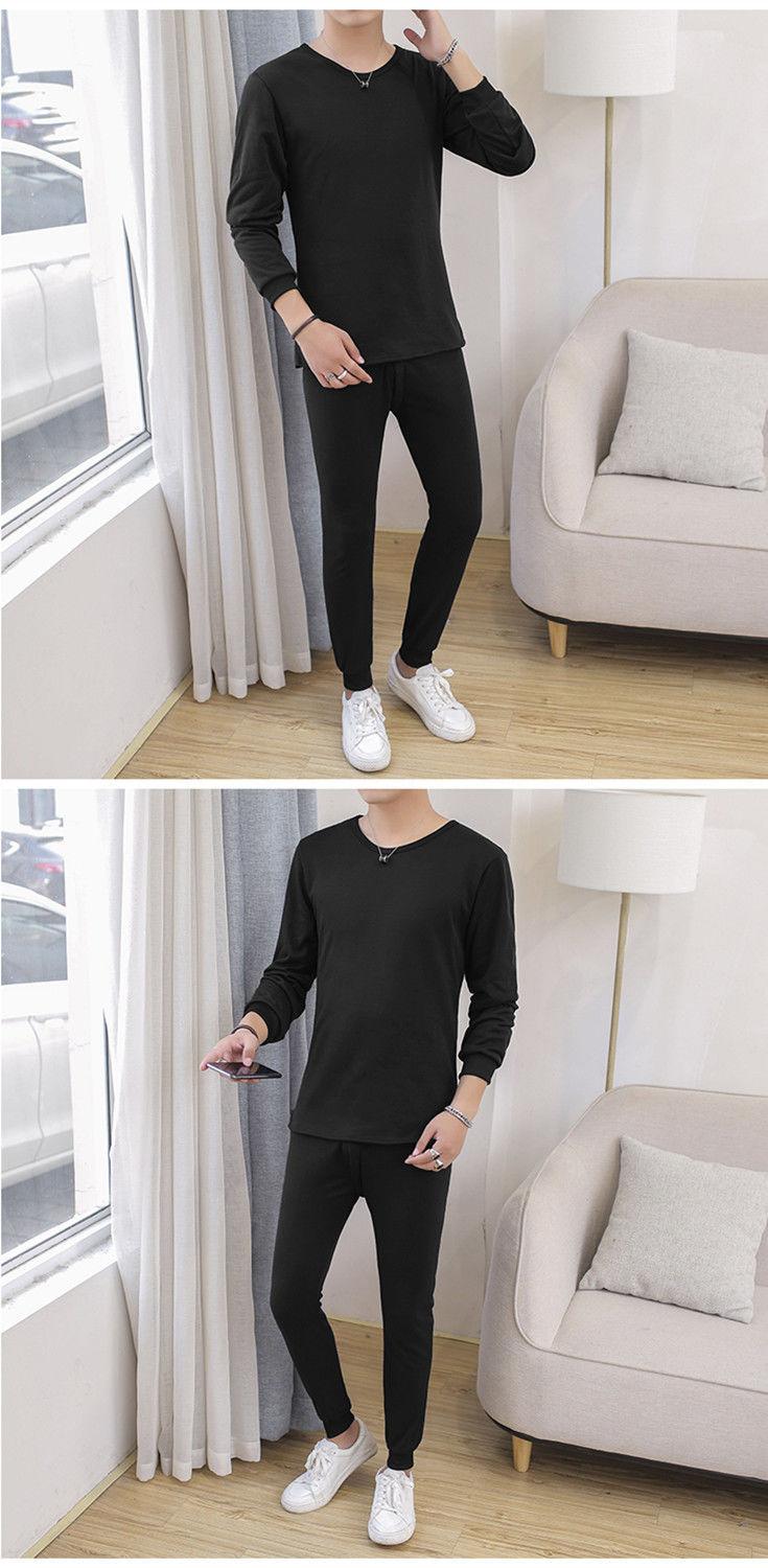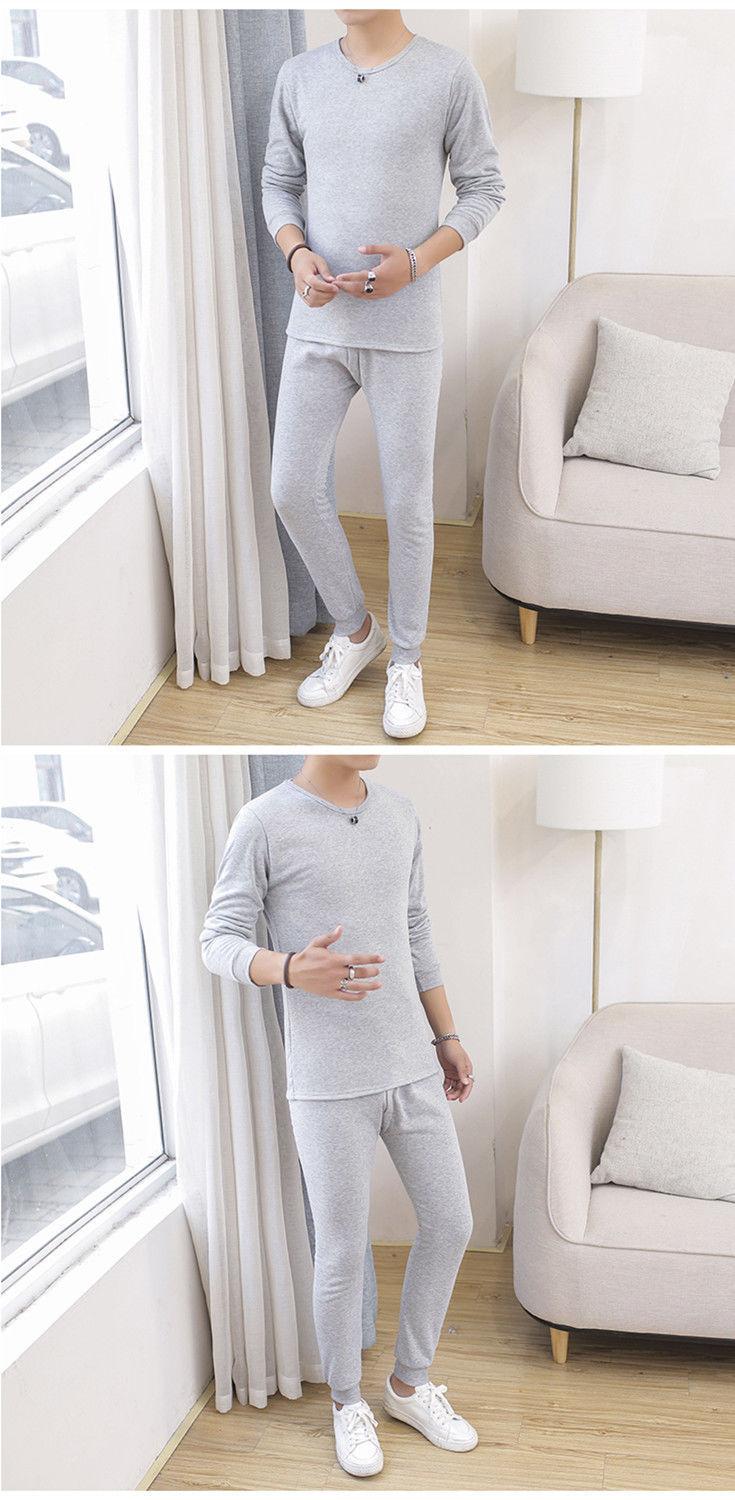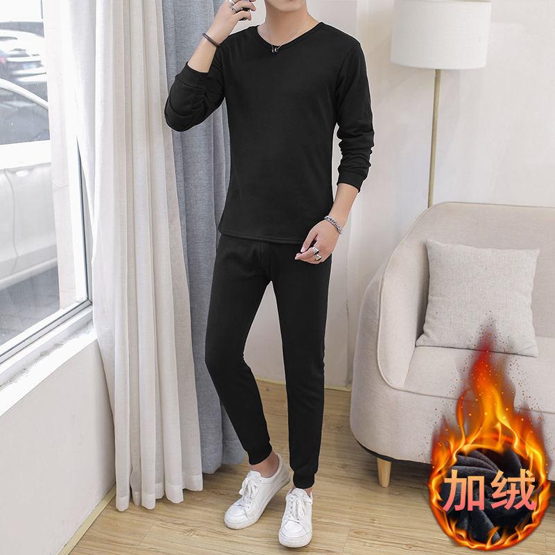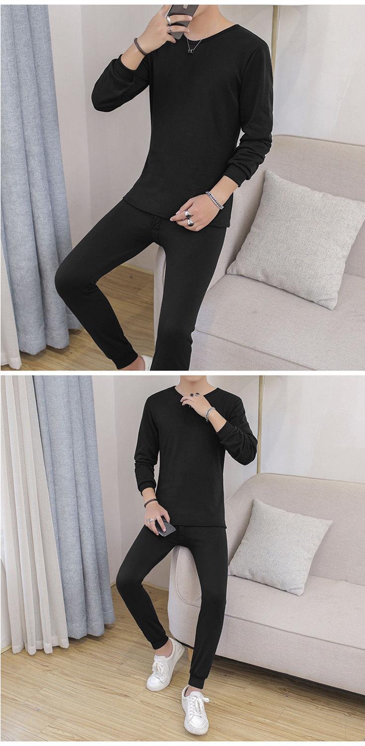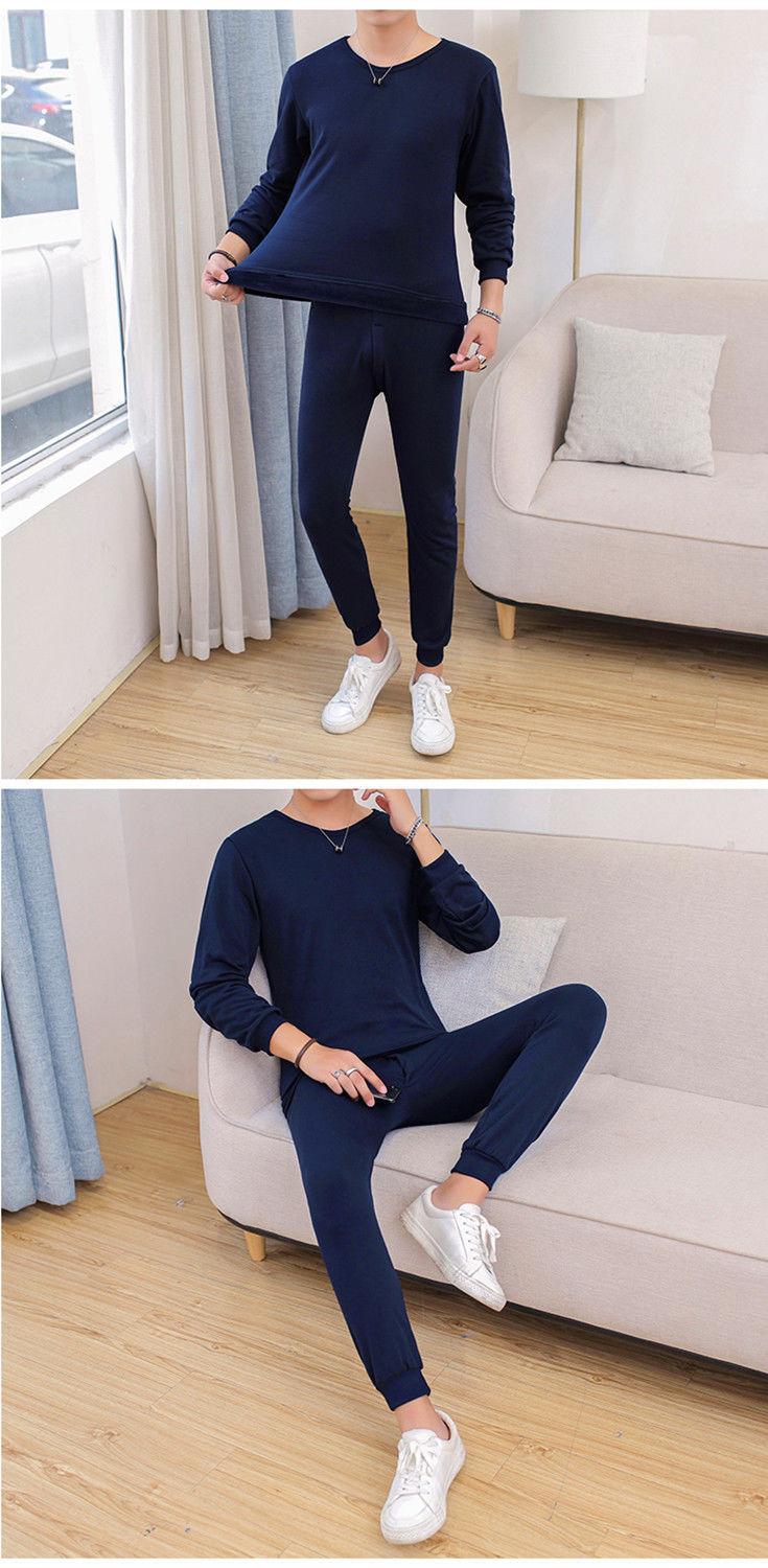 Ropa interior térmica con forro polar para hombre, ropa juvenil de otoño y pantalones casuales de color sólido grueso, cuello redondo para otoño e invierno.