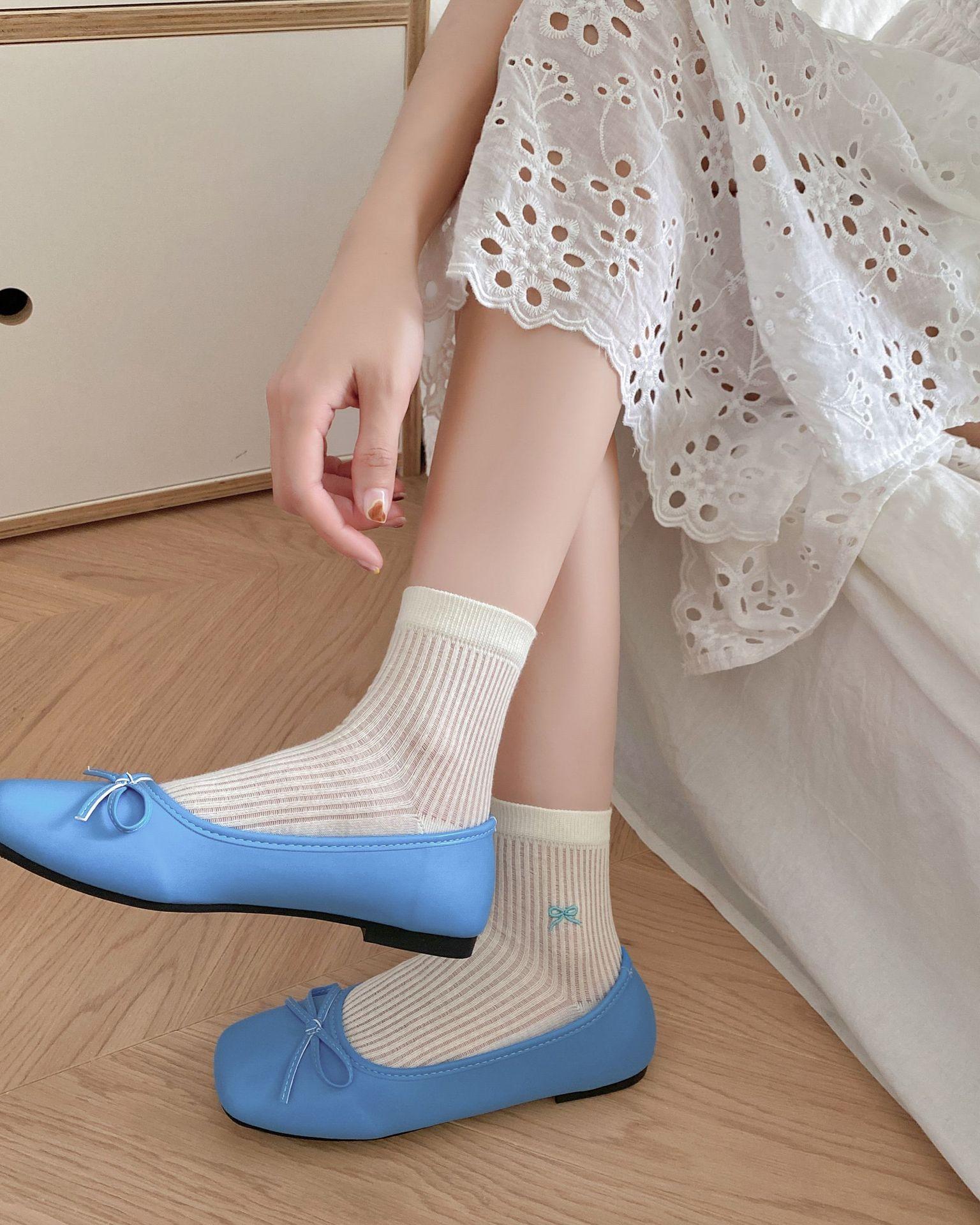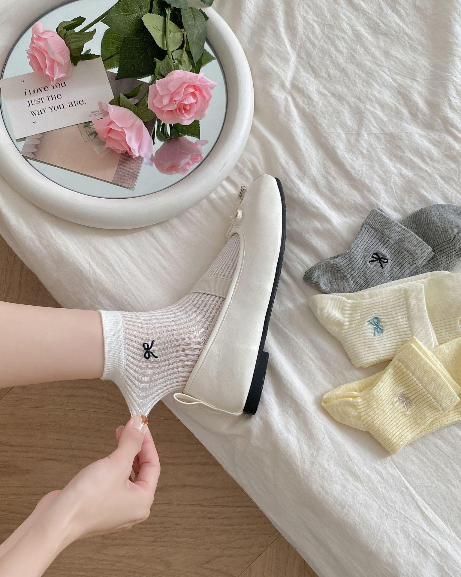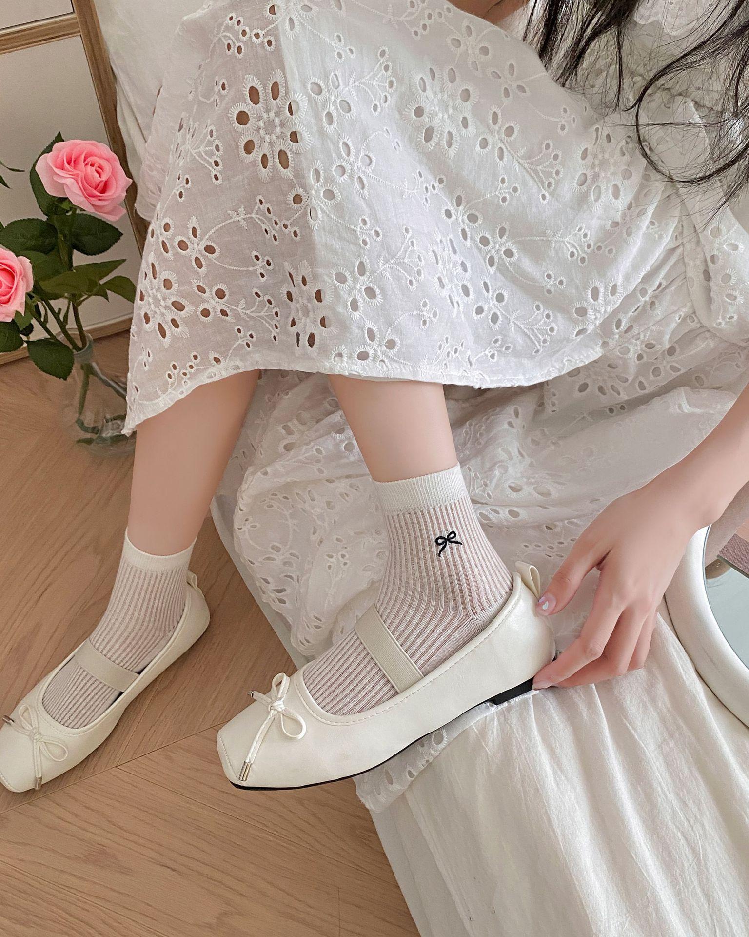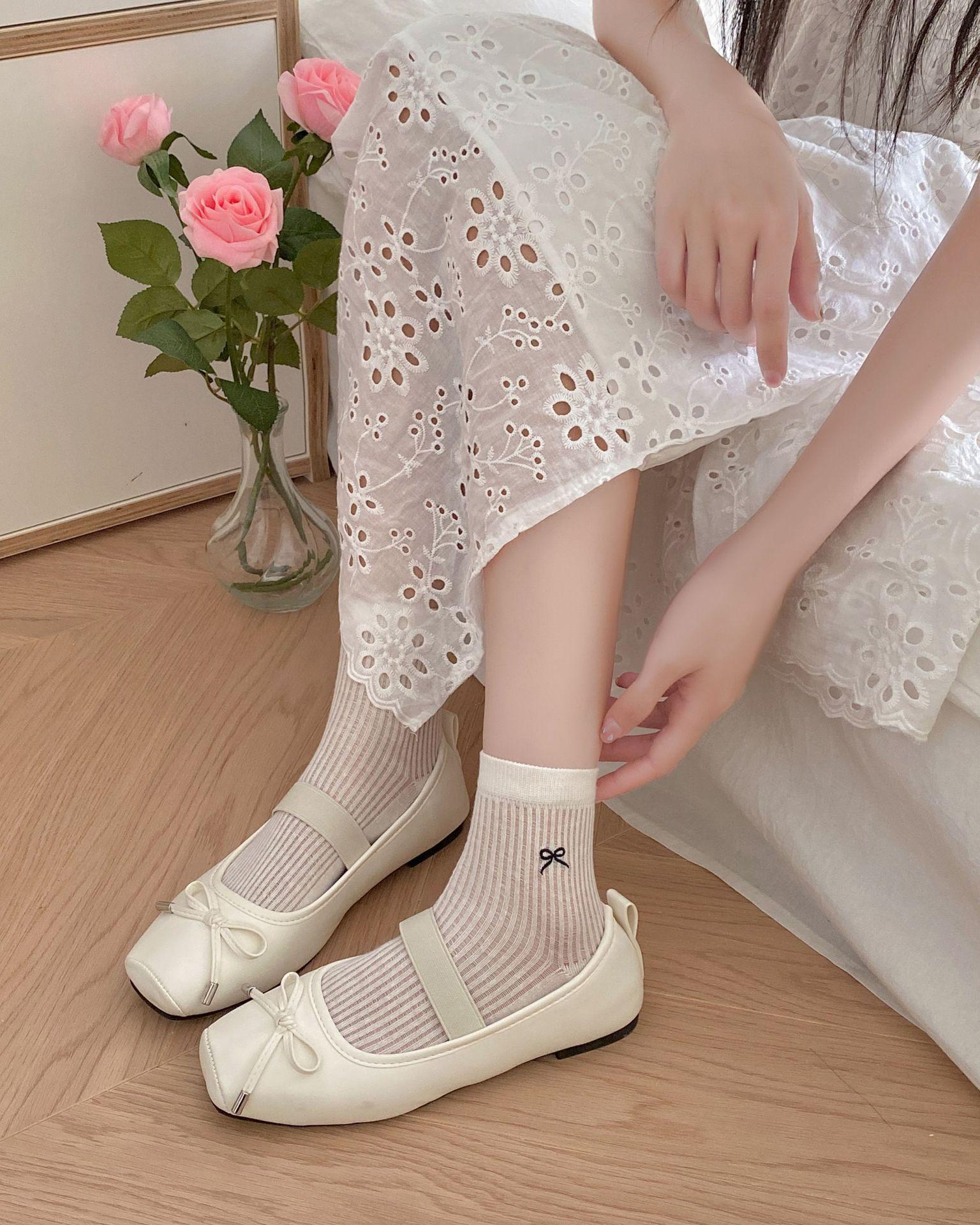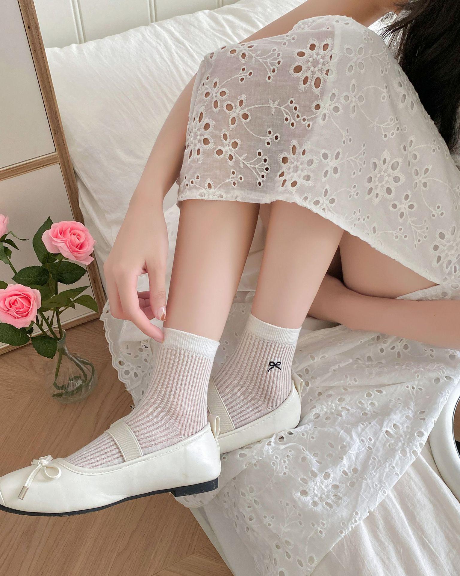 Calcetines de verano para mujer, finos, bordados, con lazo, cortos, de malla, transpirables, estilo coreano, sin hueso, de color liso, hasta la rodilla.