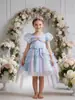 Vestido de princesa con mangas abullonadas y malla con lentejuelas para niños europeos y americanos, vestido de novia, disfraz de presentadora de pasarela para el Día del Niño