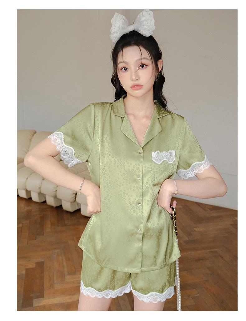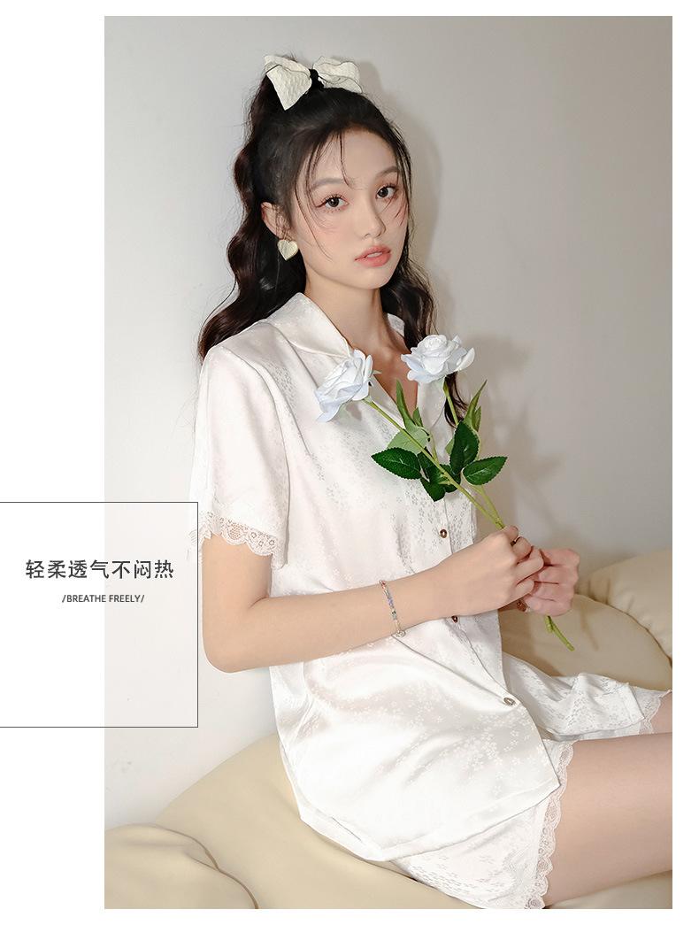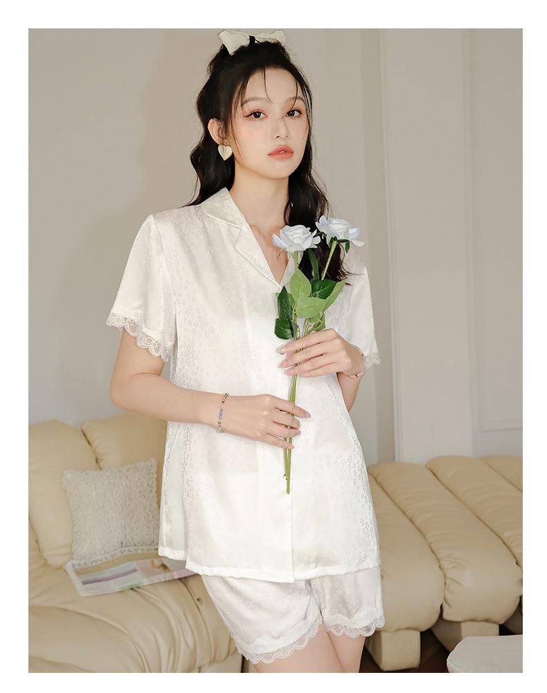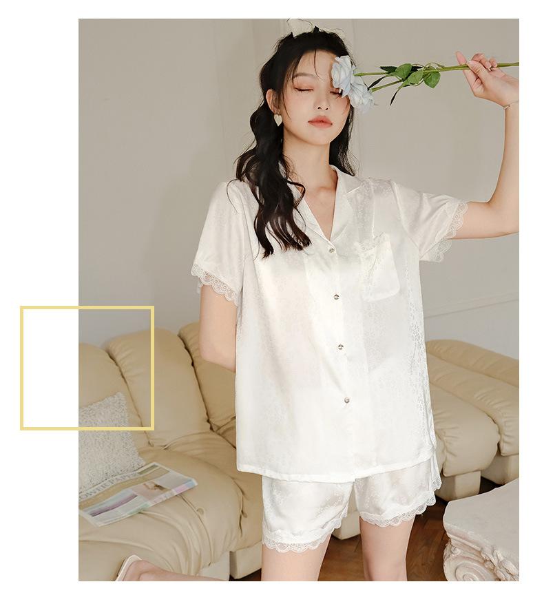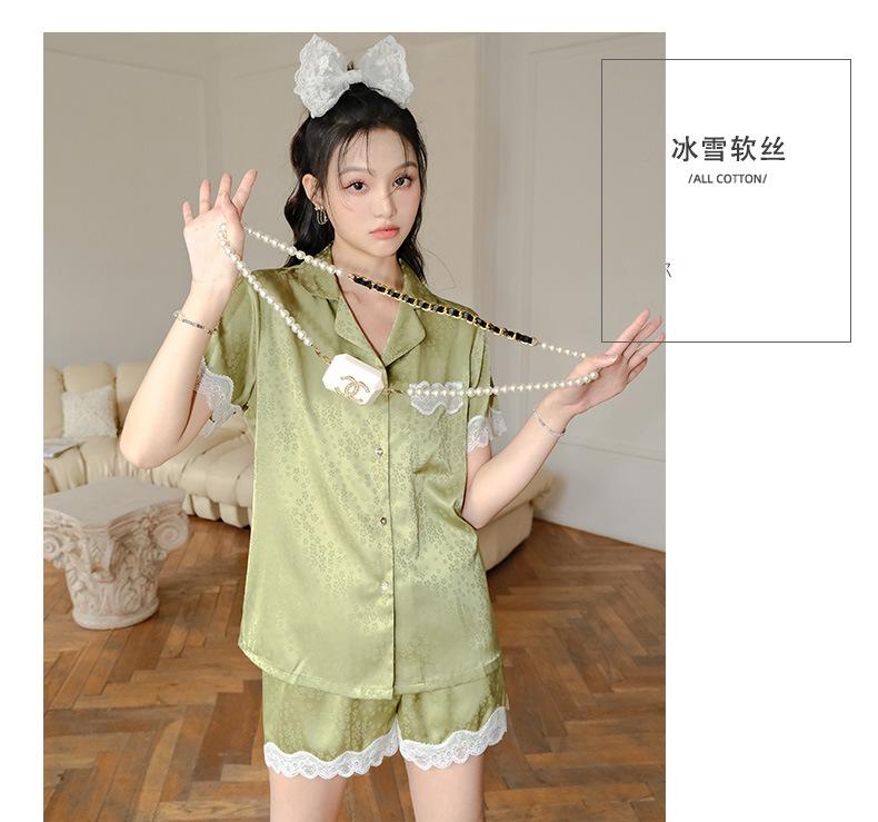 Pijama de verano 2024 para mujer, de seda de hielo, jacquard, con encaje floral, manga corta, pantalones cortos, traje de dos piezas, ropa de casa para mujer