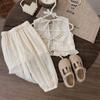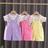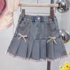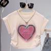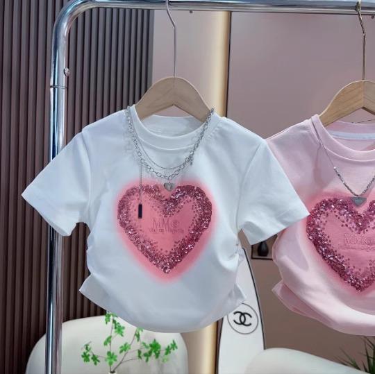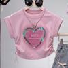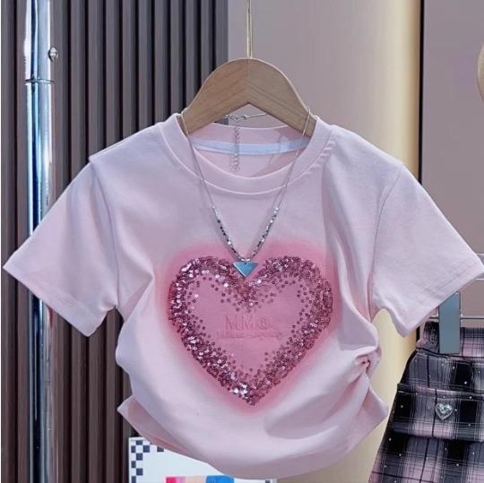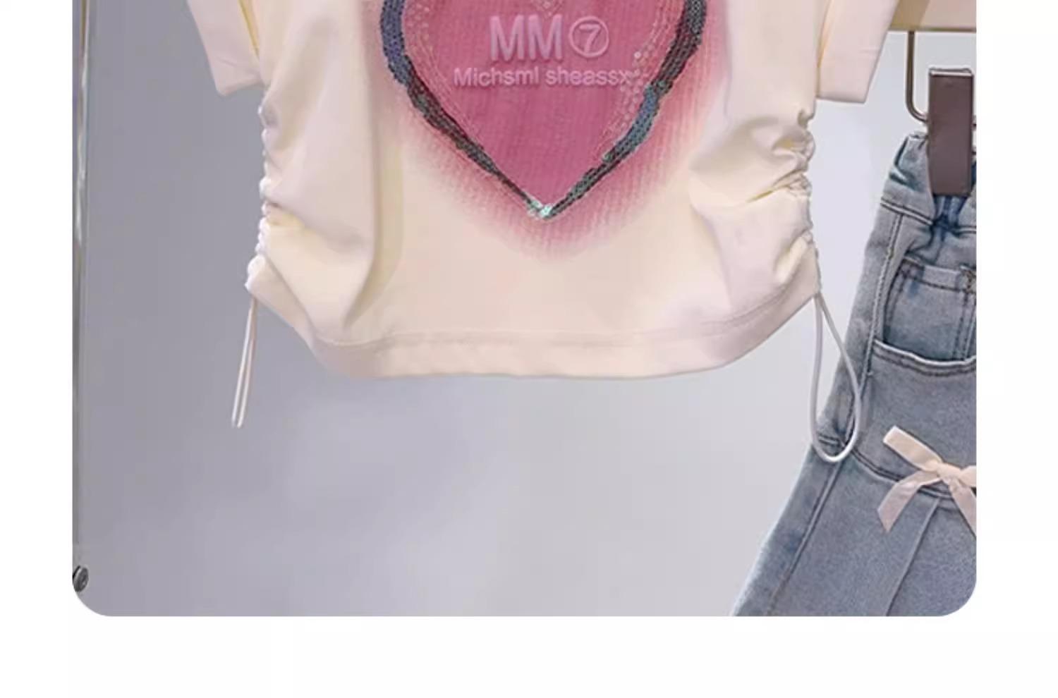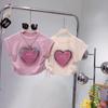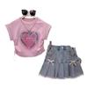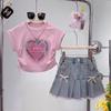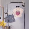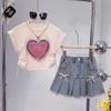 Traje de Verano para Niñas Bebé Elegante Infantil Personalizado Moderno Marca Coreana Amor Lentejuelas Camiseta Encaje Falda de Mezclilla