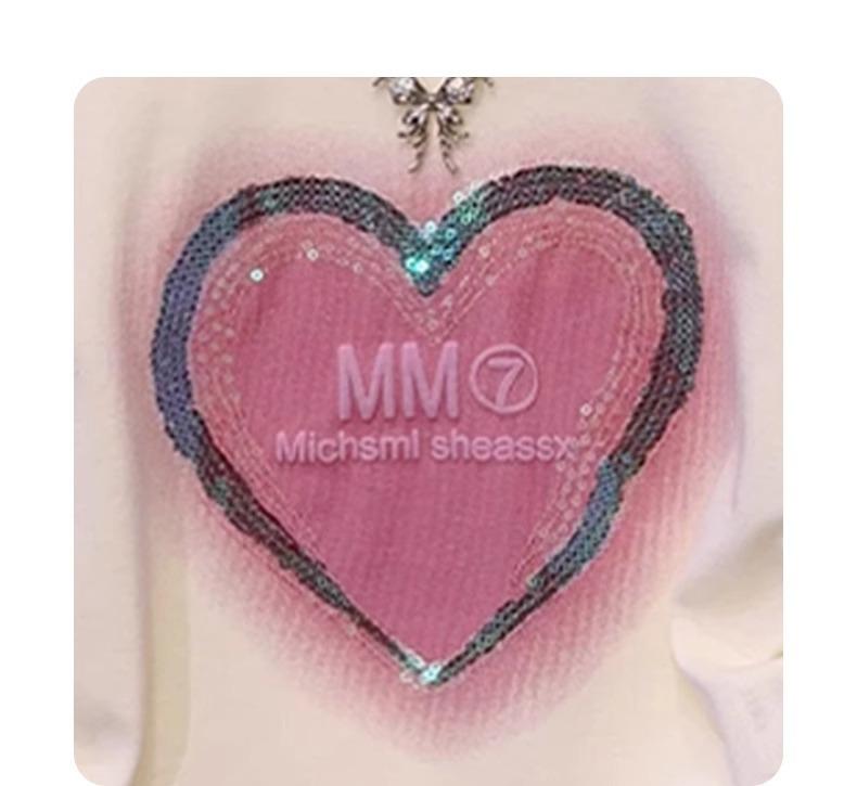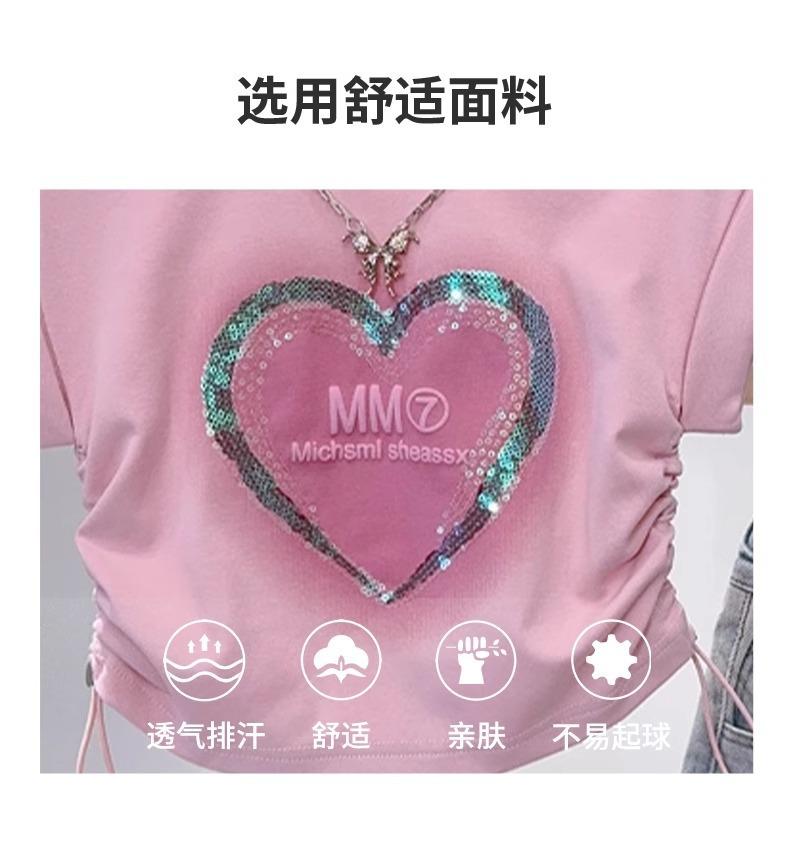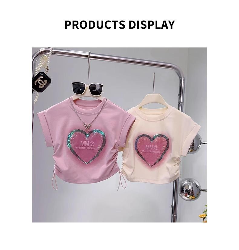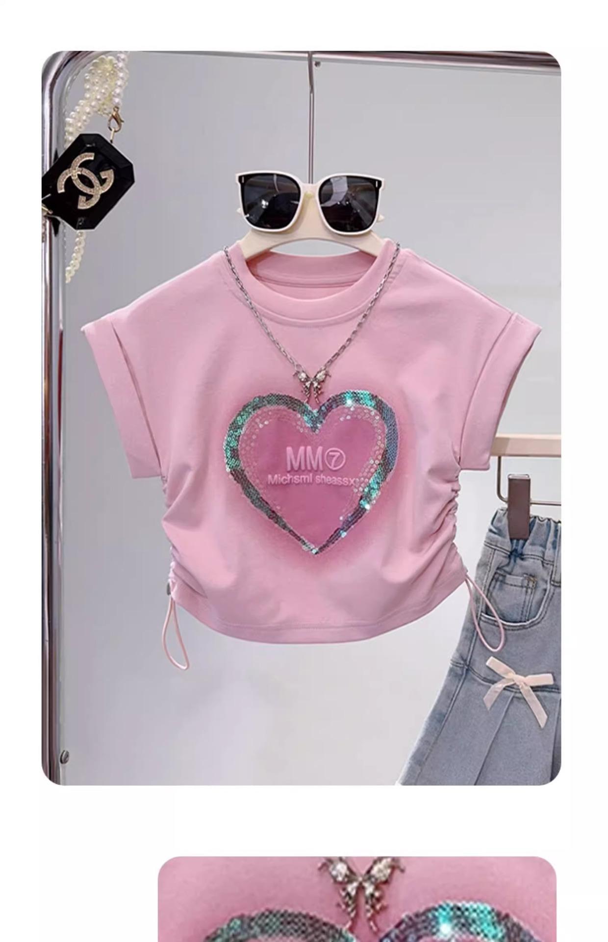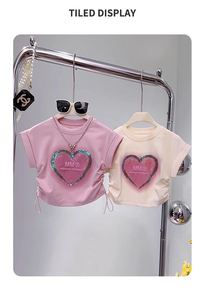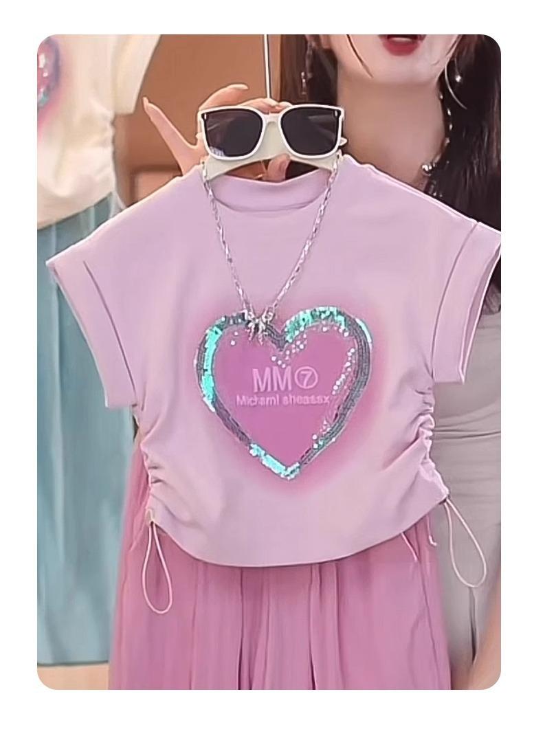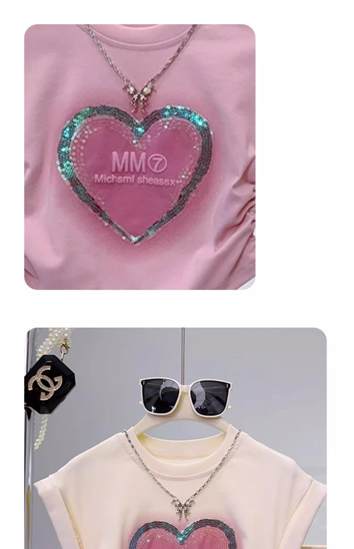 Beige sequined love t-shirt + lace pleated skirt, Pink sequinheart t-shirt + lace pleated skirt, Beige sequine...