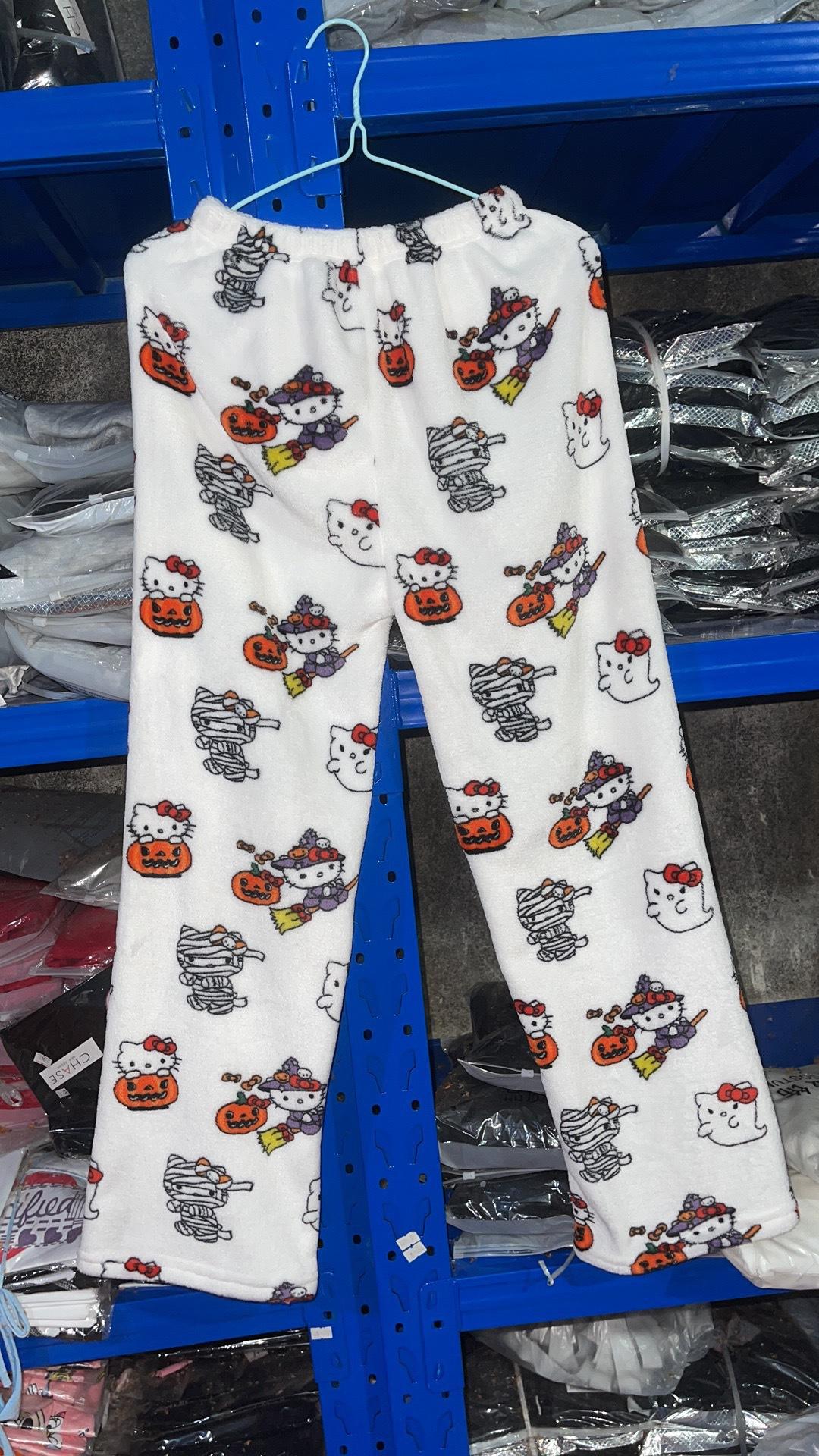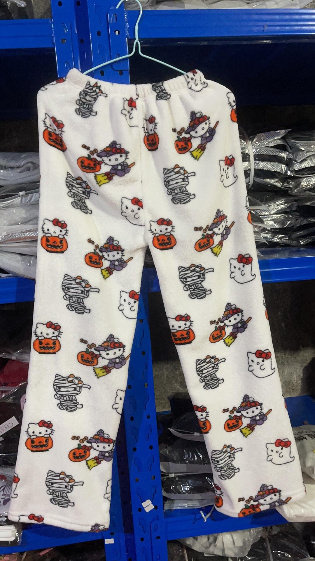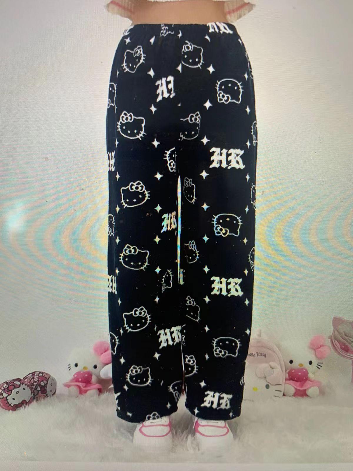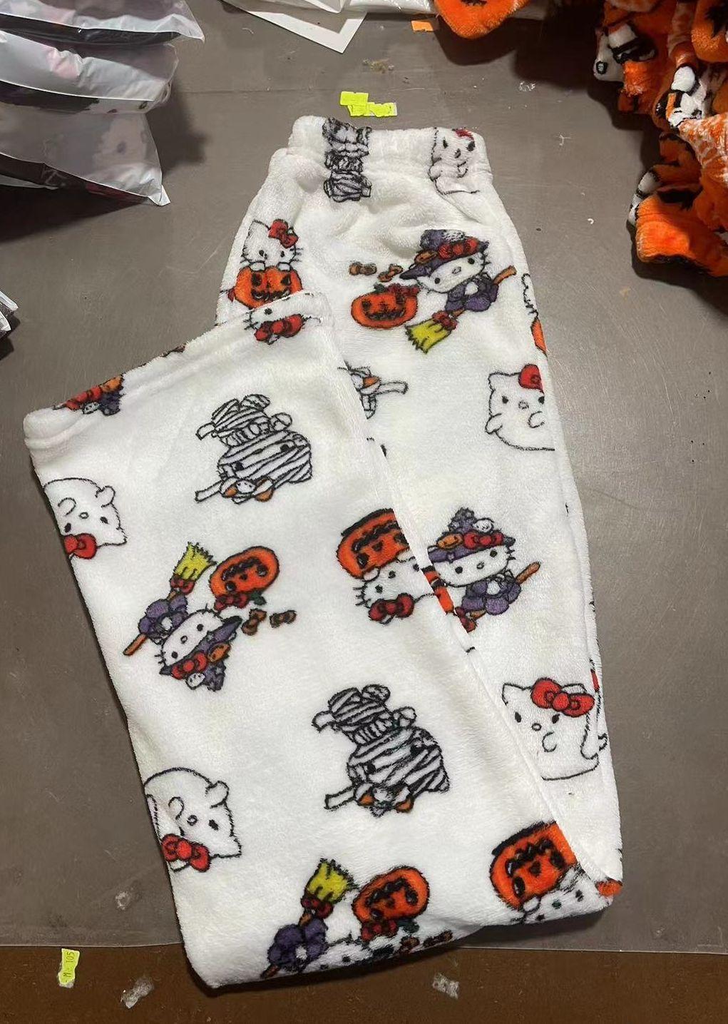 Comercio exterior Halloween dibujos animados KT gato pijama de franela mujer otoño e invierno más terciopelo cálido ocio hogar graffiti pantalones
