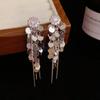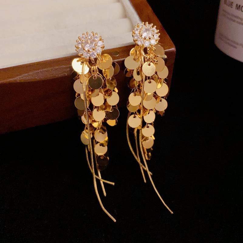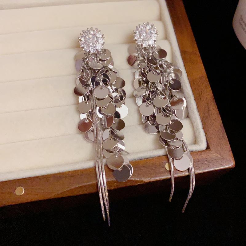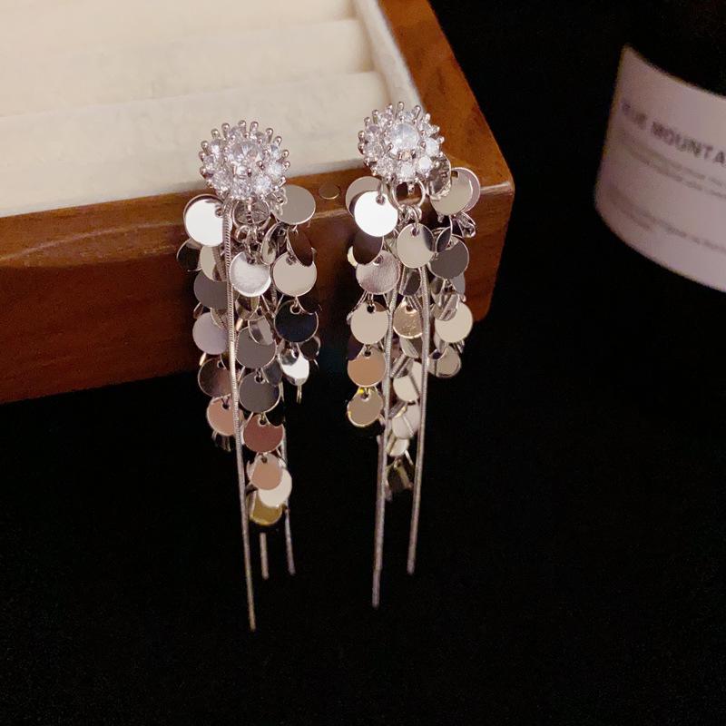 Pendientes de borlas con lentejuelas de metal y flores de circonita con personalidad de alta calidad europea y americana, pendientes largos versátiles de moda de lujo ligeros para mujer