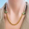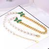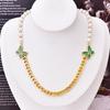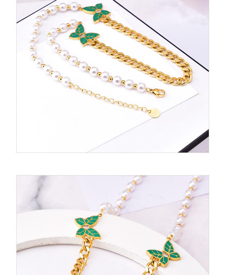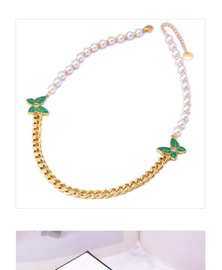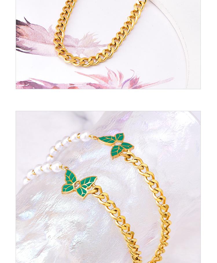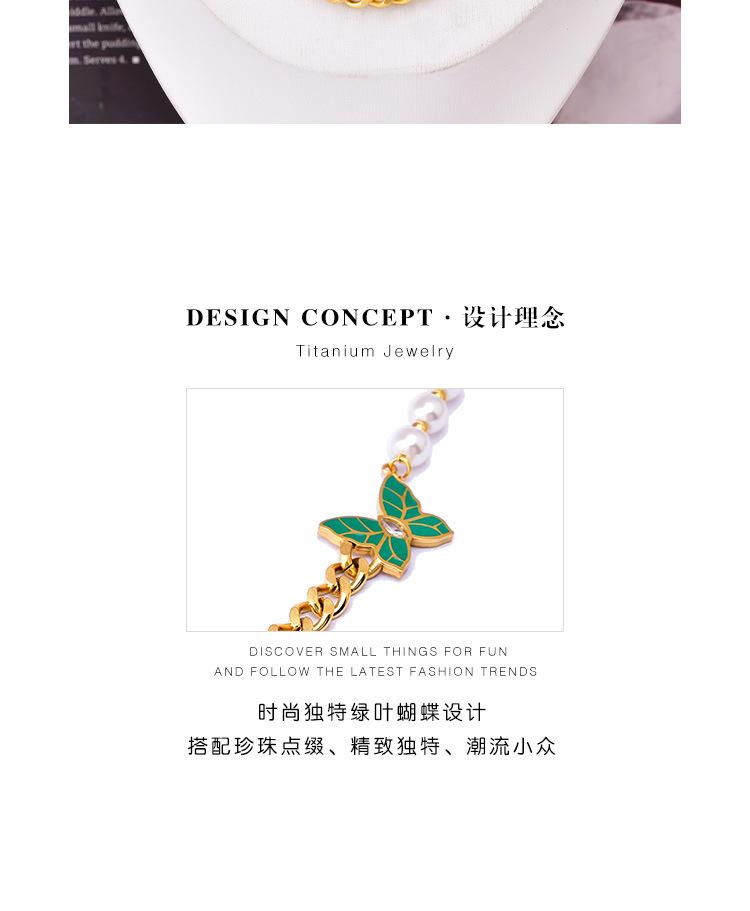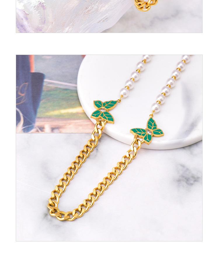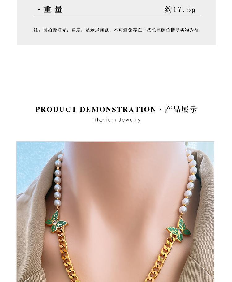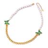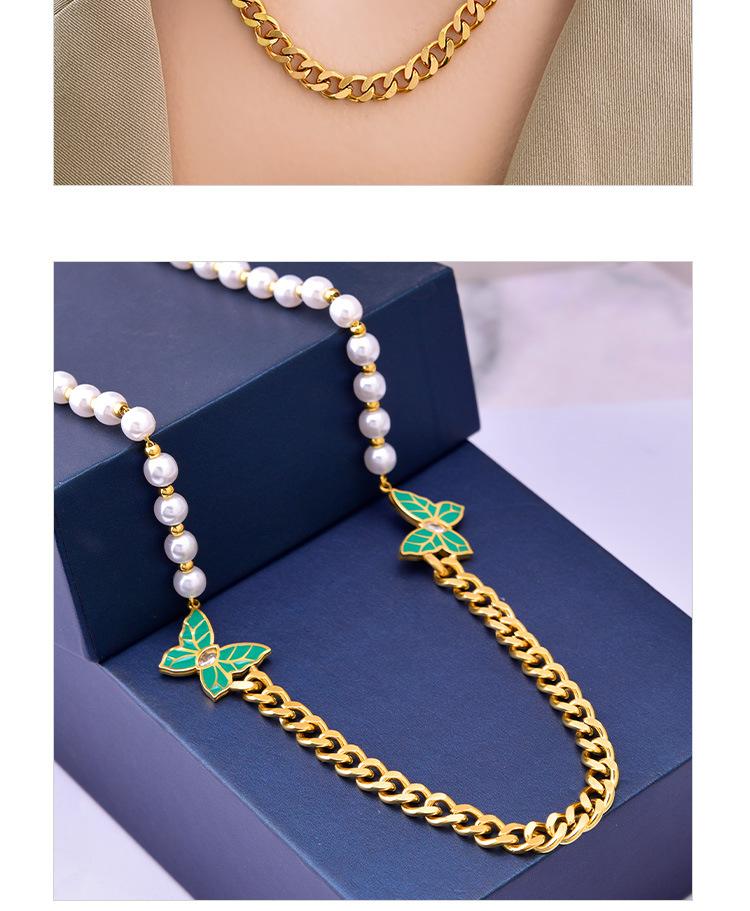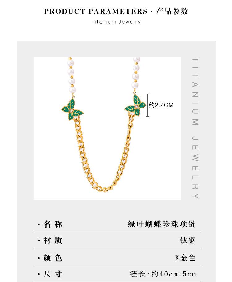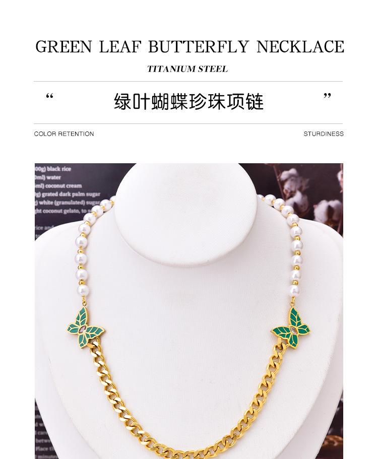 Cadena de clavícula de perlas de temperamento europeo y americano con patrón de hojas verdes, joyería de mariposa de diamantes, collar grueso de acero de titanio, cadena de camiseta de oro de 18 quilates para mujer