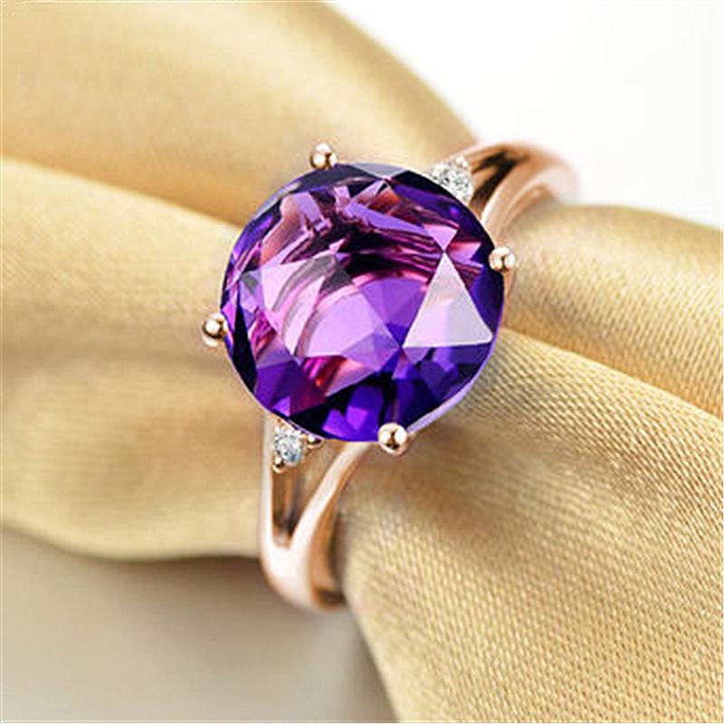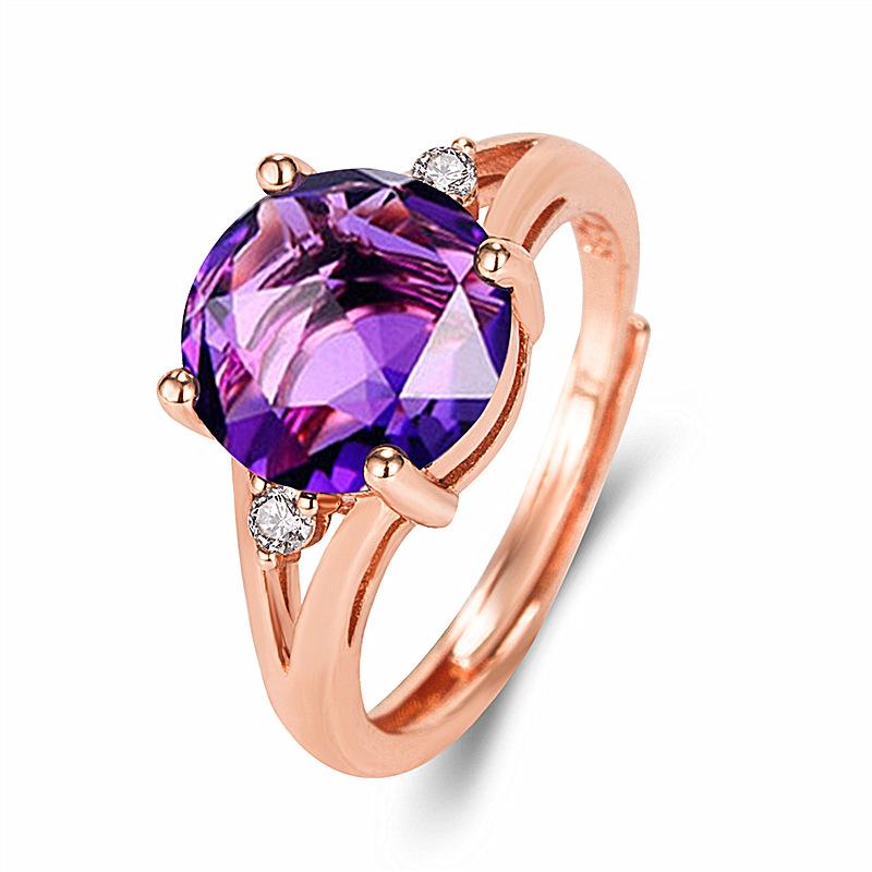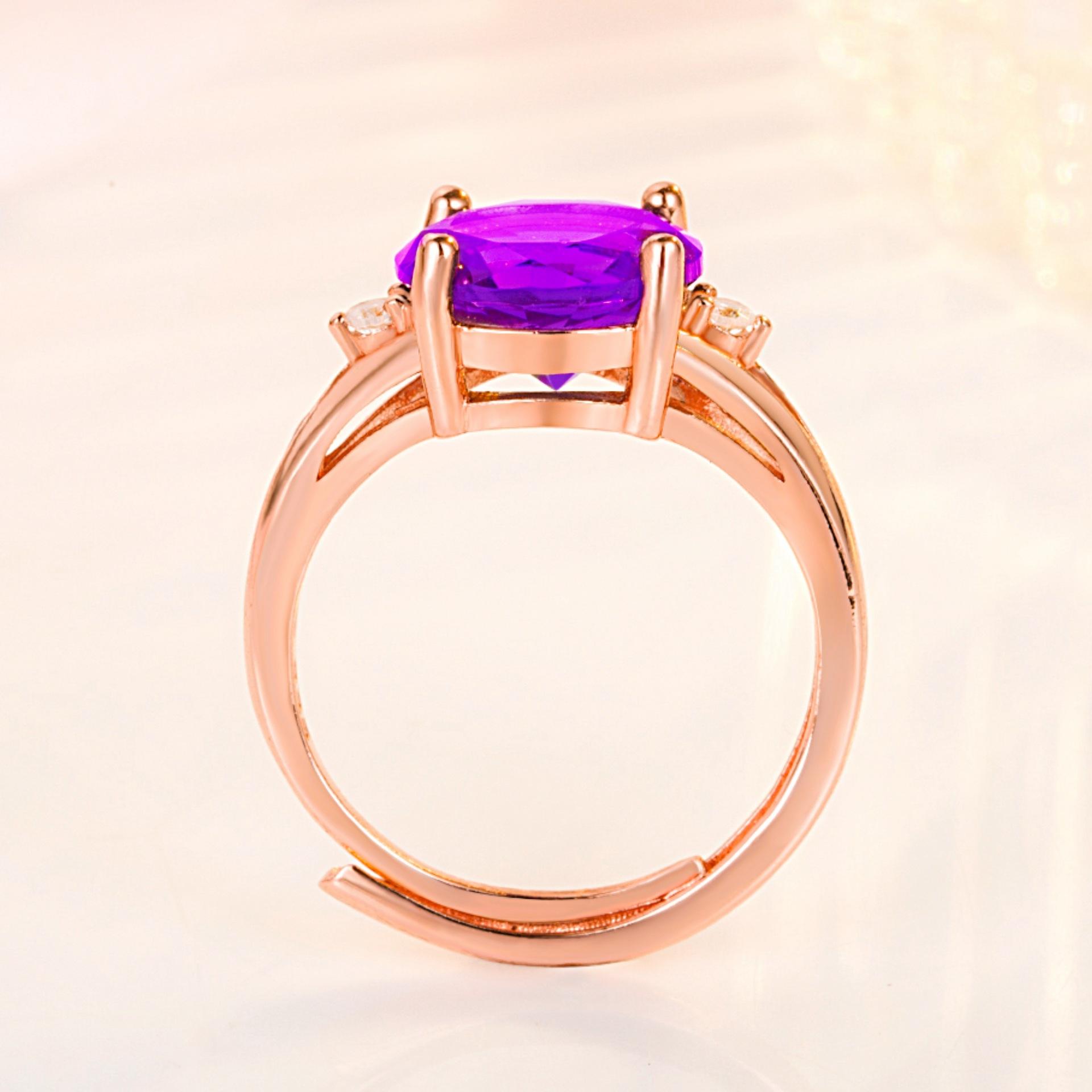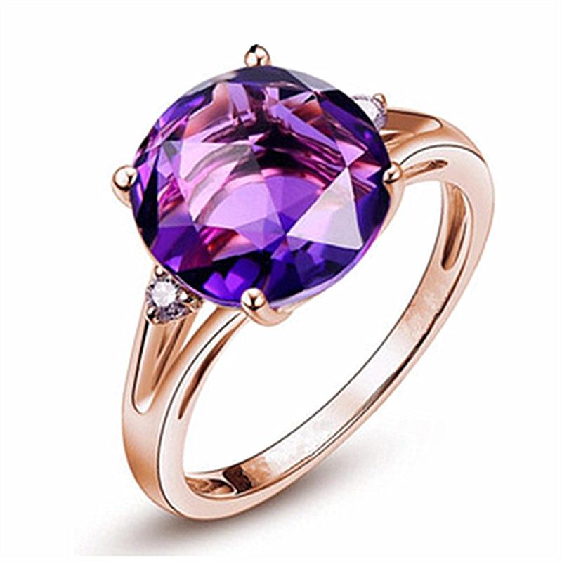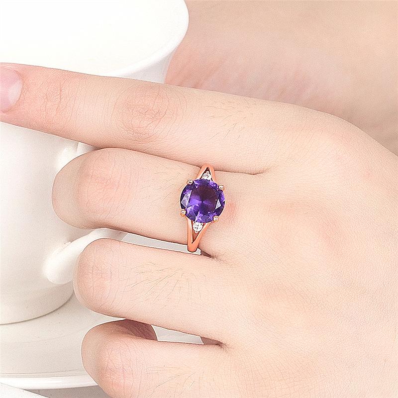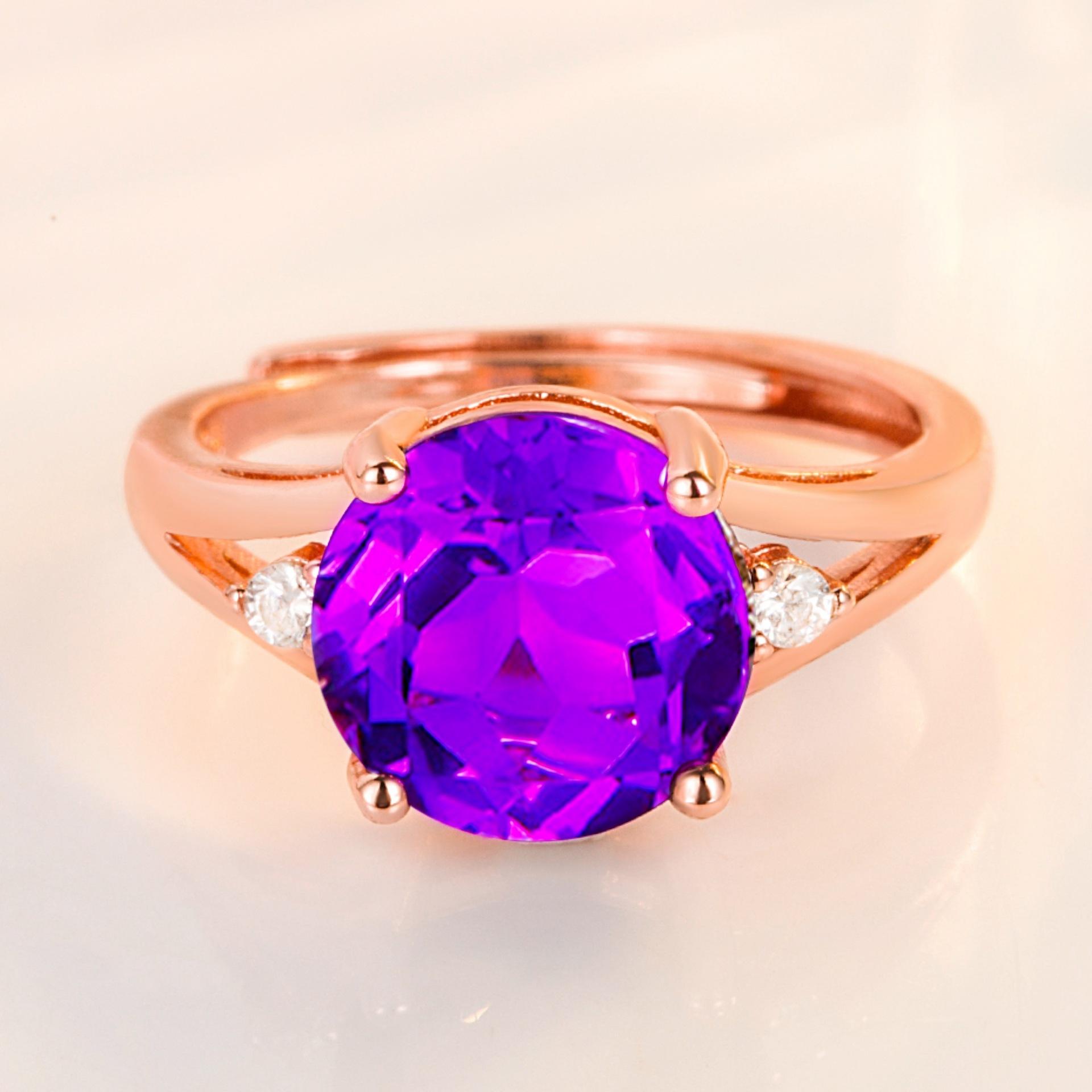 Anillo de amatista con diamante redondo violeta bañado en oro rosa de 18 quilates. Romántico y elegante anillo de amor morado.