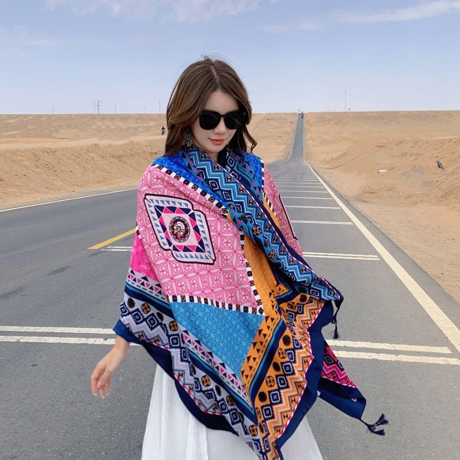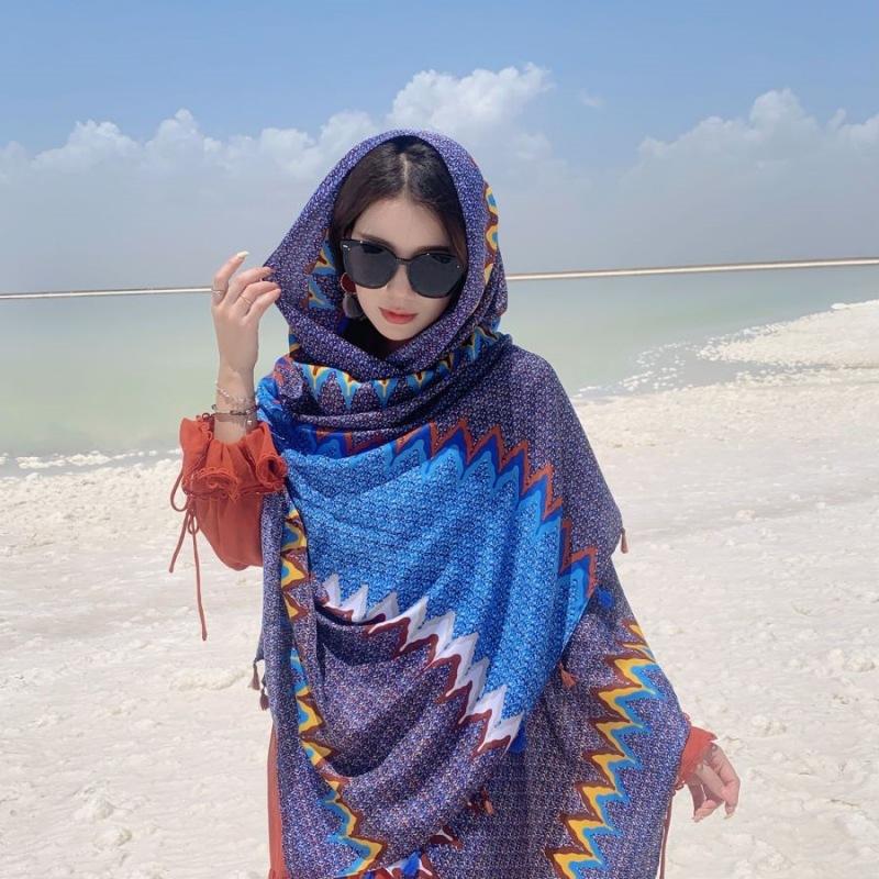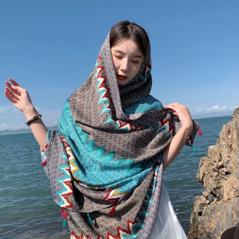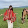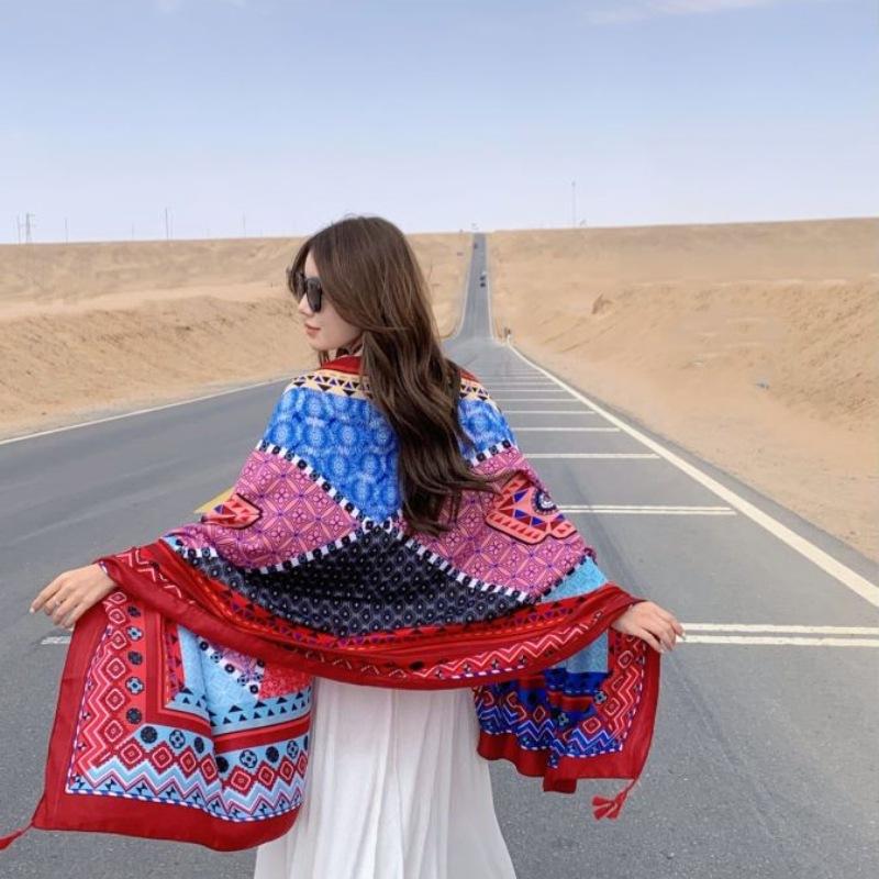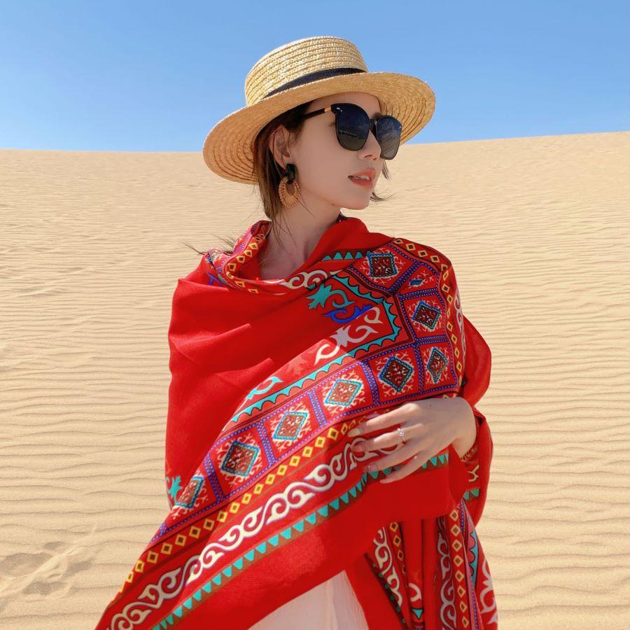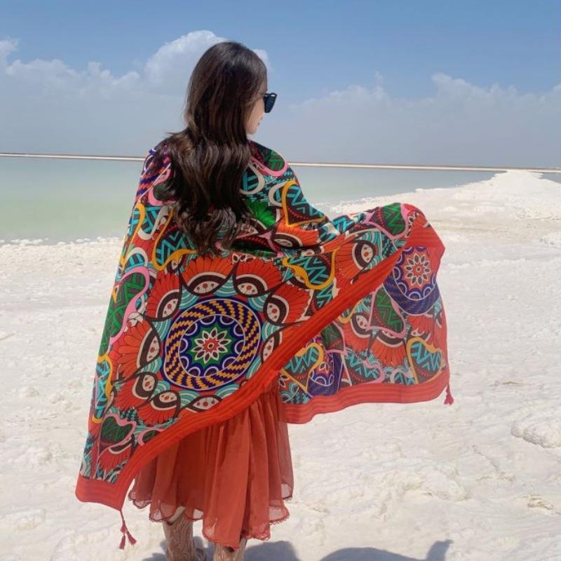 Compra Bufanda estilo étnico, chal, doble uso, protección solar, playa, color rojo, color liso, para mujer, foto de viaje de Yunnan al por mayor en Joom.pro