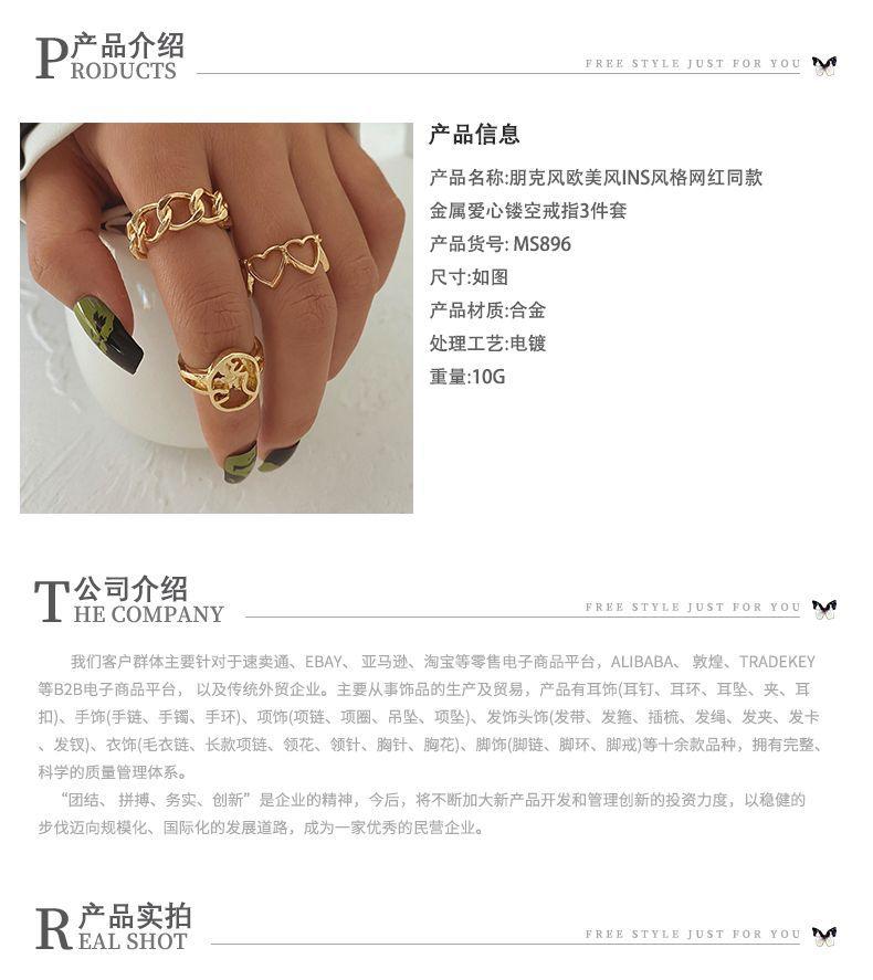 Conjunto de 3 anillos huecos de metal con forma de corazón de Mu Shang, estilo coreano, para mujer, con anillos abiertos MS896