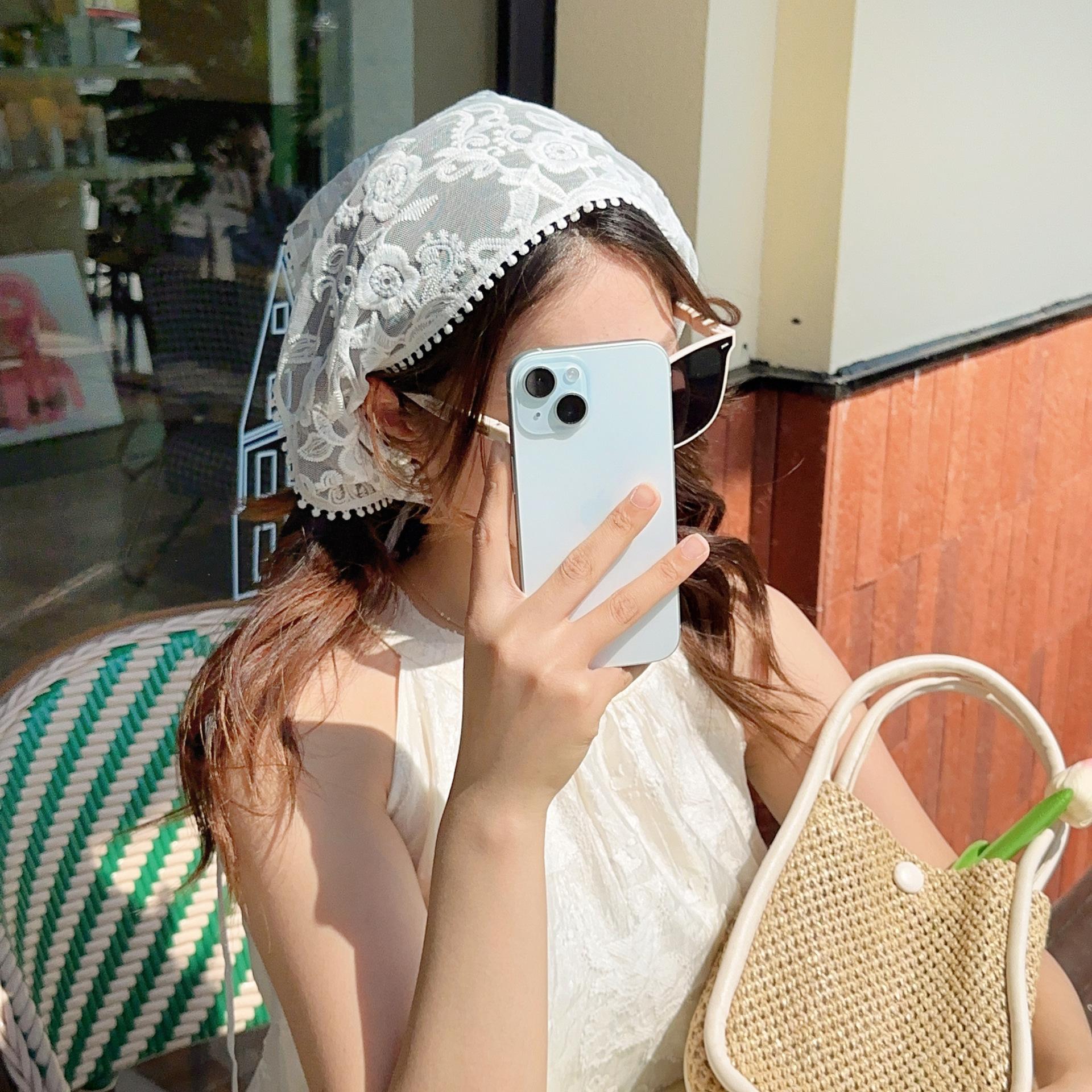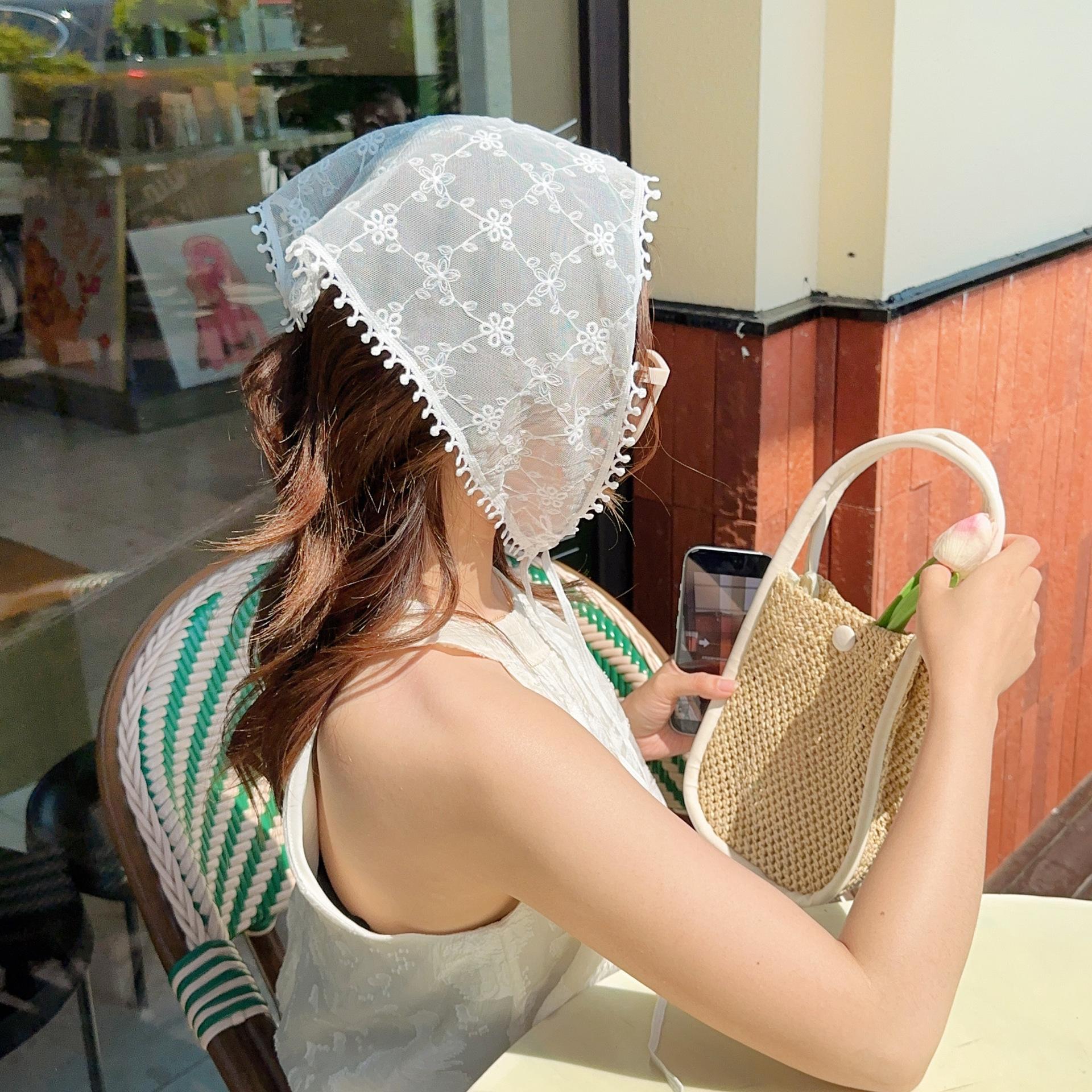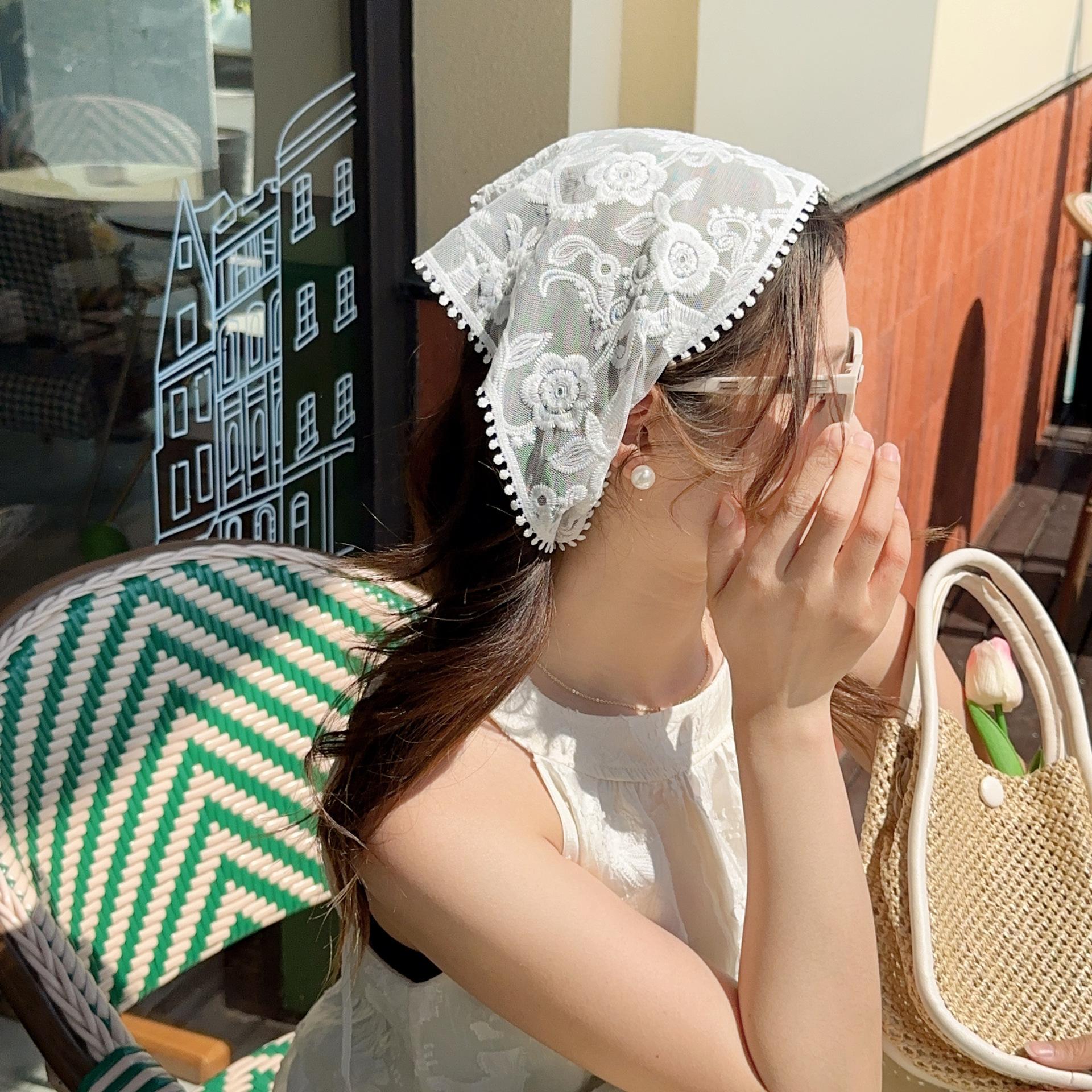 Bufanda triangular de seda con capucha floral de encaje vintage estilo francés para mujer, banda para el pelo, chal, diadema, bonito y dulce tocado de viaje