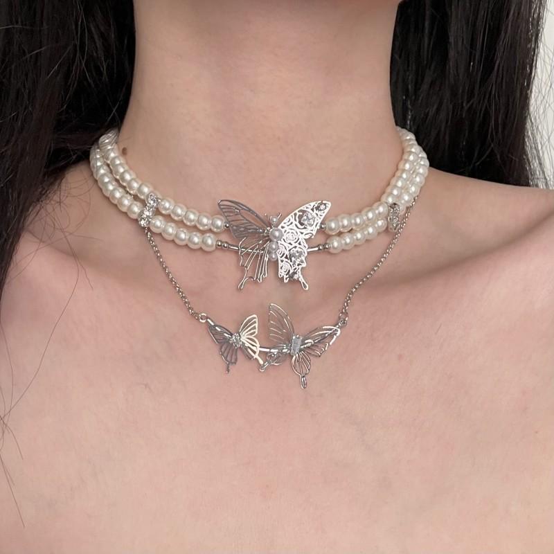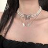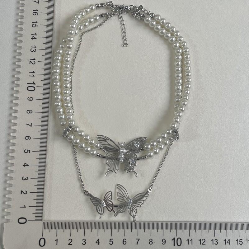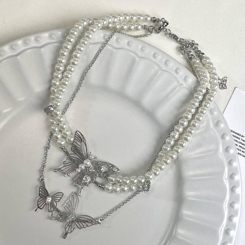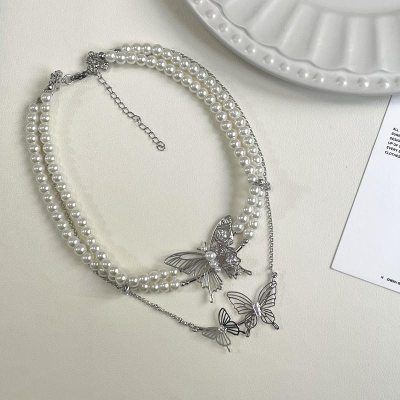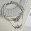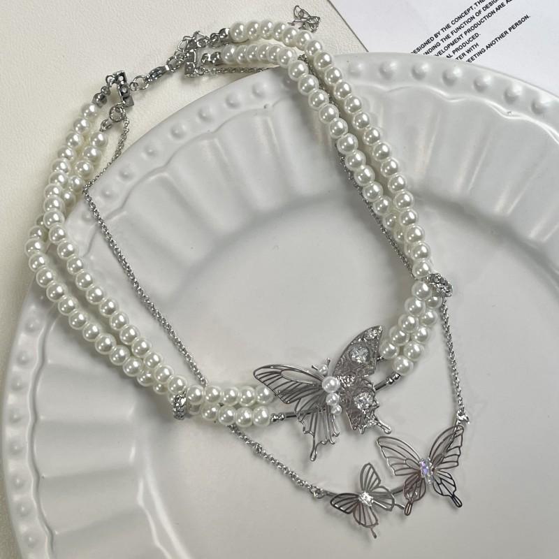 Collar con colgante de mariposa de diamantes y perlas de doble capa, elegante y moderno, de alta gama, con cadena para clavícula.