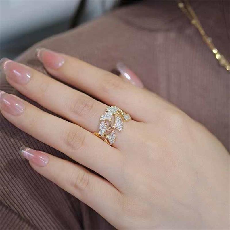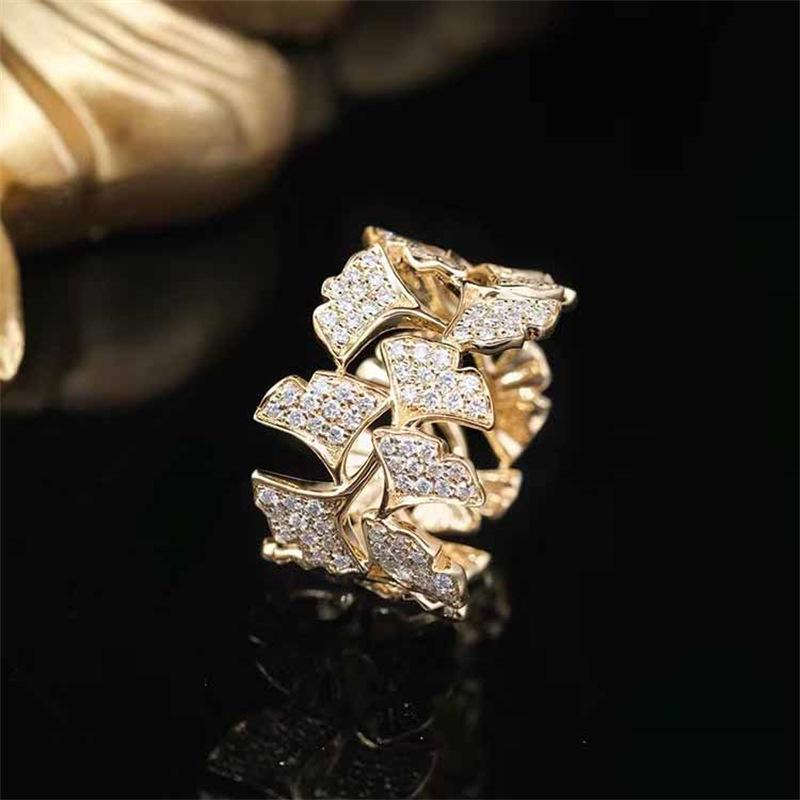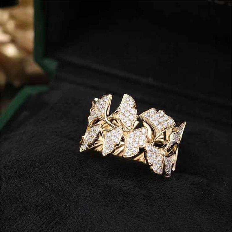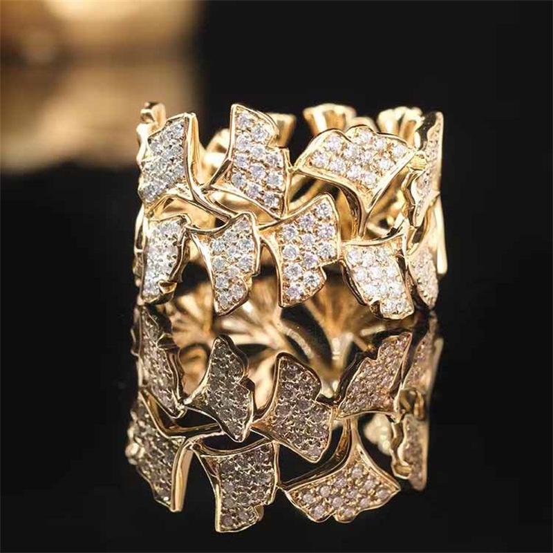 Anillo de diamantes con microincrustaciones de hoja de ginkgo para mujer, estilo industrial pesado, ancho, de oro amarillo, ligero, lujoso y elegante.