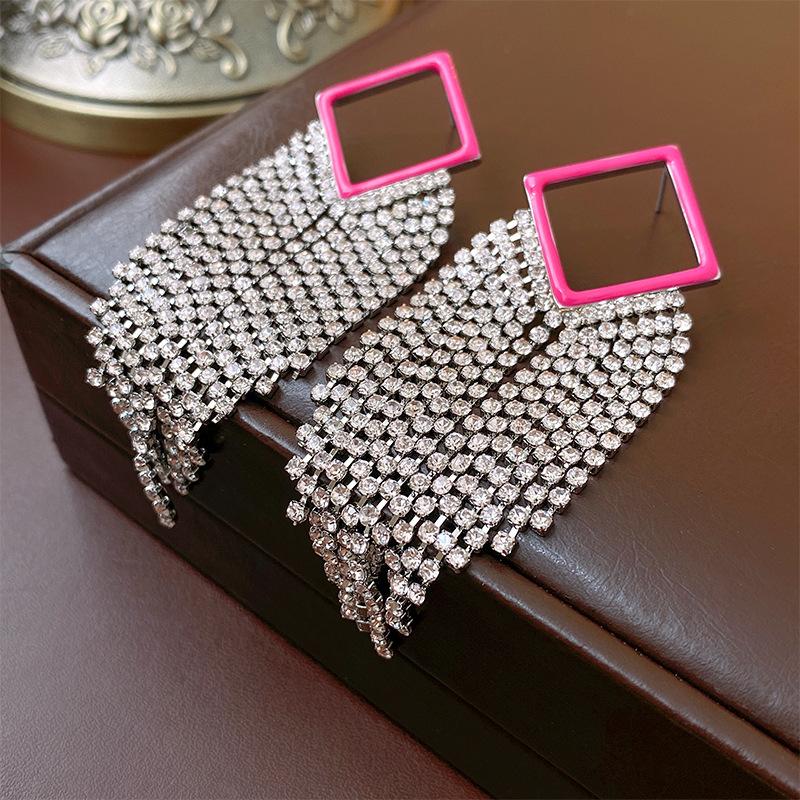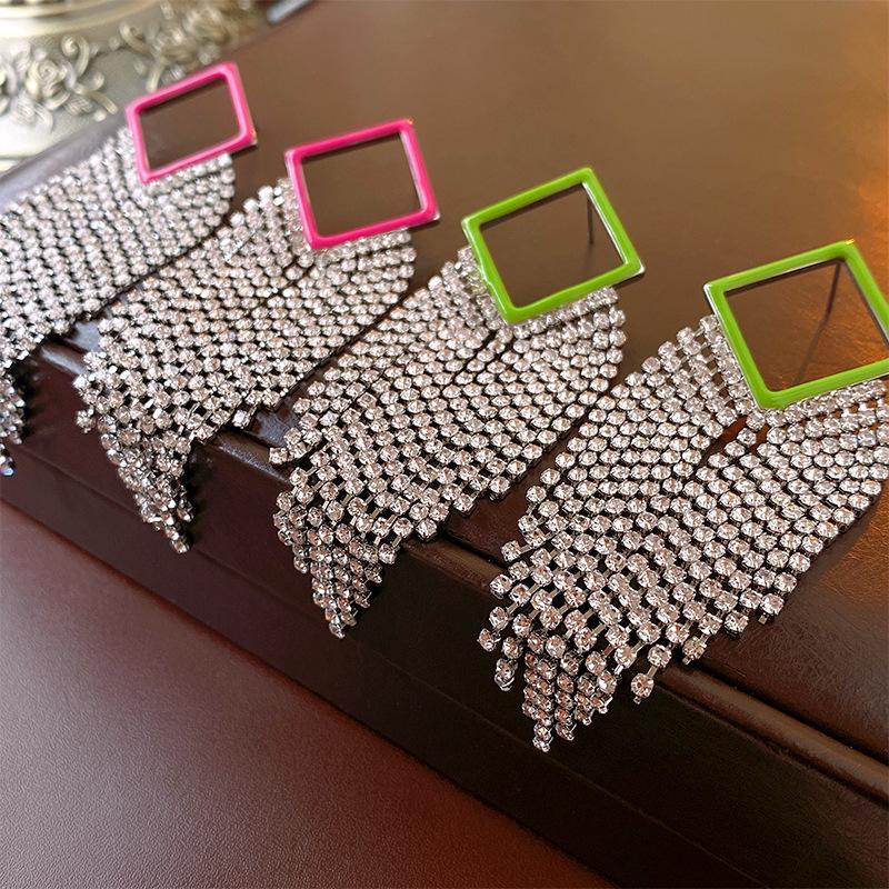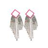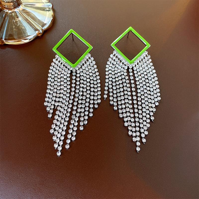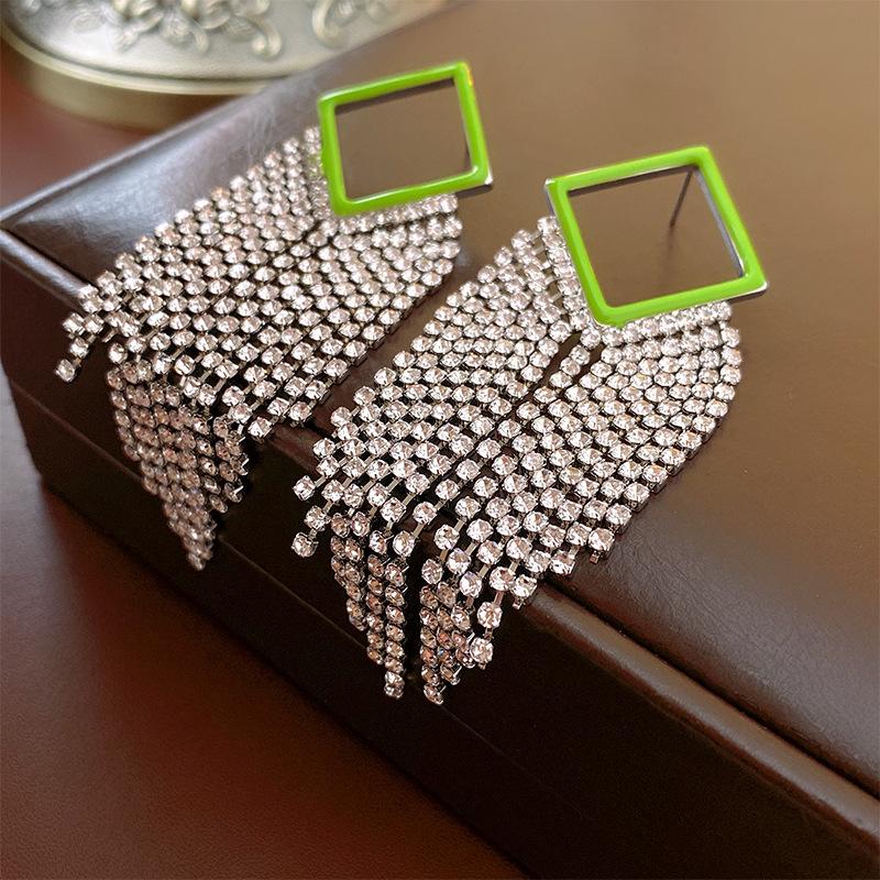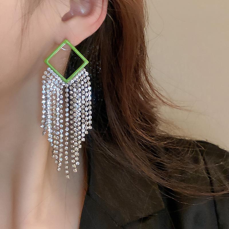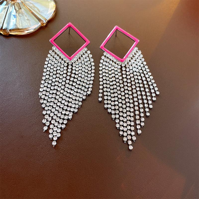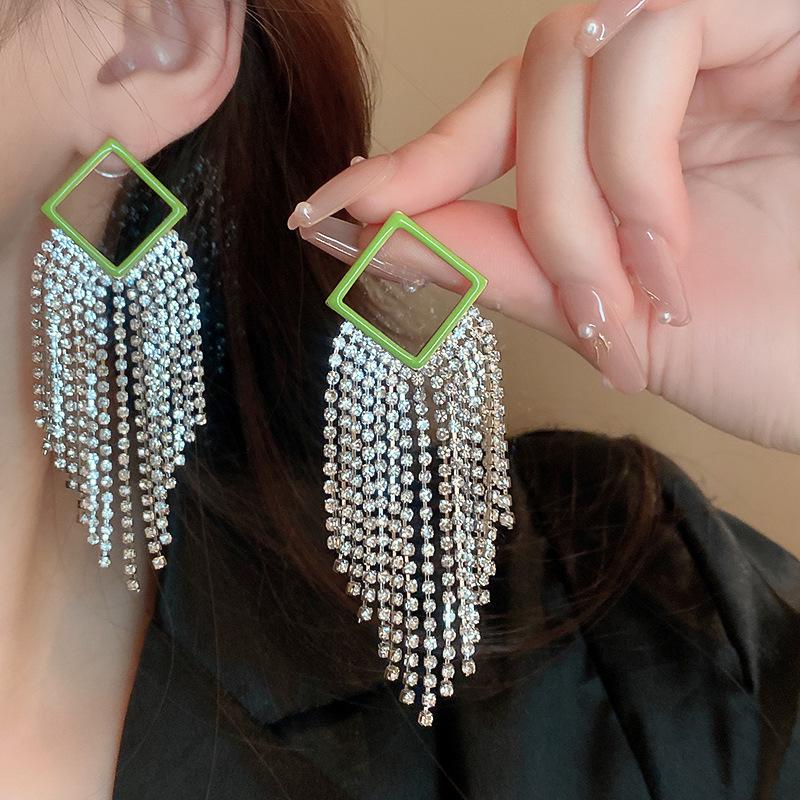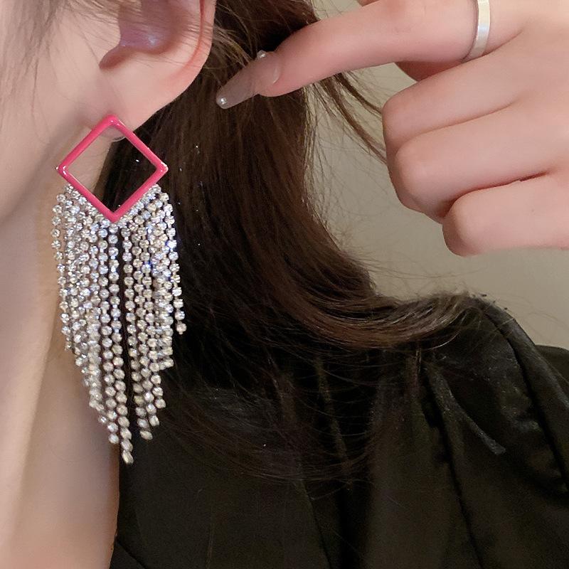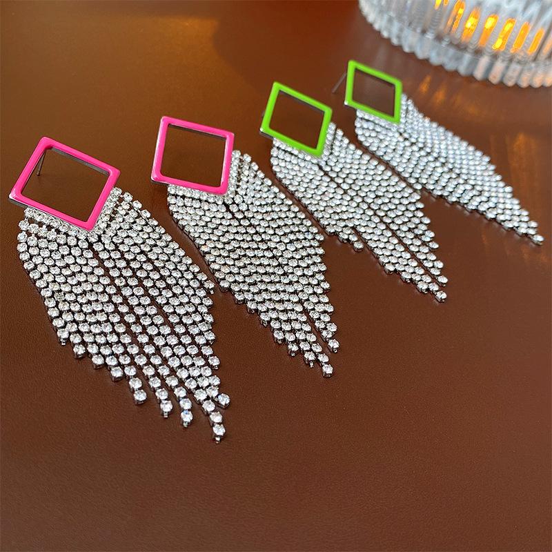 Silver Needle-Green Diamond Tassel Drop Earrings, Silver Needle-Pink Diamond Tassel Drop Earrings