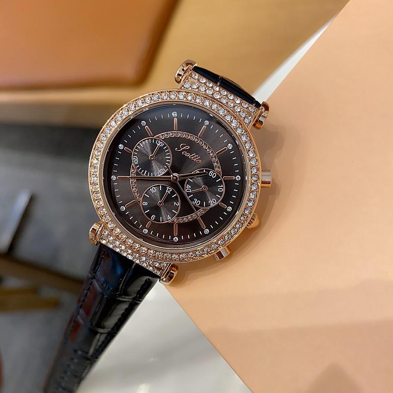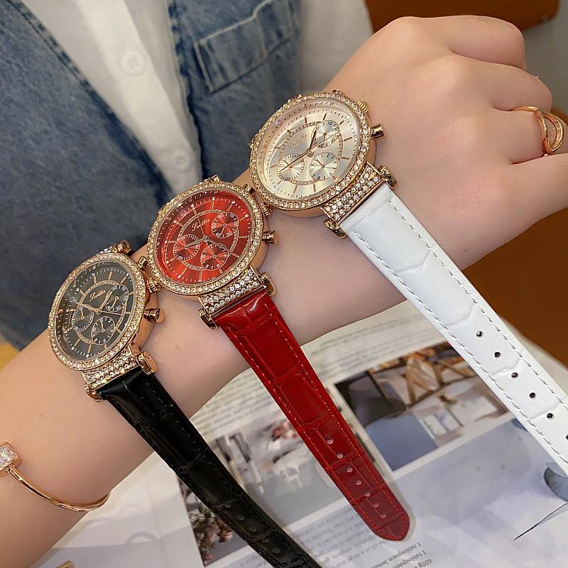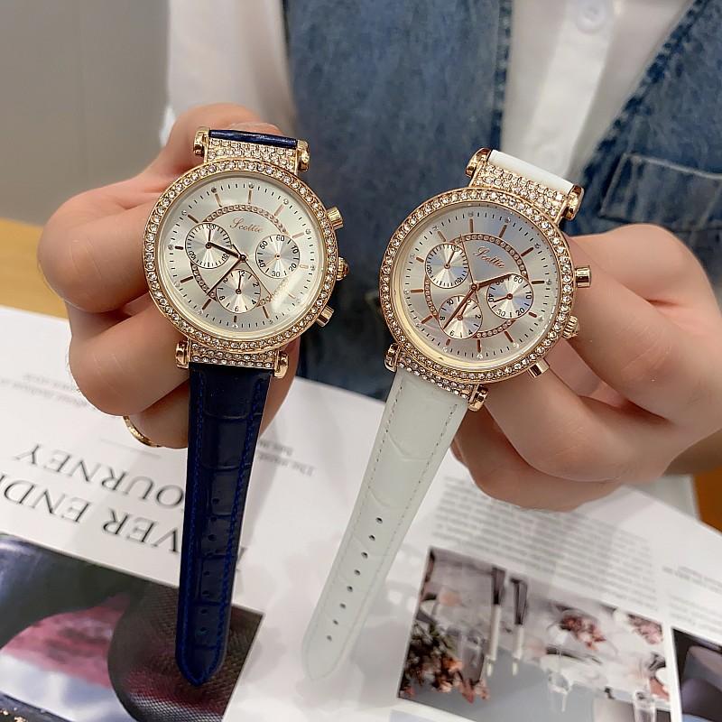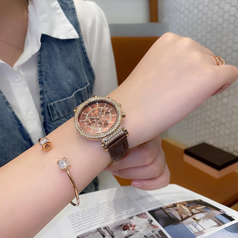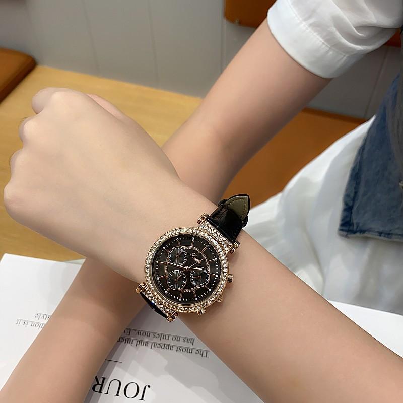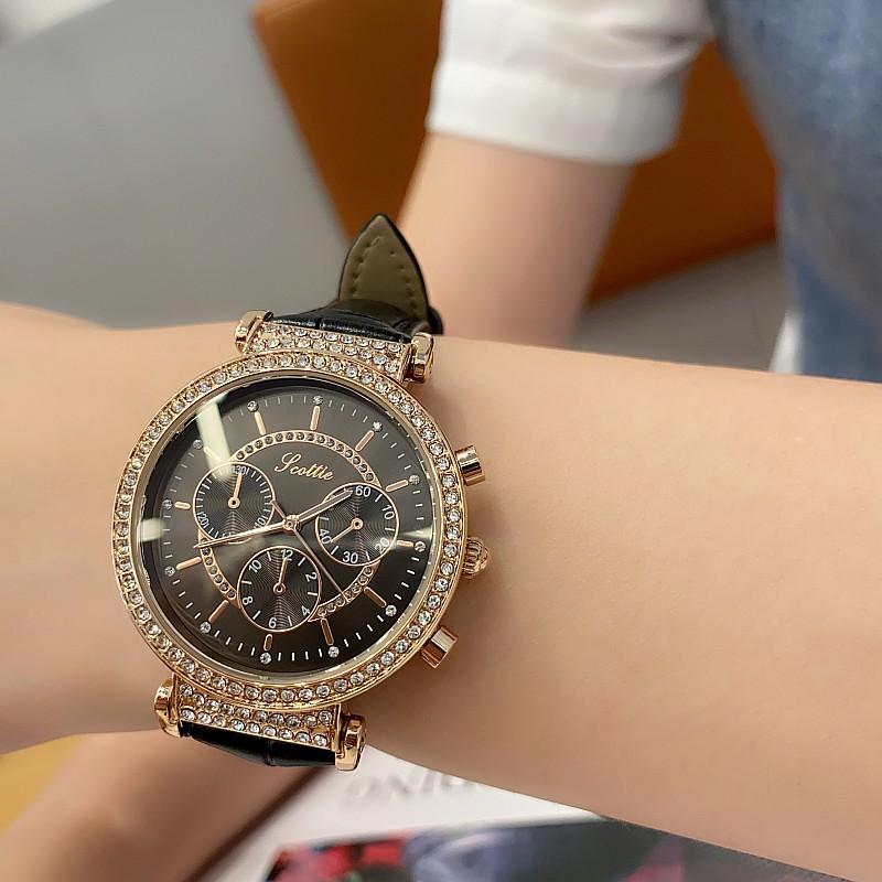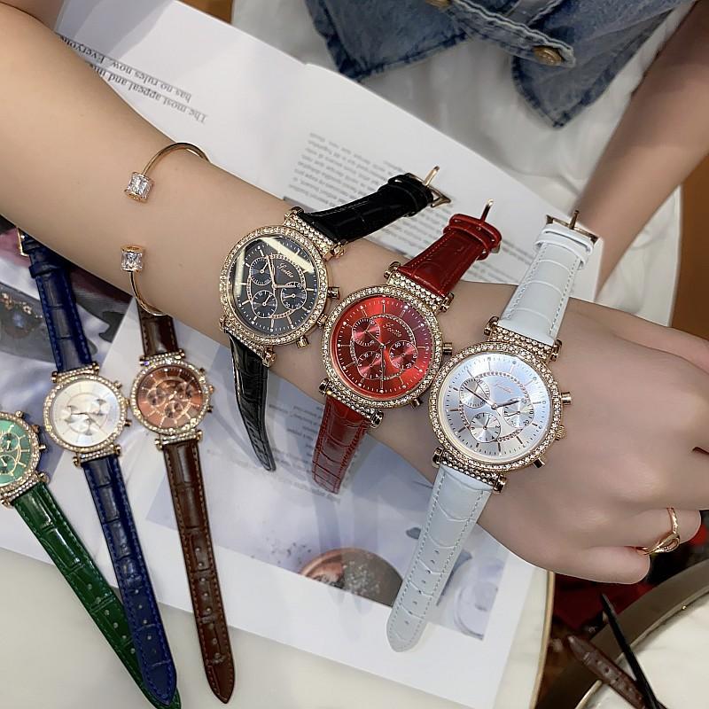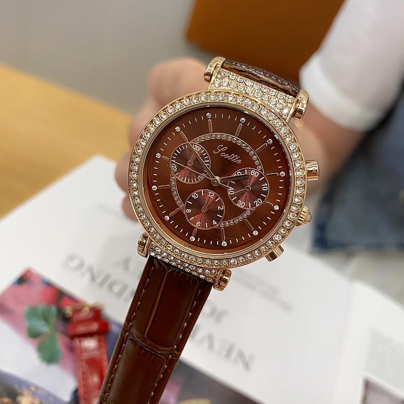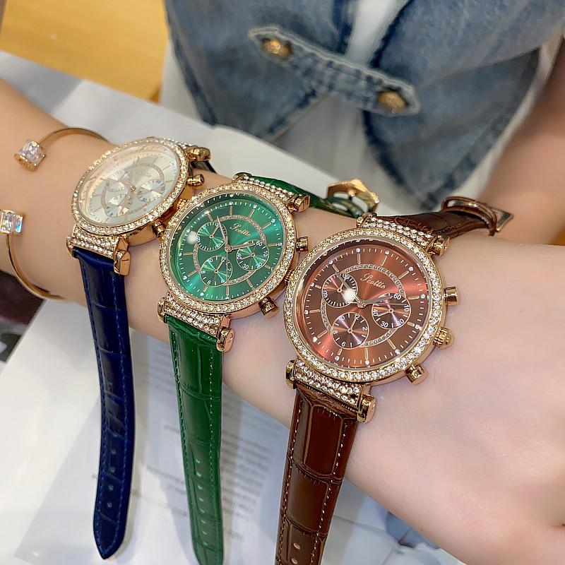 Reloj multifuncional Shigaodi con diamantes incrustados para mujer, reloj elegante y de moda con personalidad, reloj de cuero con estilo redondo para mujer.
