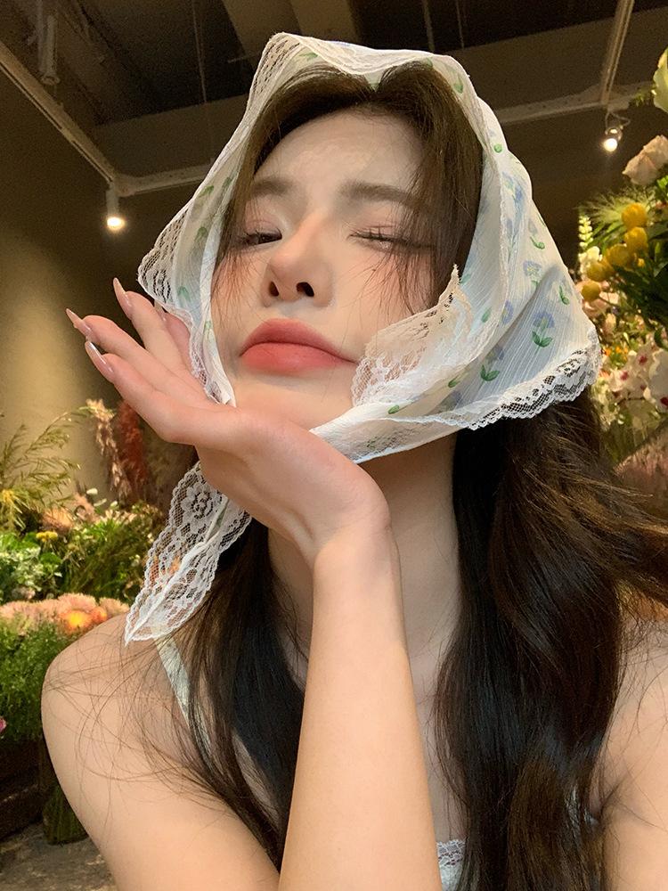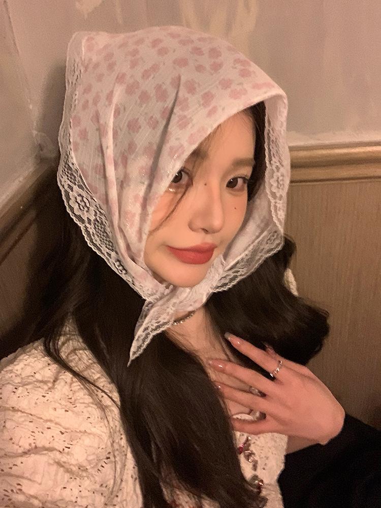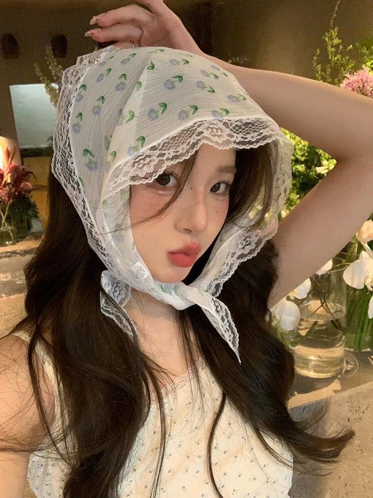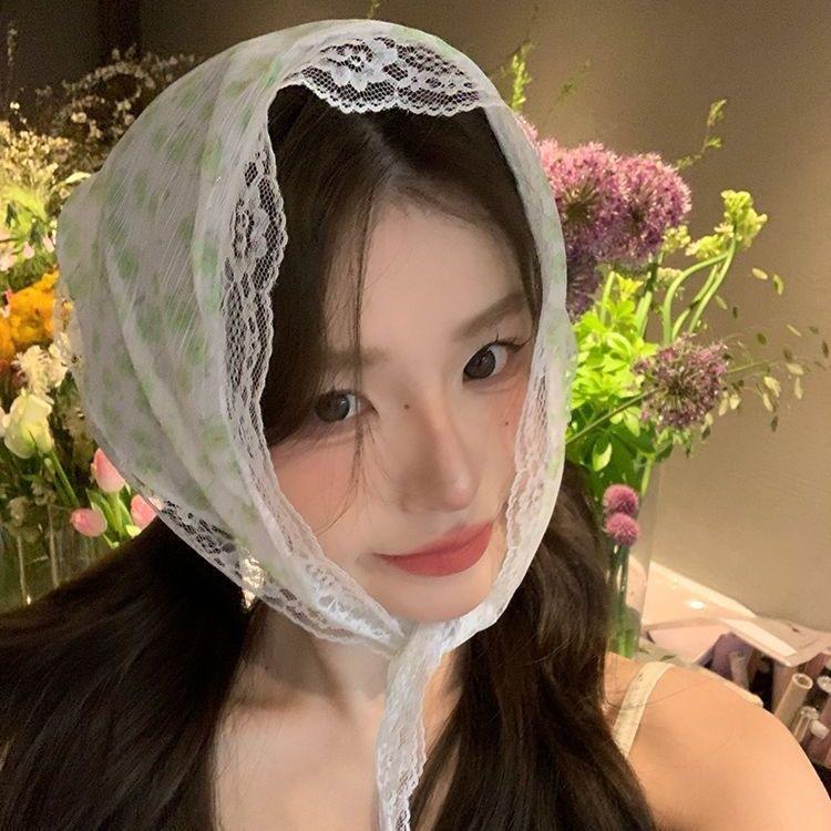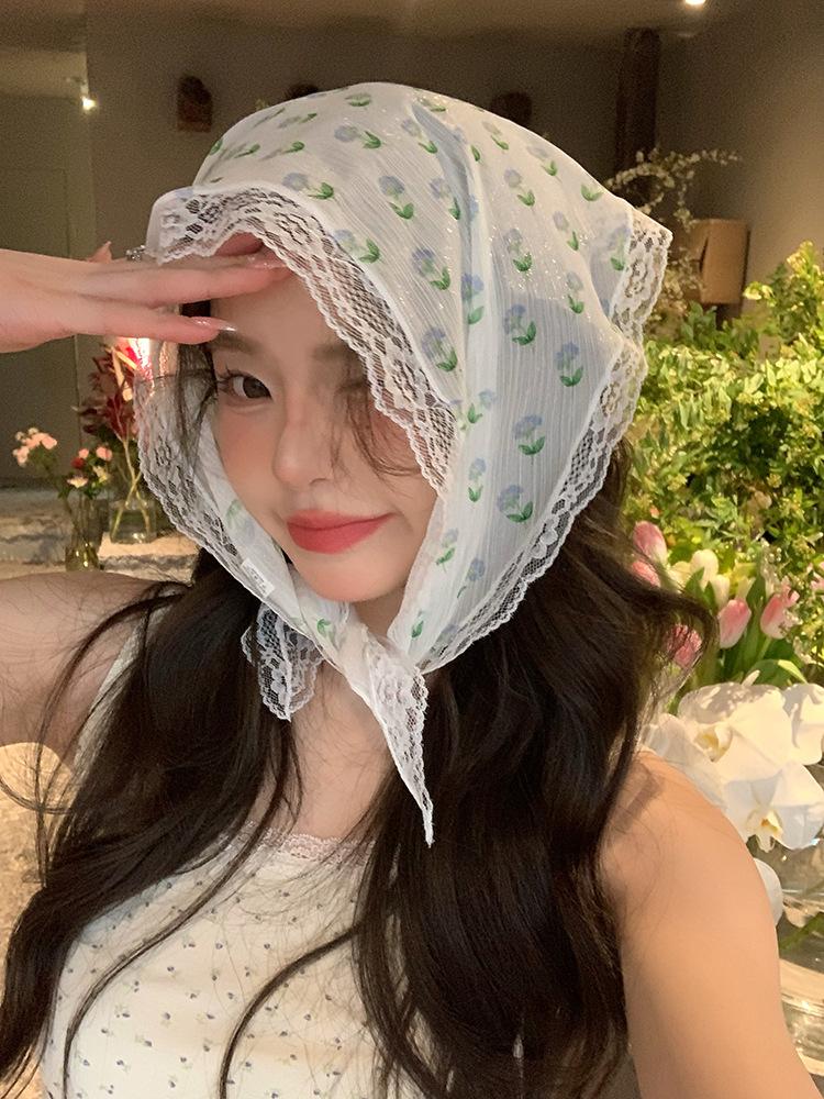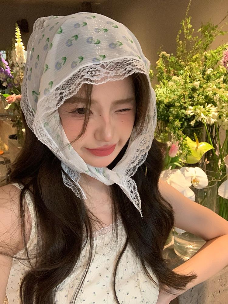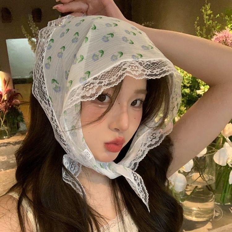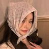 Pañuelo triangular de encaje floral estilo francés vintage para mujer, estilo pastoral Baotou de verano, para playa y playa.