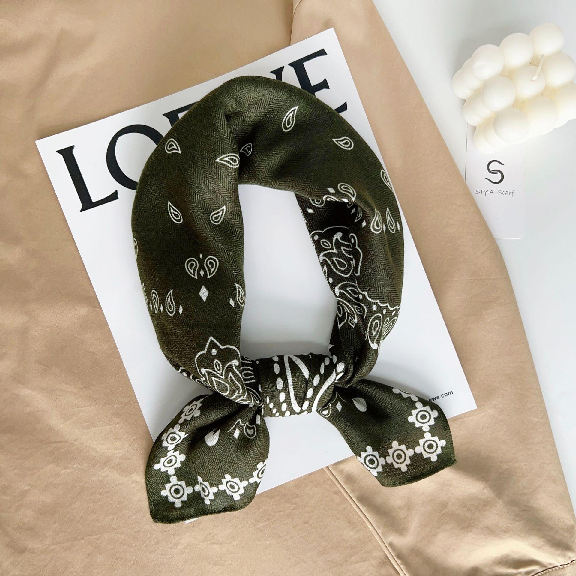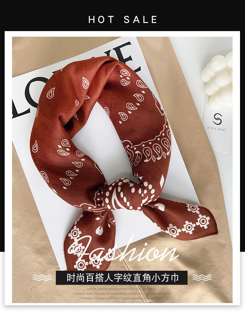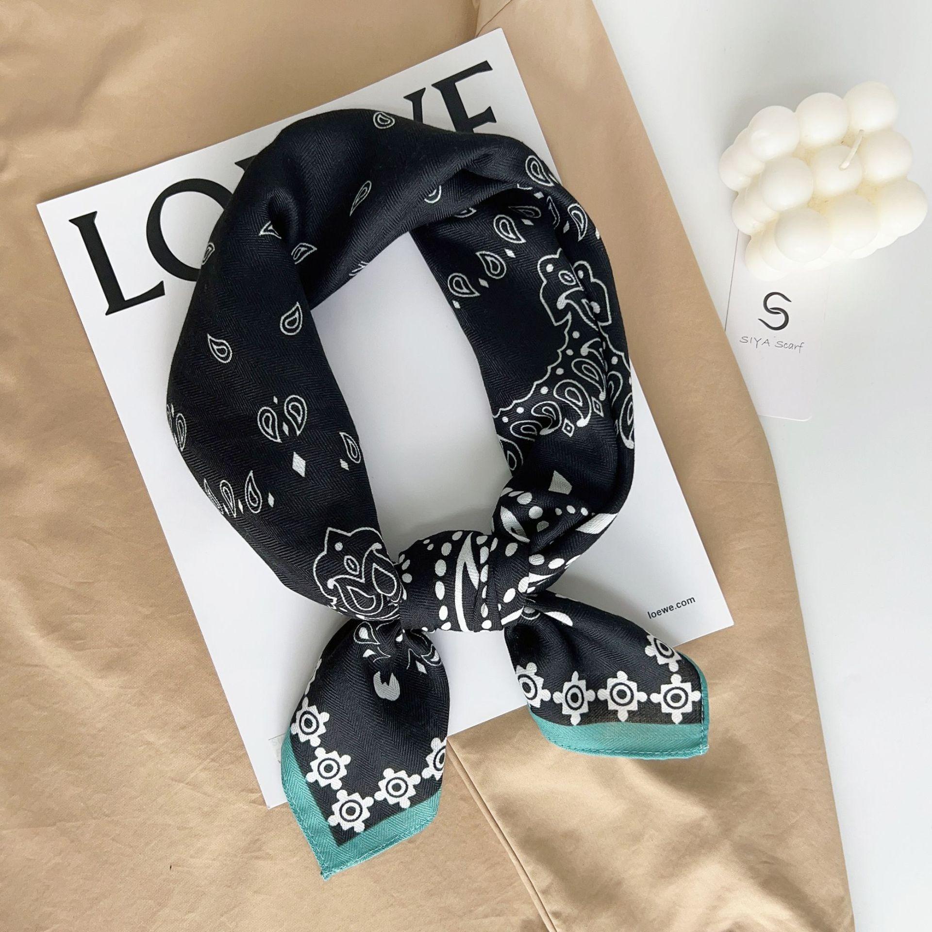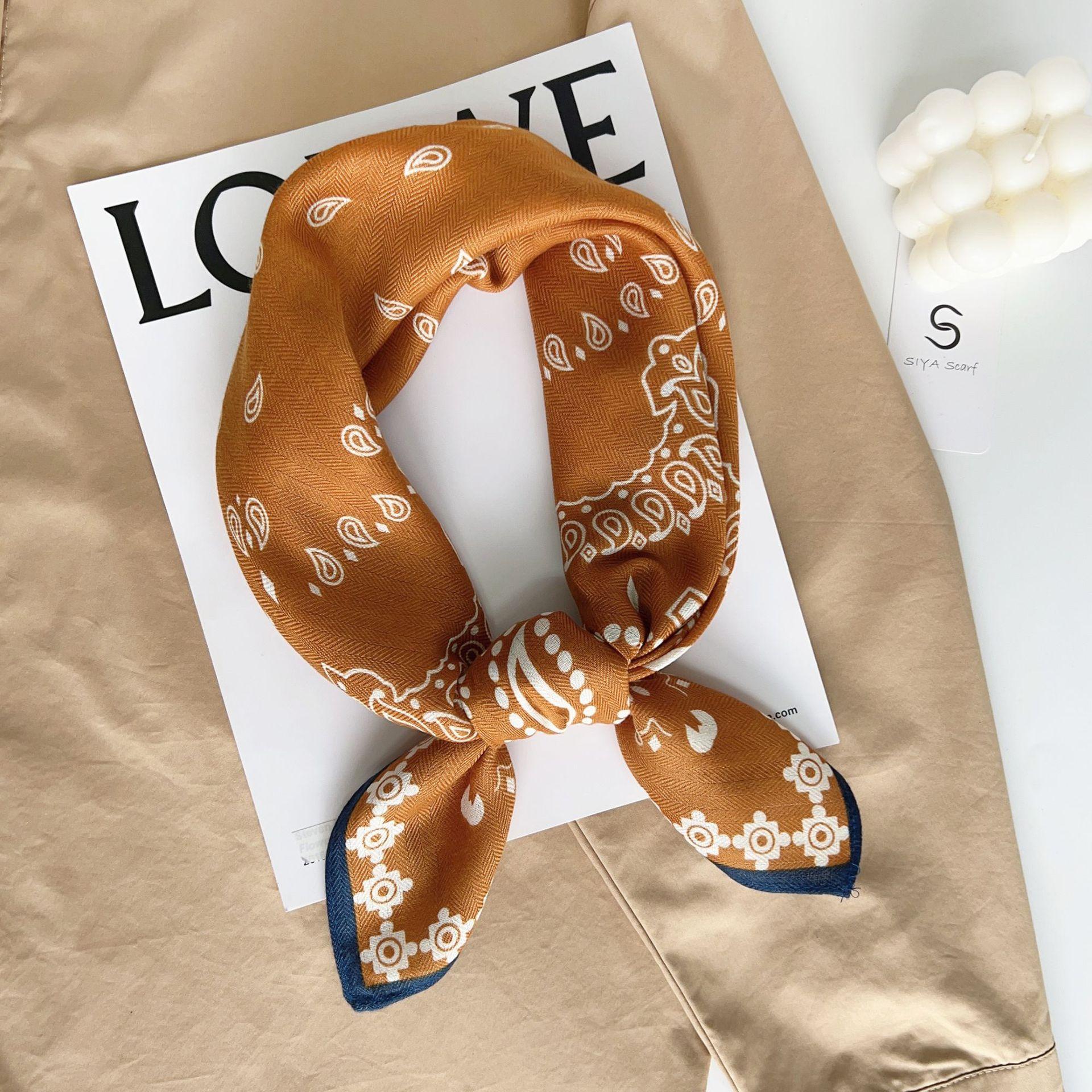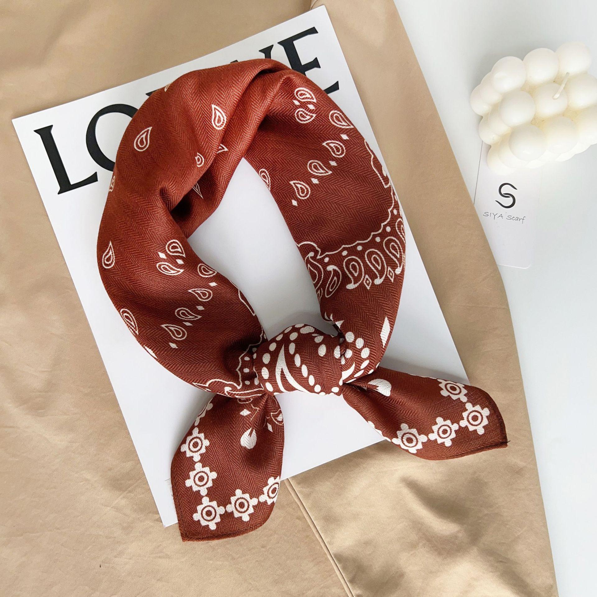 Pañuelo cuadrado pequeño de 70 cm para mujer, nuevo pañuelo de seda para primavera y otoño, protección para el cuello, pañuelo pequeño de Corea del Sur, banda para el pelo retro de anacardo con combinación artística.