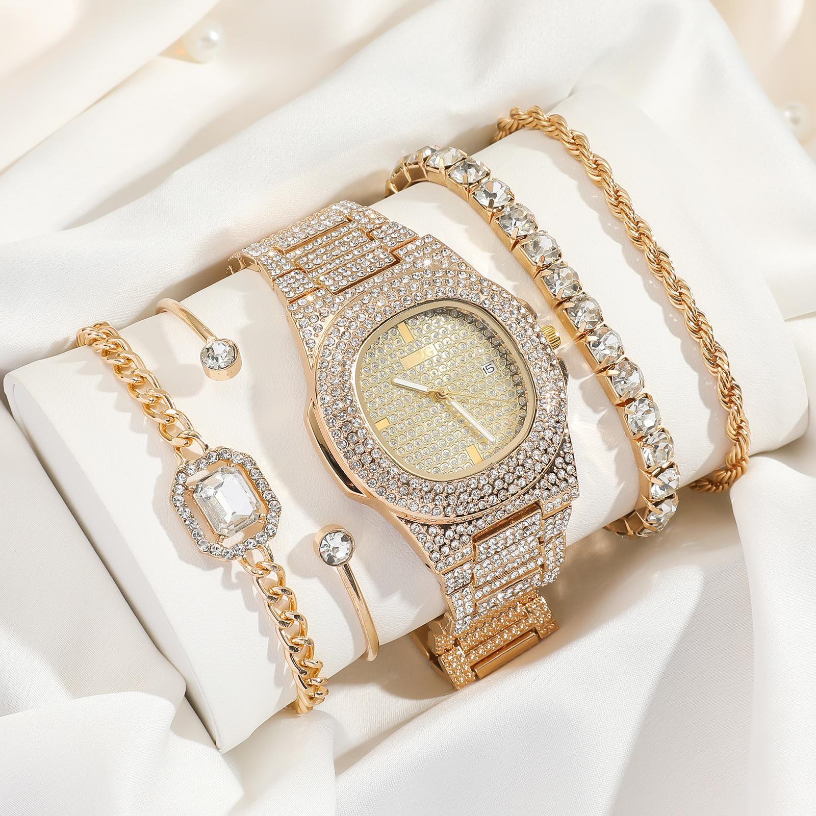 Set de Pulsera de Reloj para Mujer Lleno de Diamantes y Diamantes Esfera Grande Correa de Acero Reloj de Cuarzo Exquisito Cronometraje Romántico