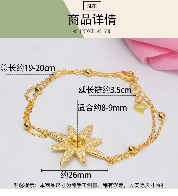 La longitud total es de aproximadamente 19-20 cm, la longitud de la cadena de extensión es de aproximadamente 3,5 cm, el ancho de la forma de flor del medio es de aproximadamente 26 mm, adecuado para cuentas redondas de 8-9 mm o cuentas de pan,