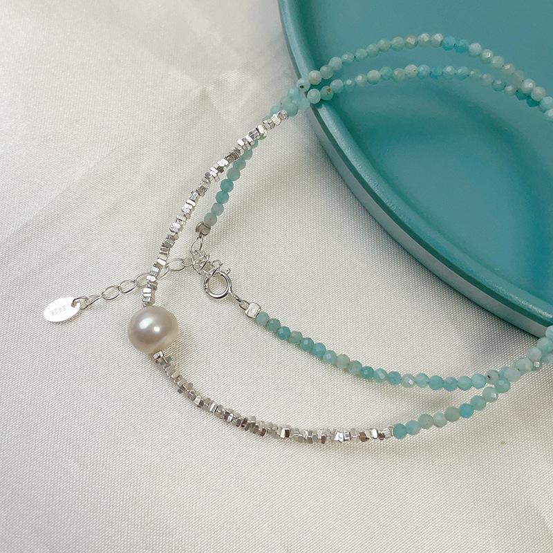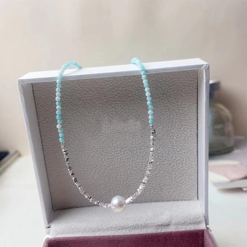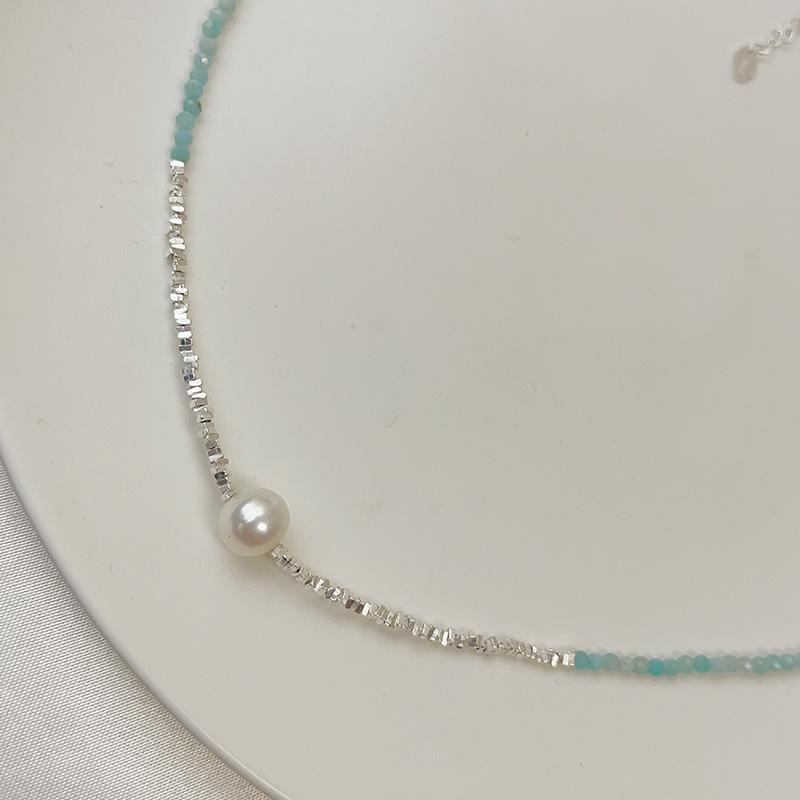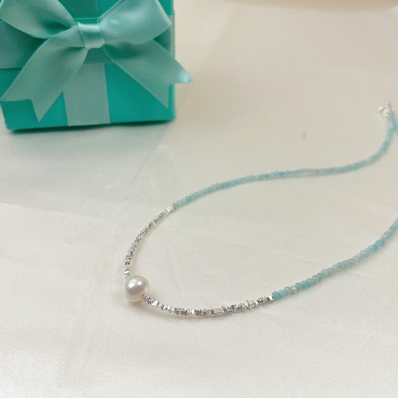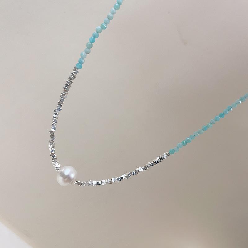 Collar de perlas naturales de agua dulce con piedra de color azul en plata esterlina S925, con costuras de plata rota para mujer, cadena de clavícula ligera de lujo 2023.