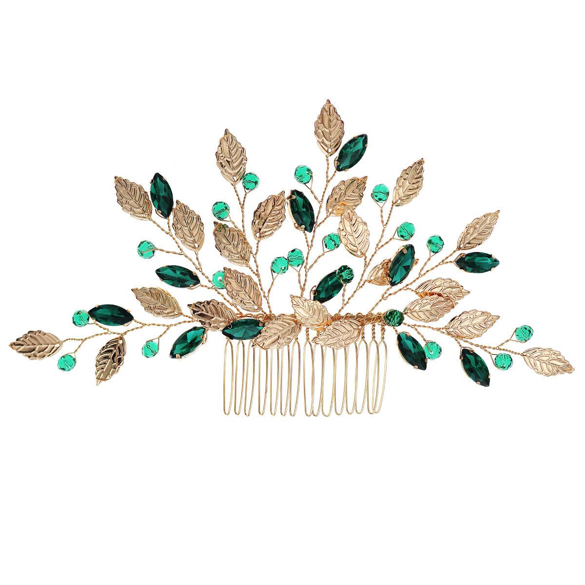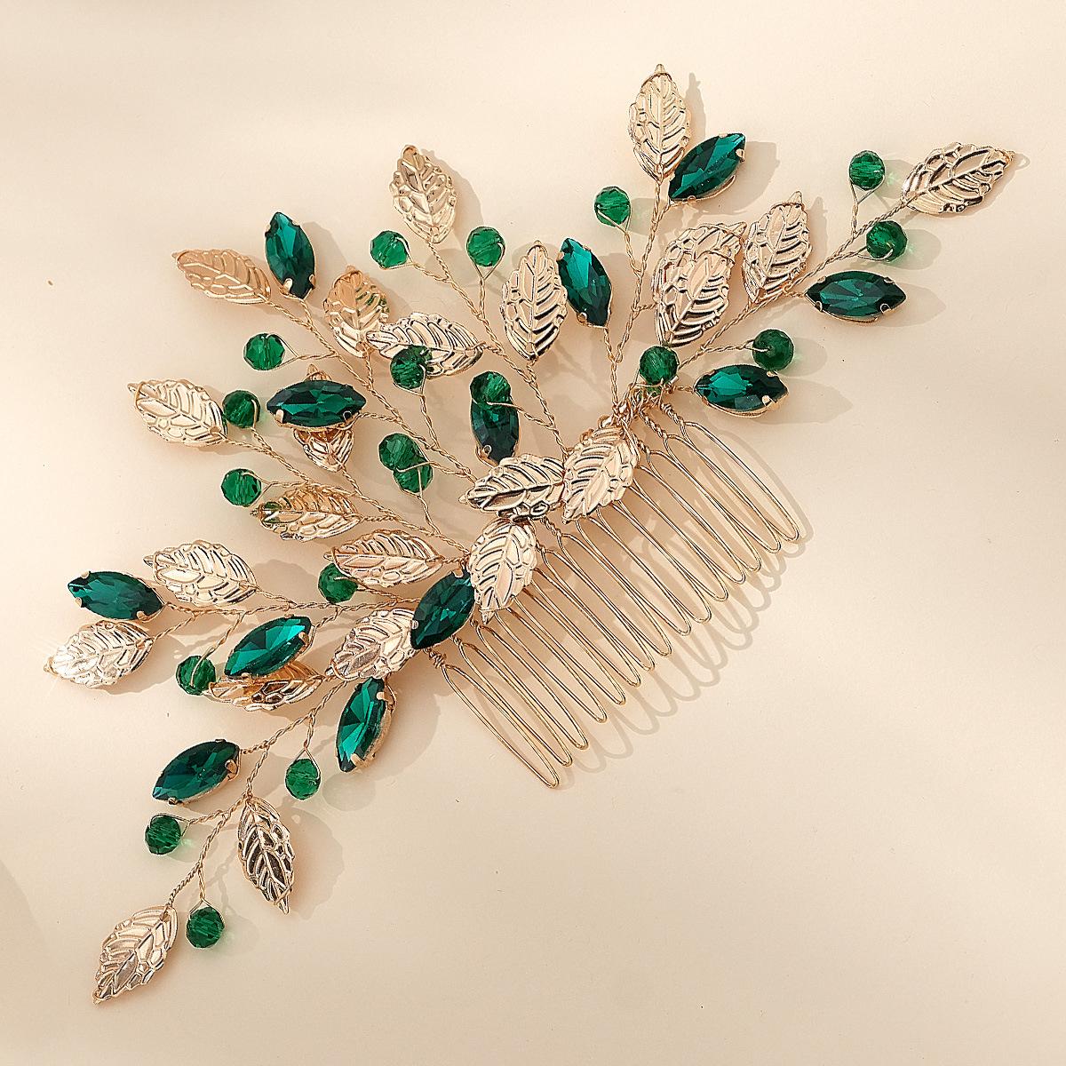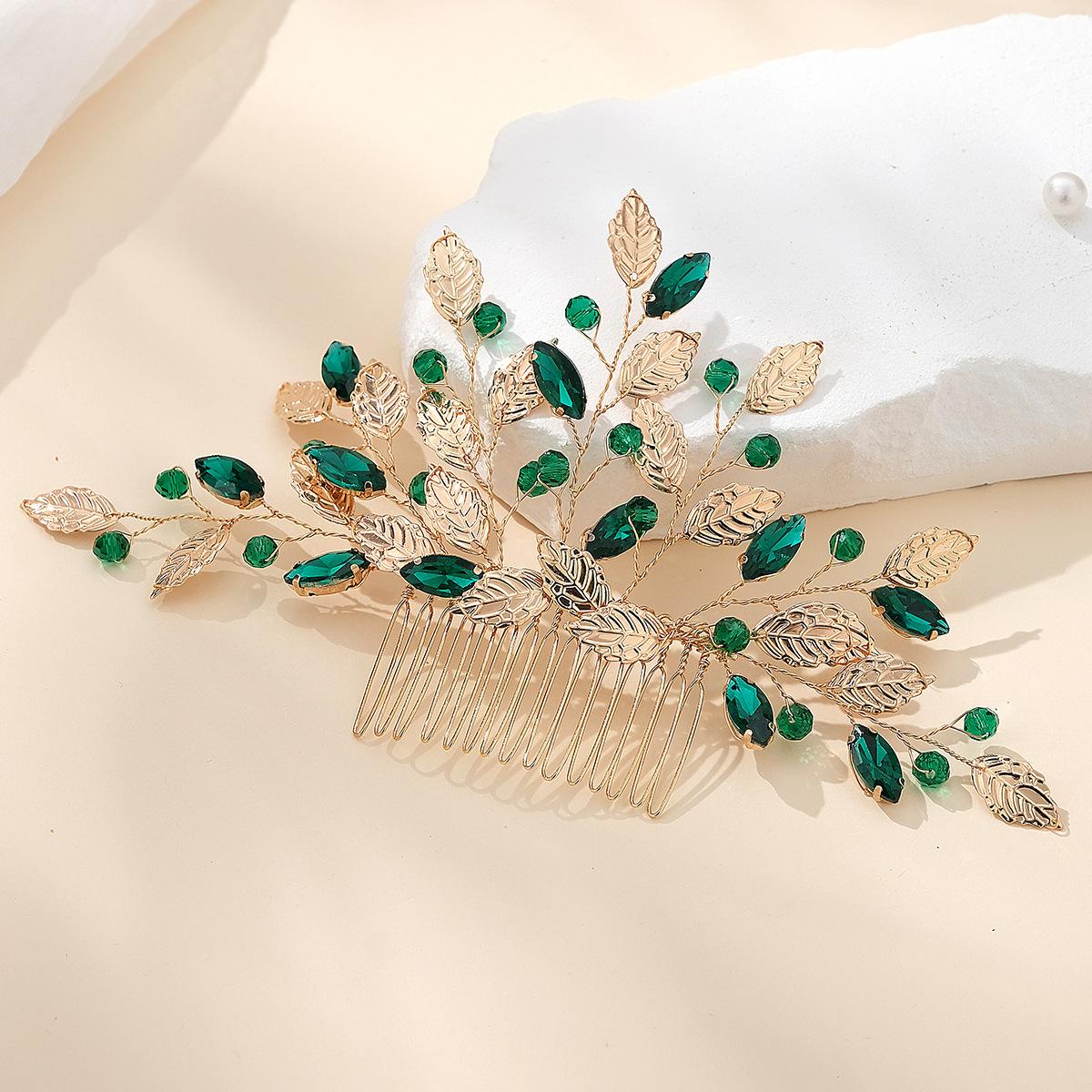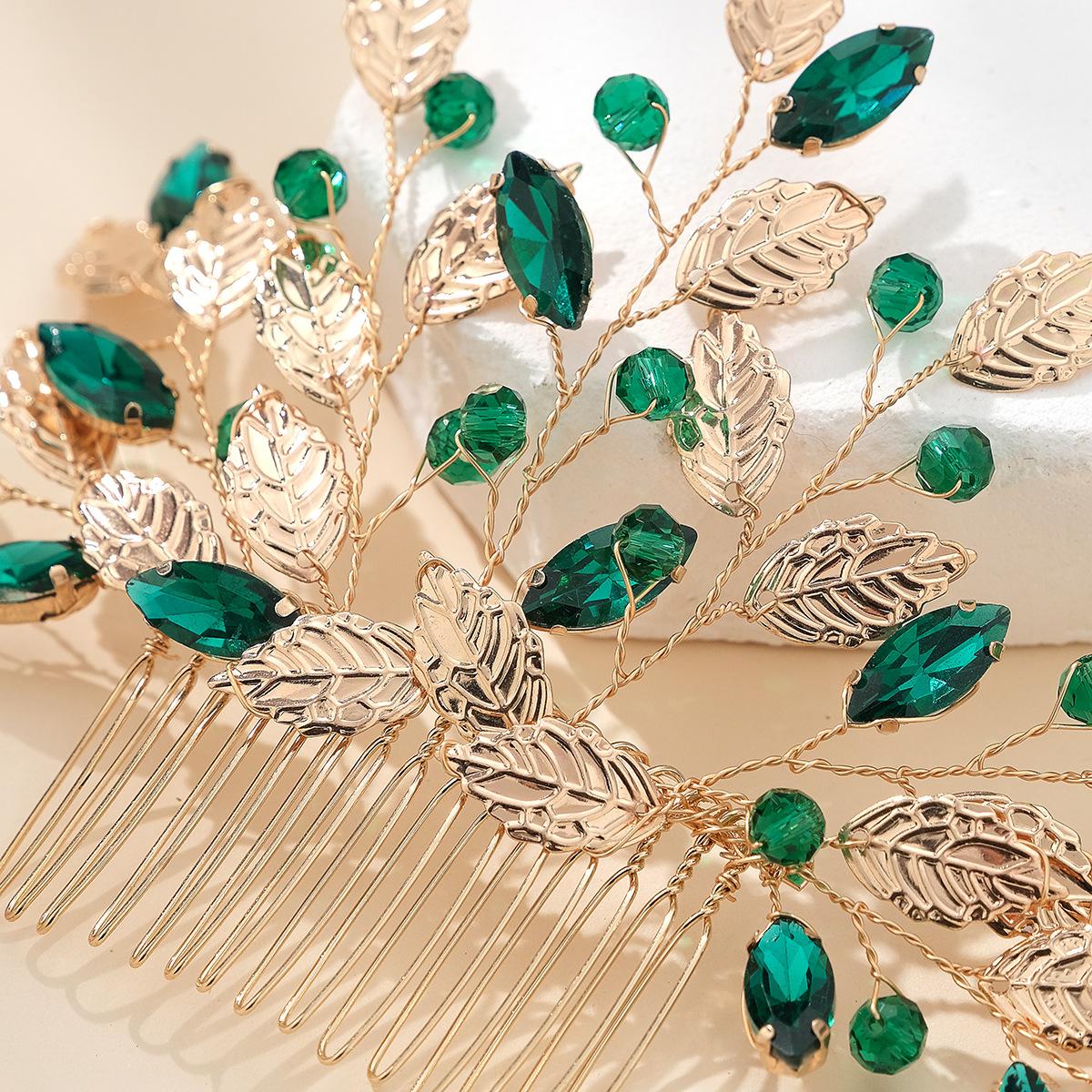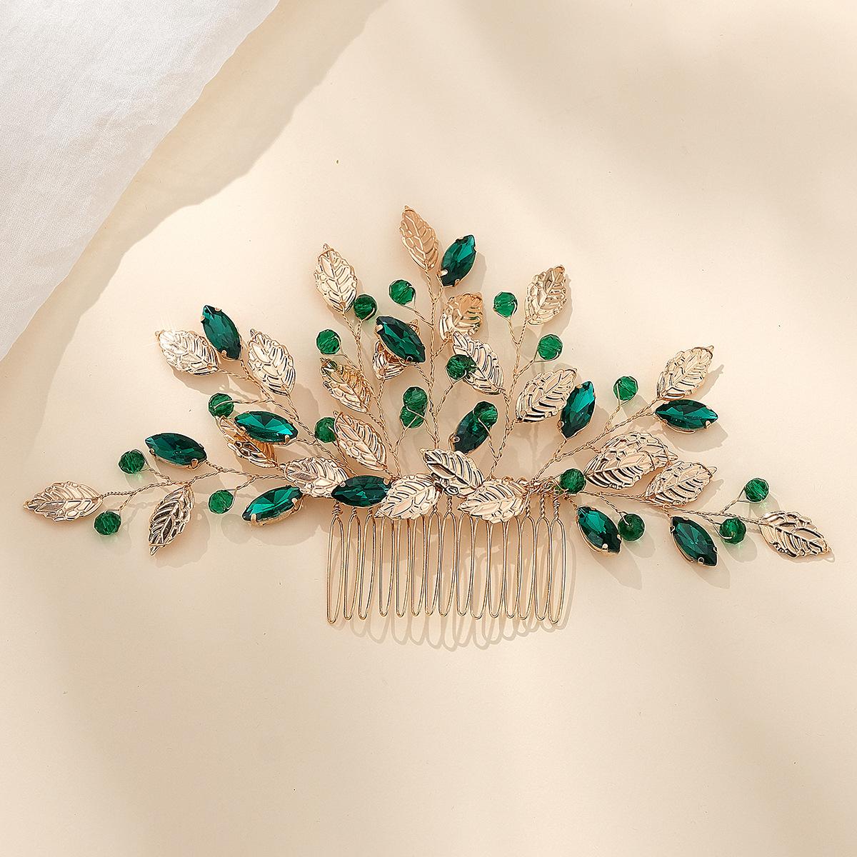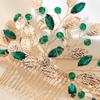 Nuevo Accesorio para el Cabello Nupcial Transfronterizo Horquilla para el Cabello de Boda Xiuhe Peine de Inserción Simple de Hoja Dorada Cristal Verde para Mujer
