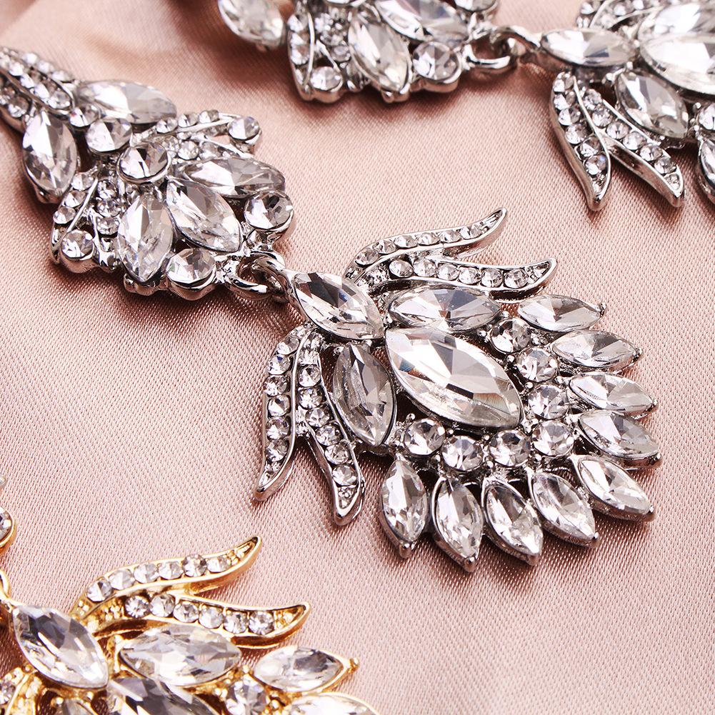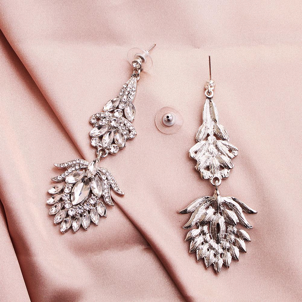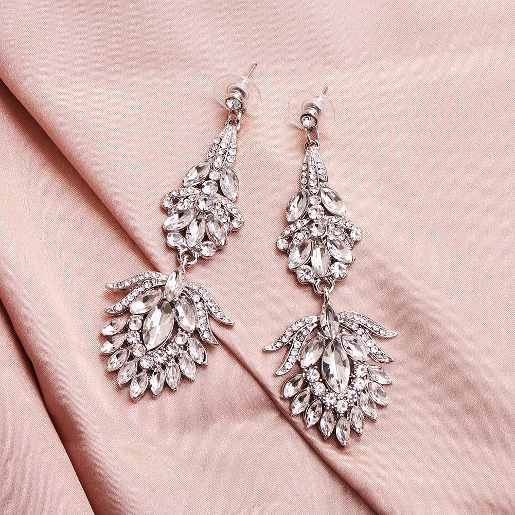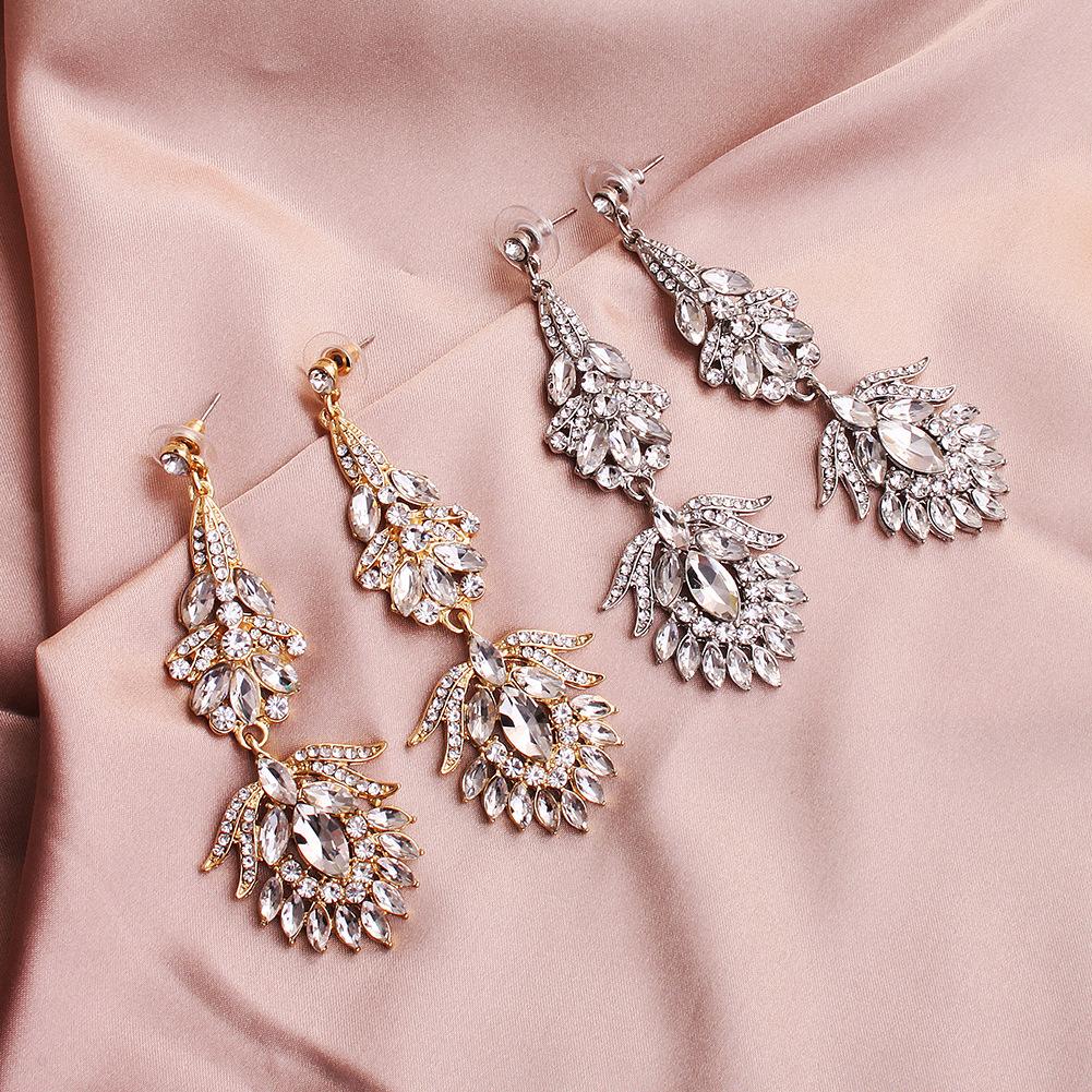 Pendientes de diamantes de imitación de lujo exagerados de estilo europeo y americano, con diseño de moda, de aleación y plumas, que combinan con todo, con fotos de vestidos de novia.