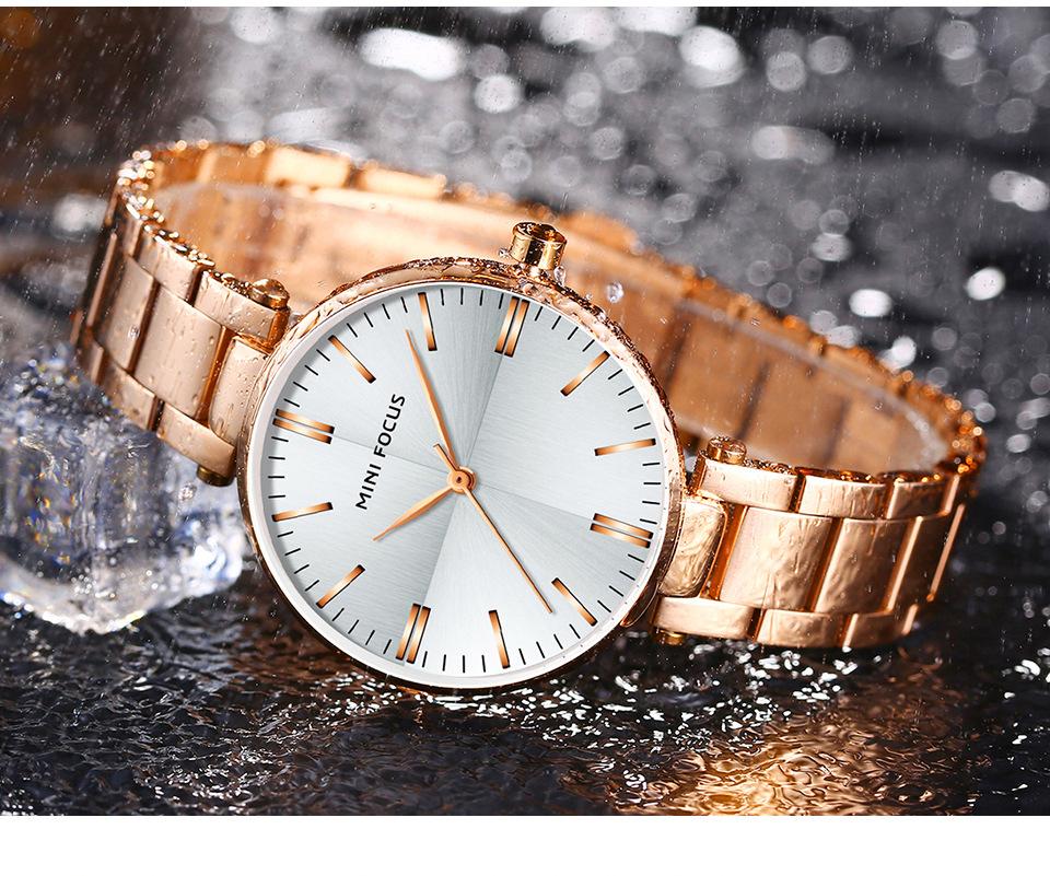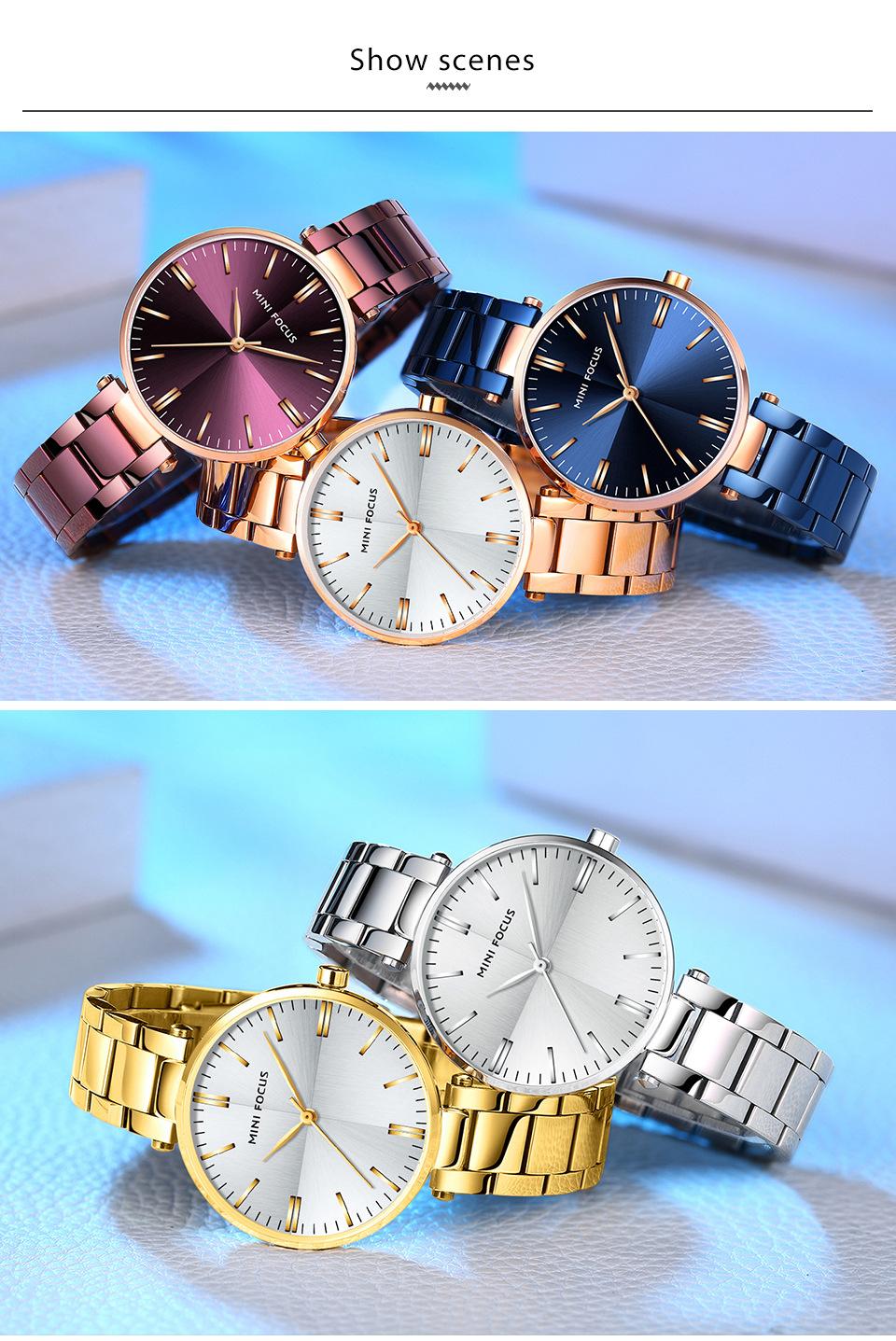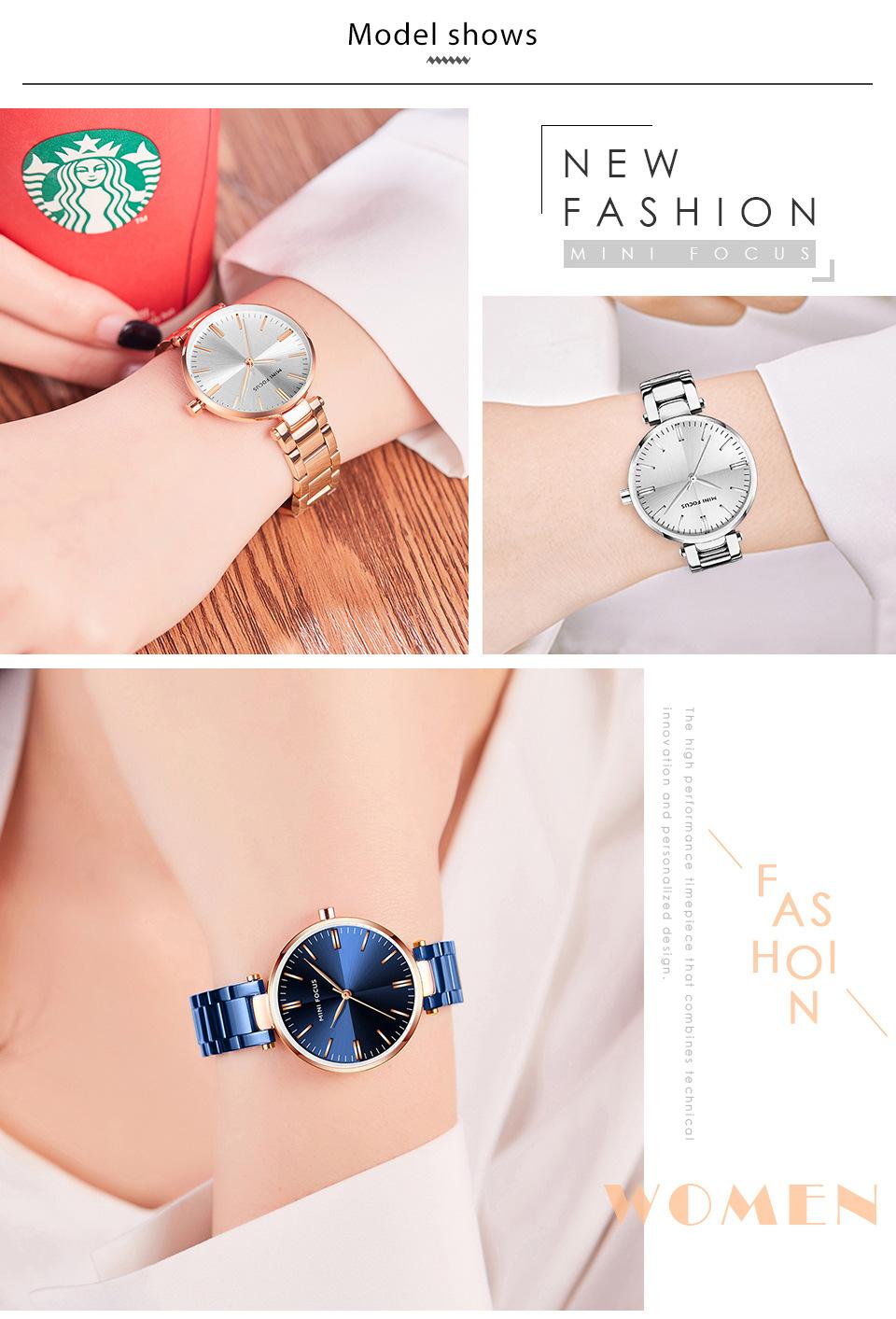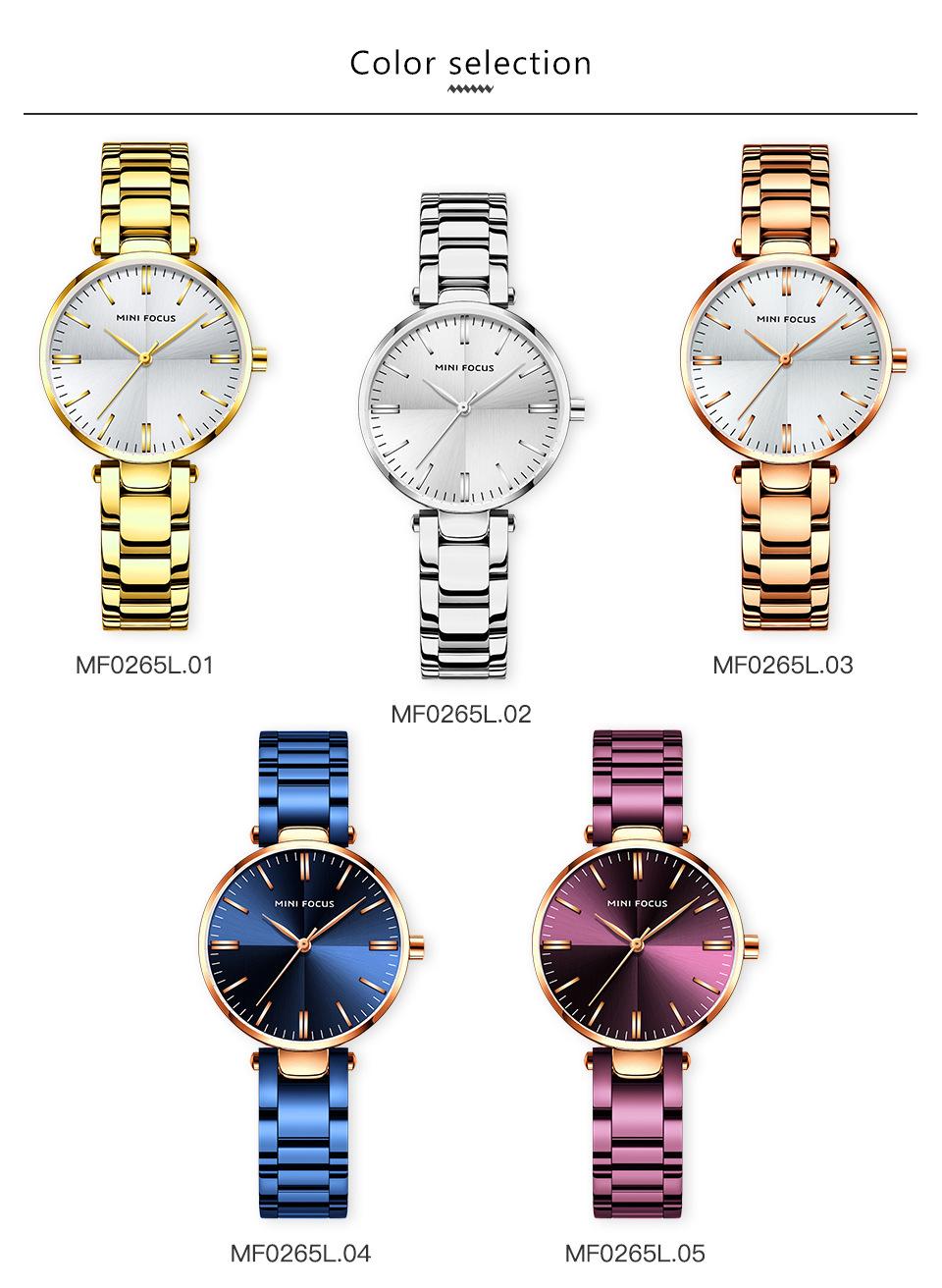 Compra Reloj de pulsera MINI FOCUS para mujer, de negocios, de moda, con movimiento japonés, resistente al agua, con patrón solar, correa de acero inoxidable 0265L al por mayor en Joom.pro