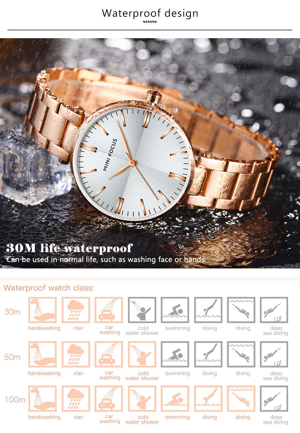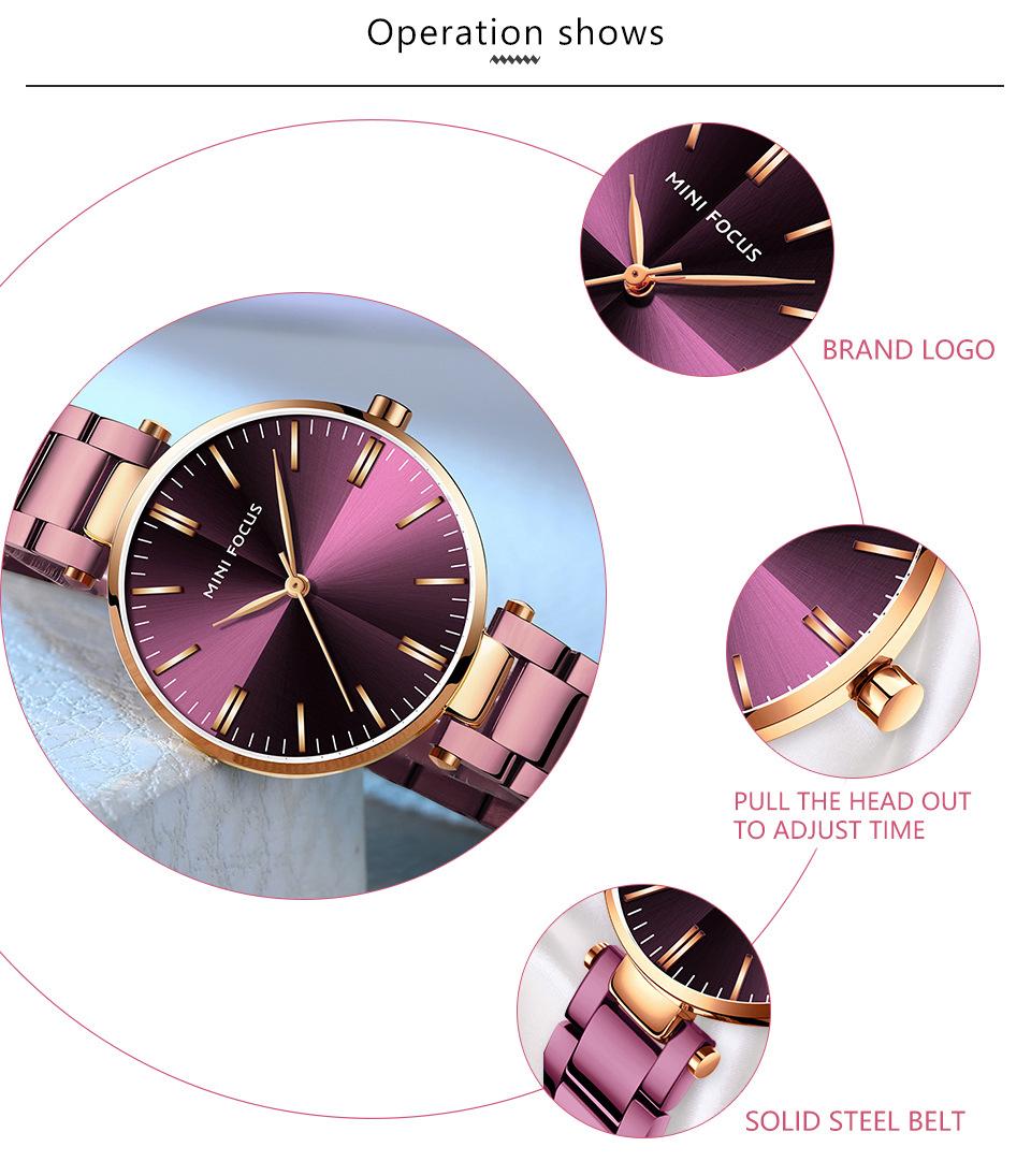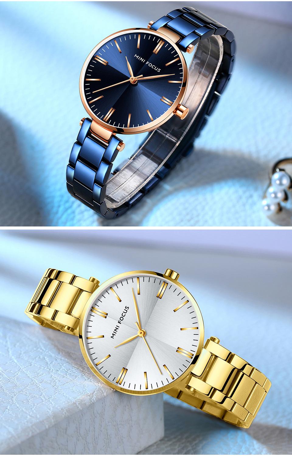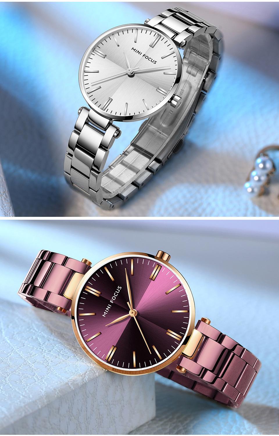 Compra Reloj de pulsera MINI FOCUS para mujer, de negocios, de moda, con movimiento japonés, resistente al agua, con patrón solar, correa de acero inoxidable 0265L al por mayor en Joom.pro