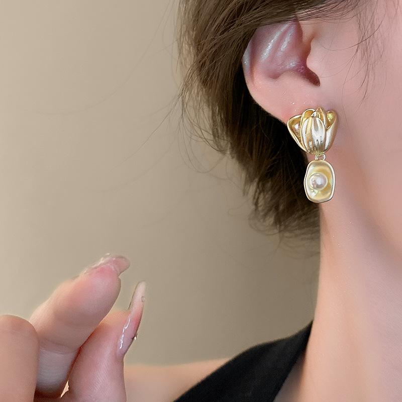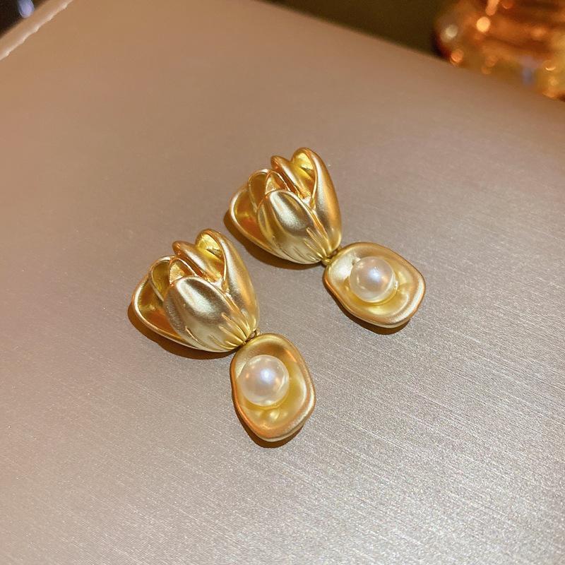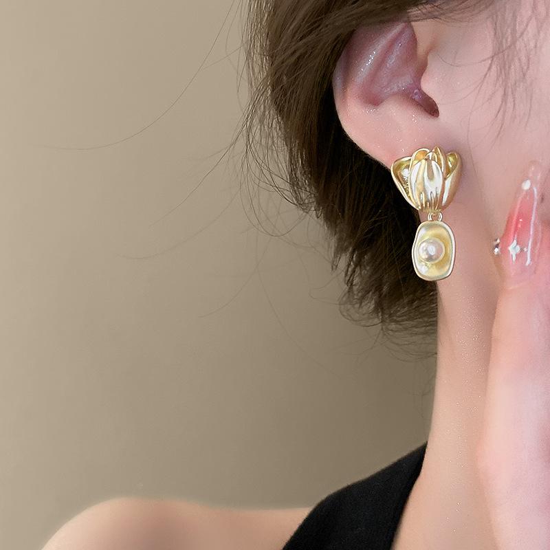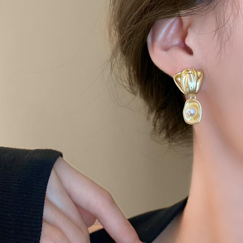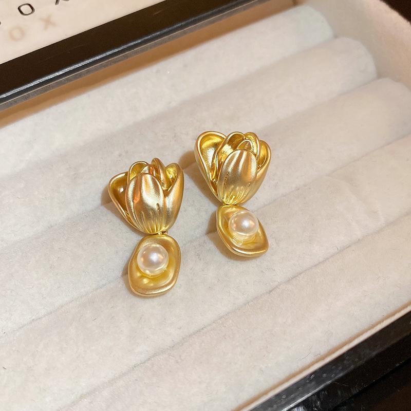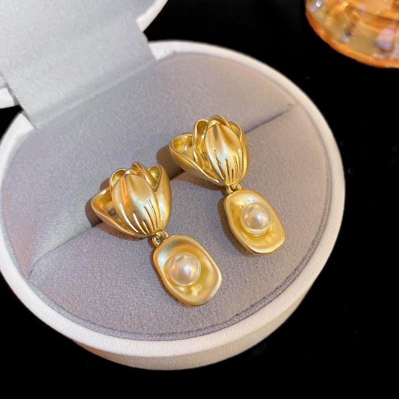 Compra Pendientes de perlas de flores doradas 2023, nuevos pendientes populares, pendientes únicos de alta calidad, diseño de nicho femenino con sentido al por mayor en Joom.pro