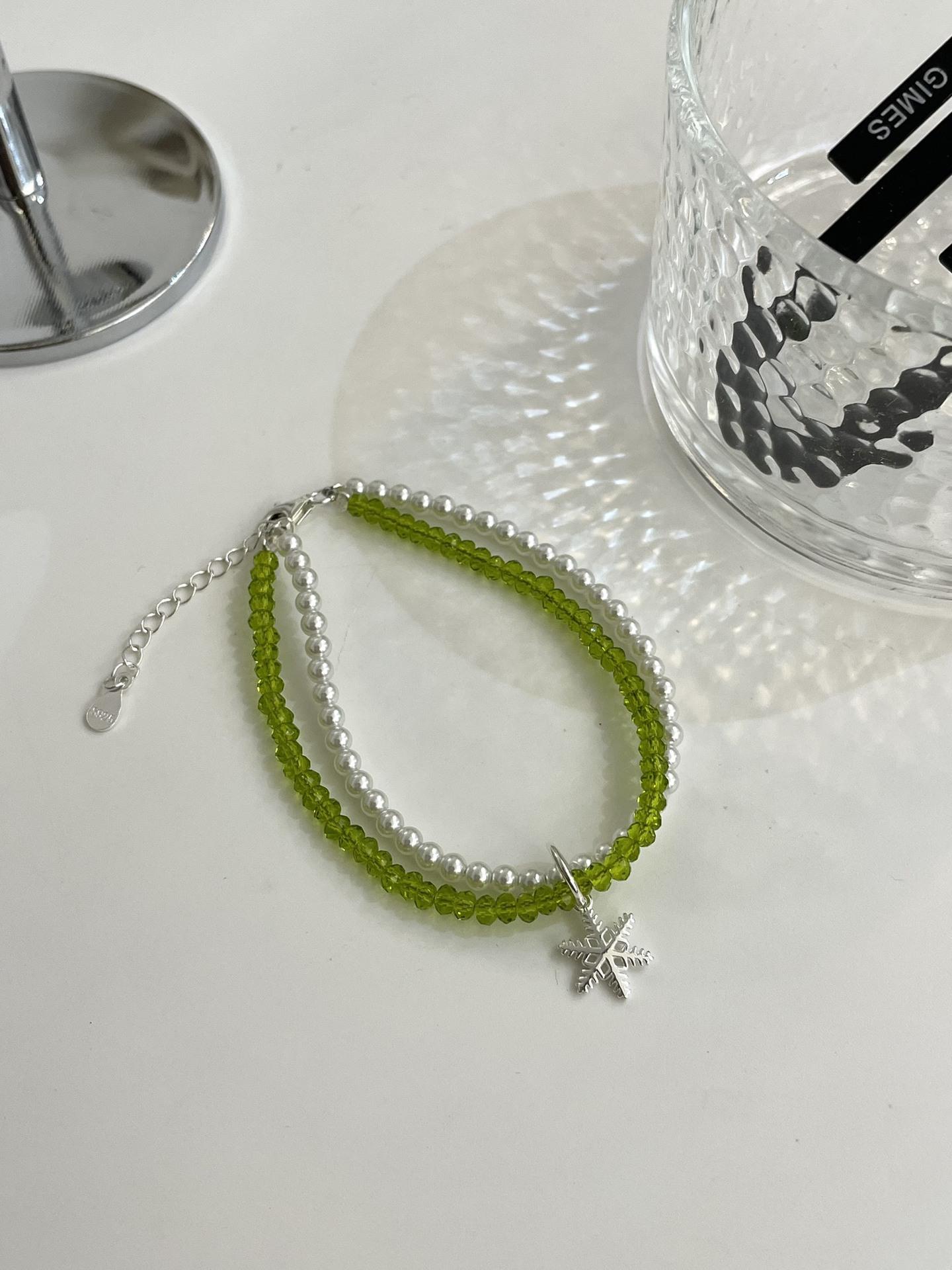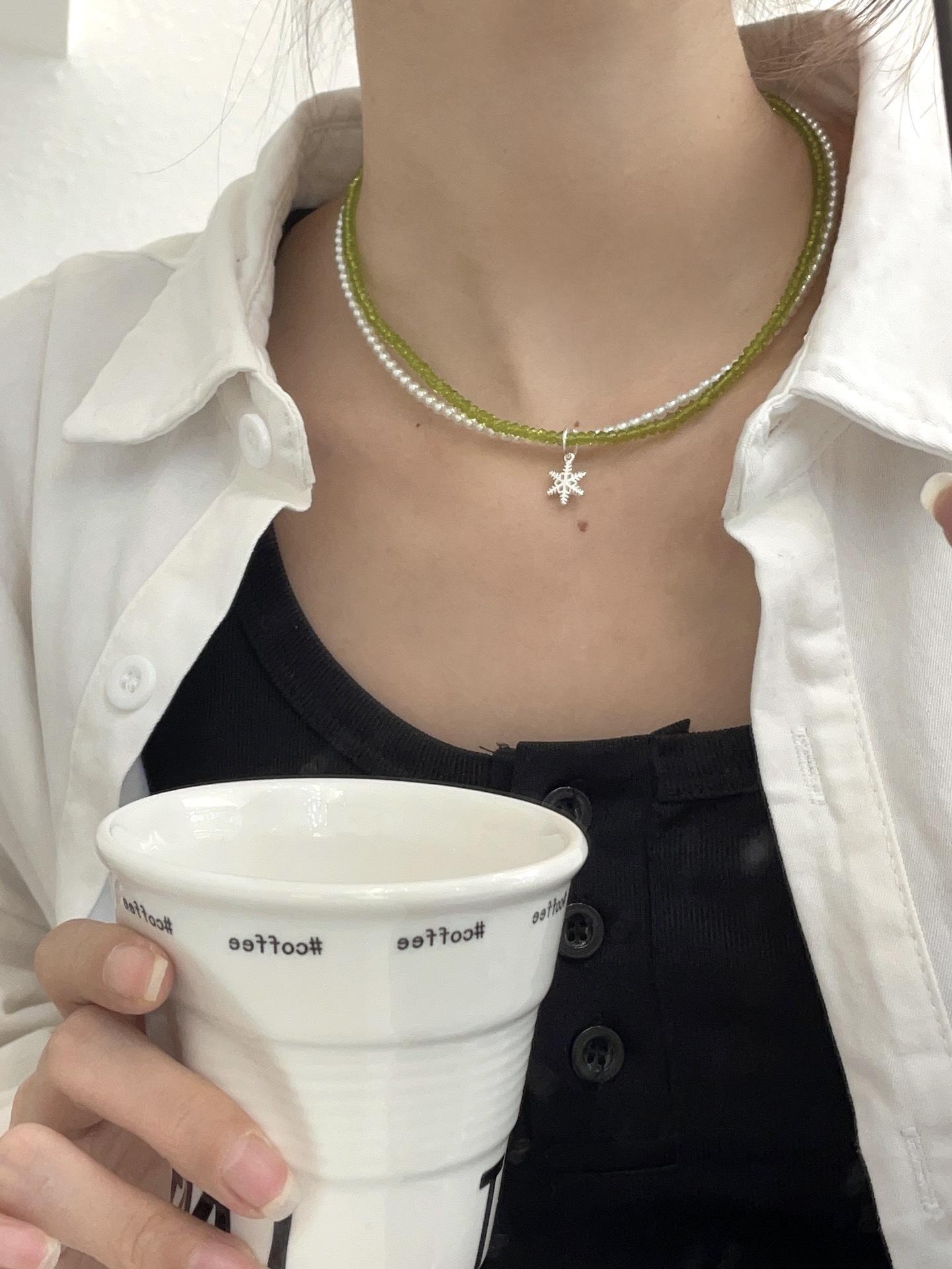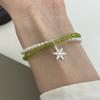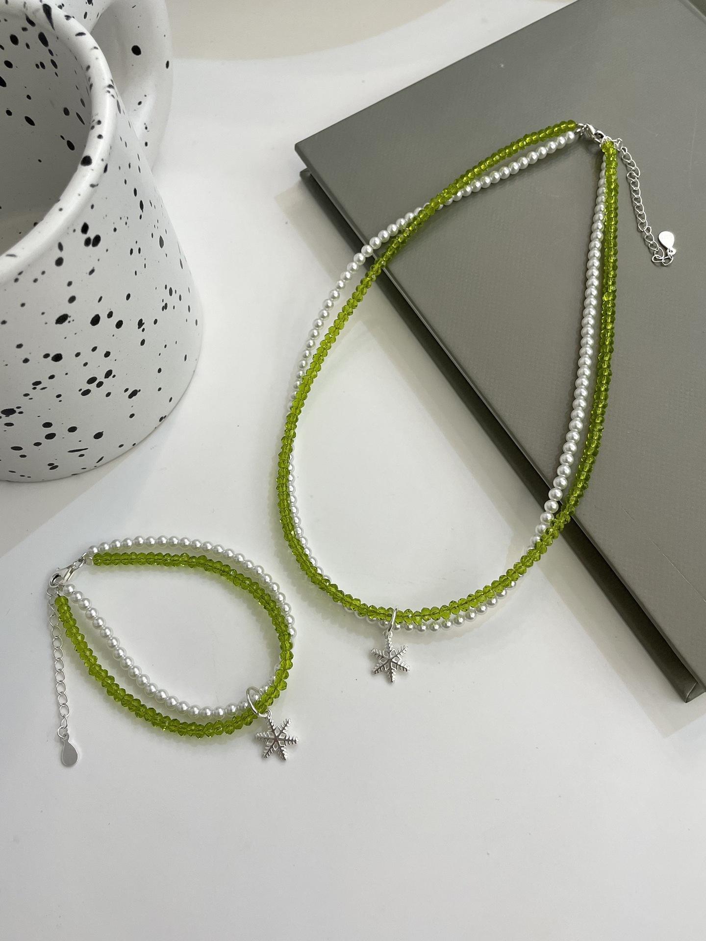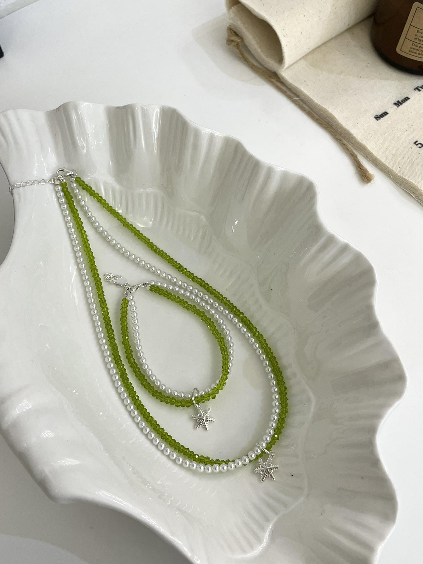 Collar y pulsera de plata de ley S925 con forma de copo de nieve, color verde oliva y perla Shijia de doble capa, ideal para combinar con todo.