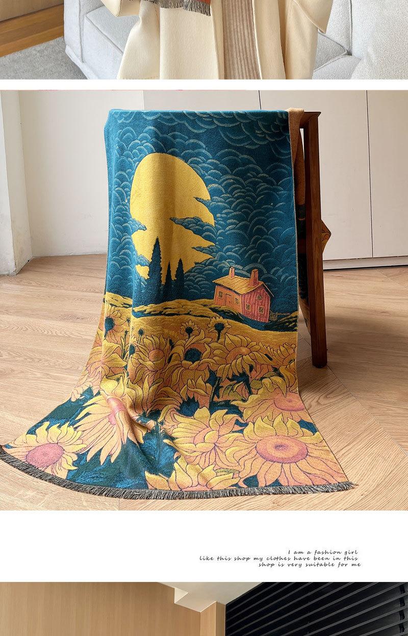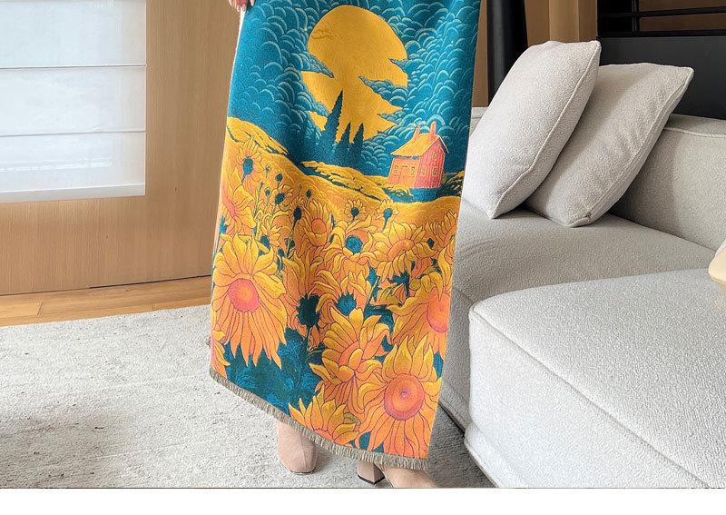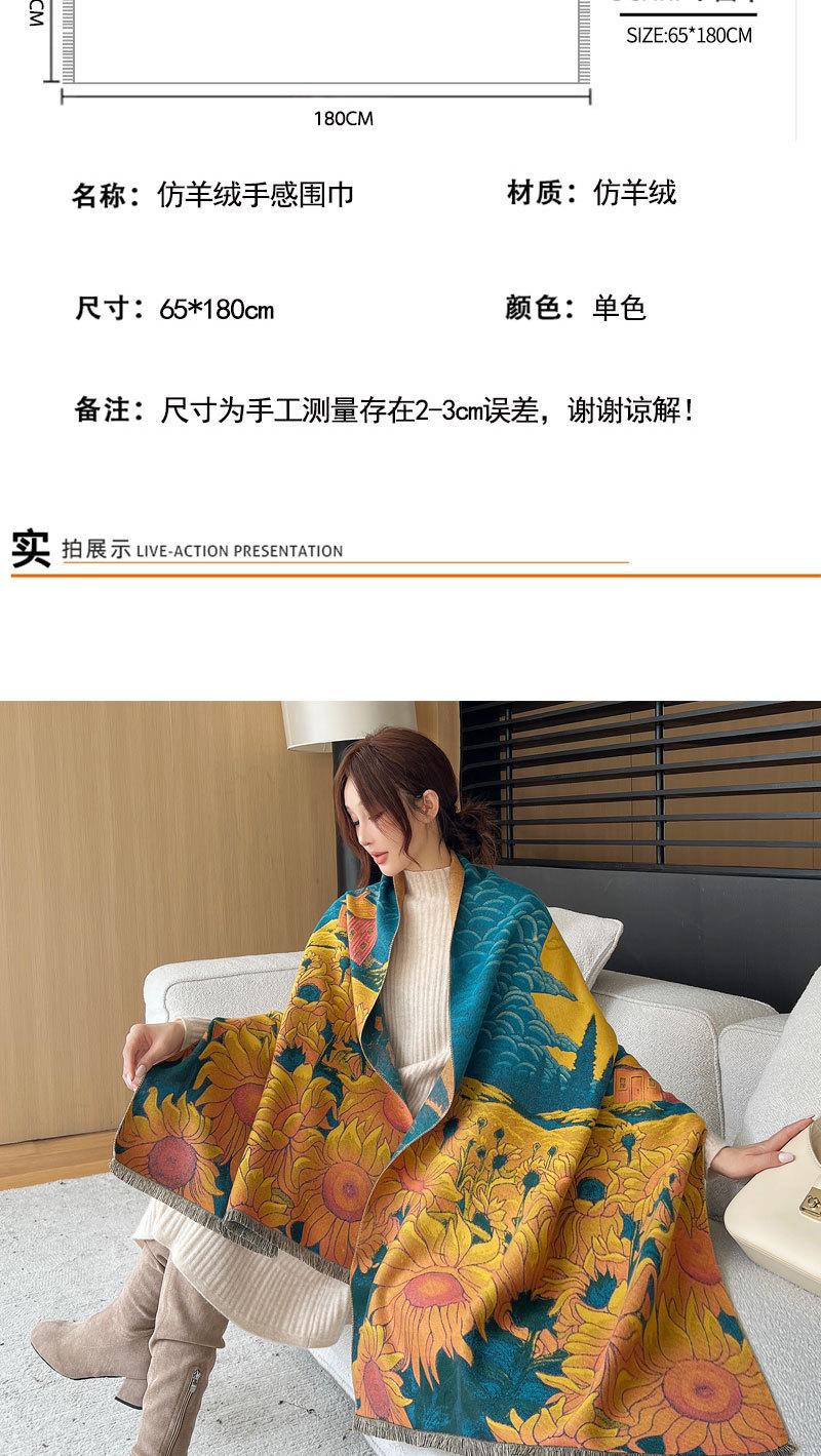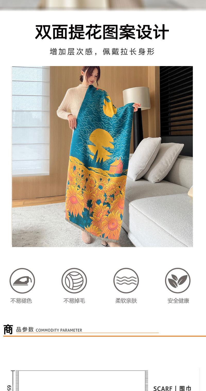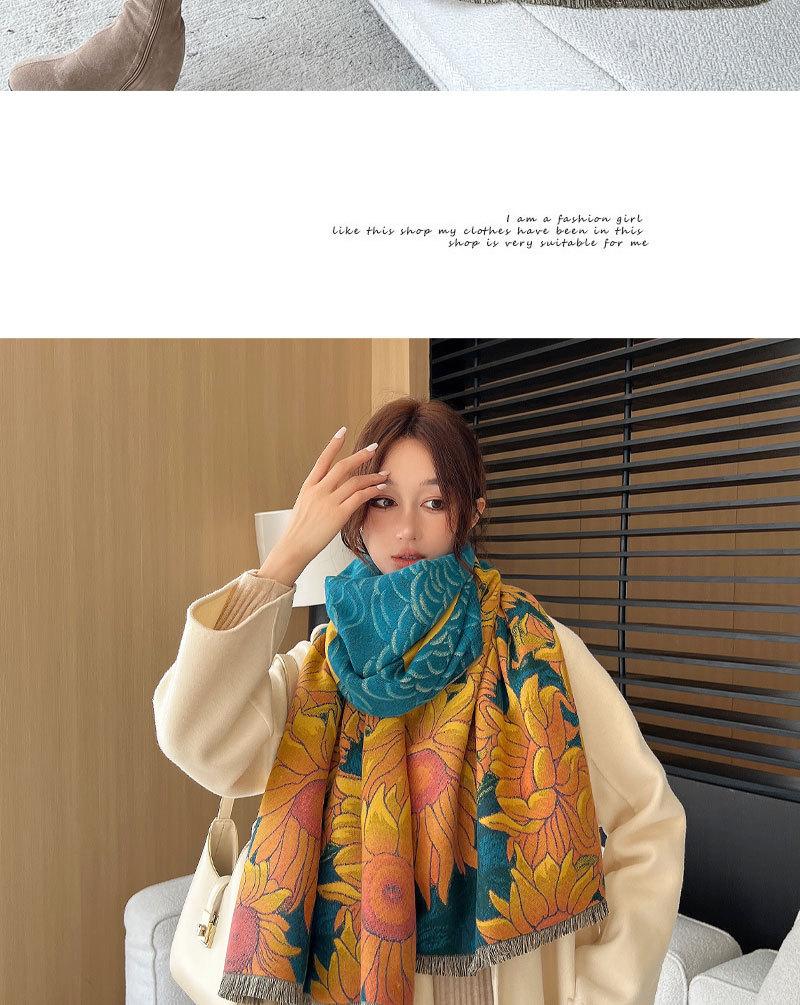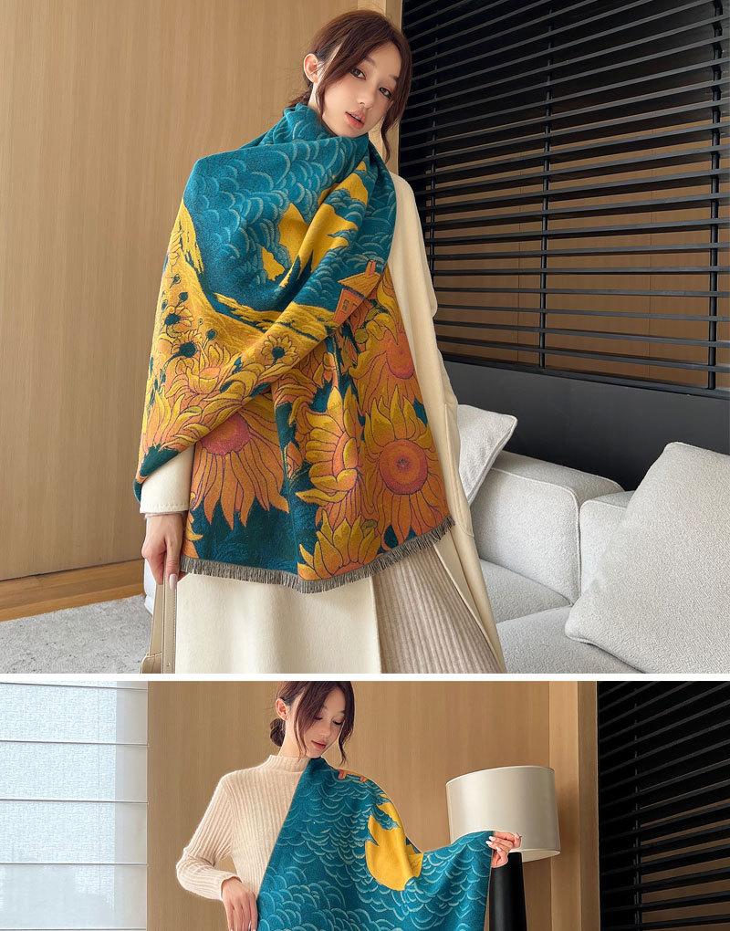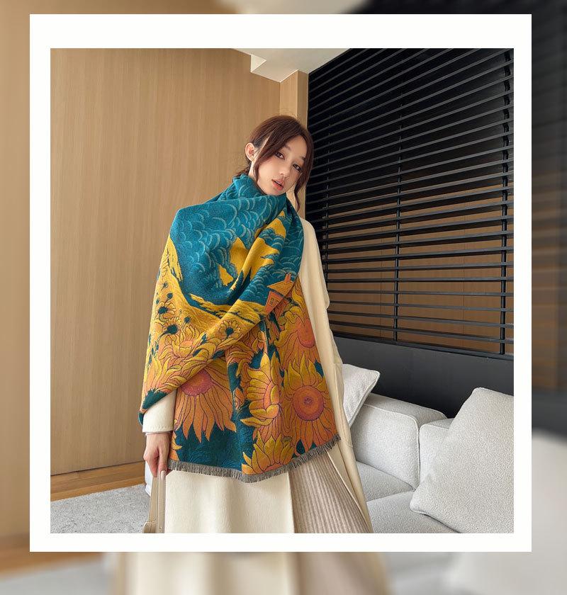 Otoño e invierno Nuevo chal jacquard de pintura al óleo de girasol para mujer, chal de alta calidad tipo cachemira, bufanda gruesa y cálida versátil