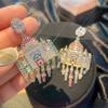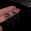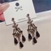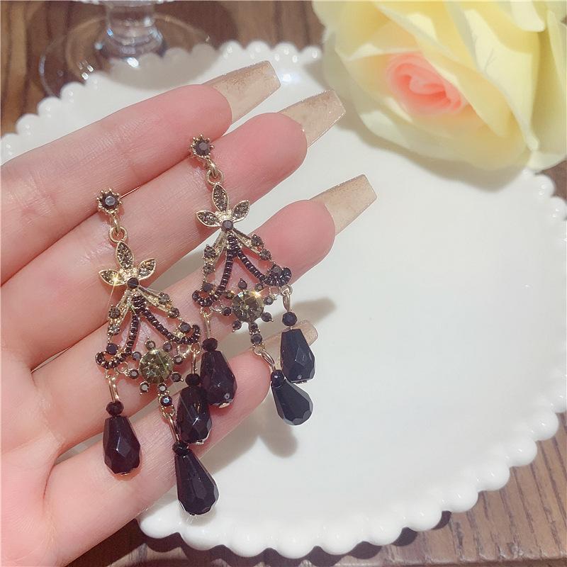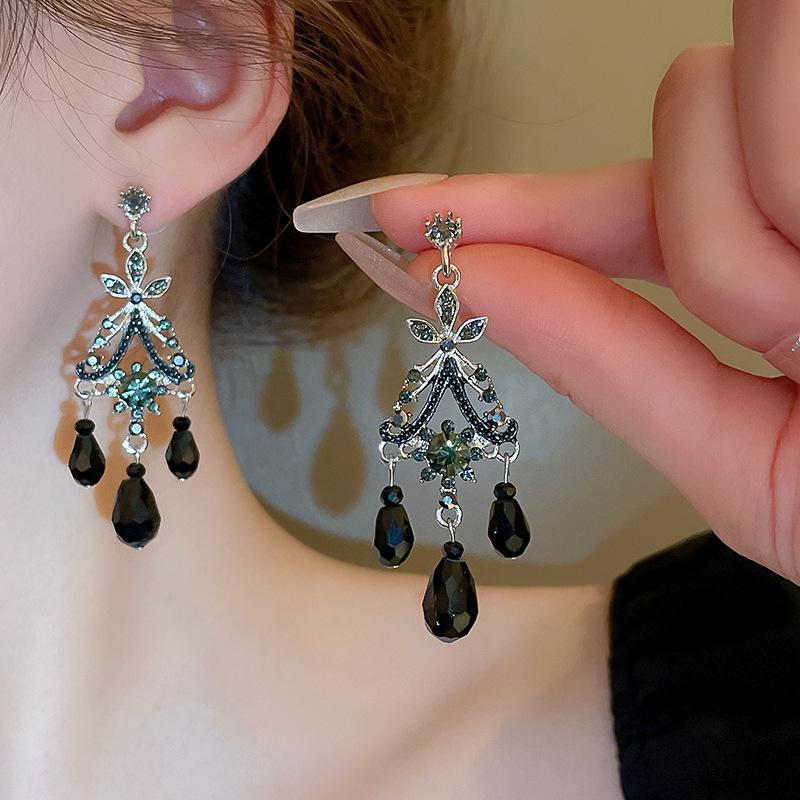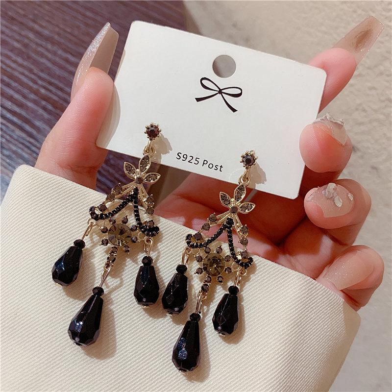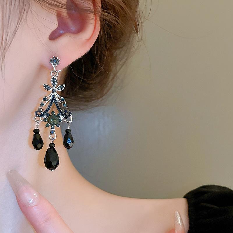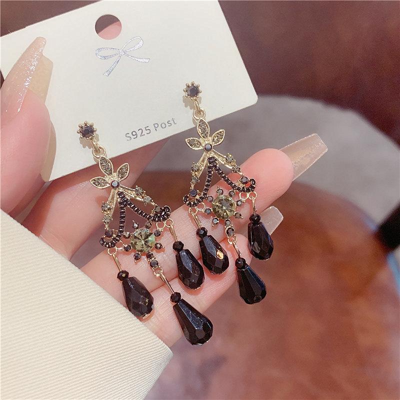 Aretes de Cristal Negro Estilo Palacio Retro de Plata S925 para Mujer, Aretes Largos de Borla de Diseño Nicho de Alta Gama