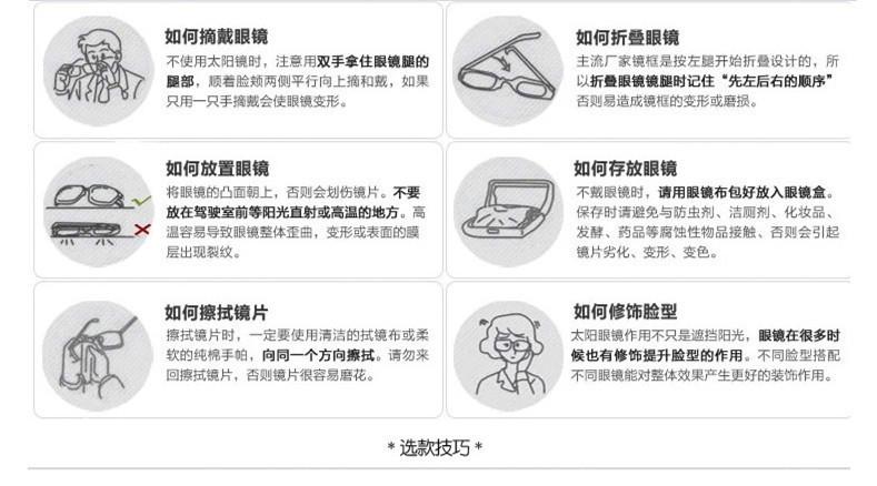 De hecho, el cuidado de las gafas de sol es similar al de las gafas normales. Limpiarlas, doblarlas y guardarlas debe convertirse en un hábito. Sin embargo, las gafas de sol se quitan y se ponen con frecuencia, y si no se tiene cuidado, se rayan. Por lo tanto, hay algunos pequeños detalles que me gustaría recordarles: si las gafas de sol tienen manchas, no las toquen con las uñas, ya que es fácil rayarlas.