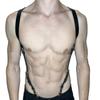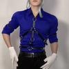 Estudiante de Internet con una celebridad versátil, ropa de cuero, accesorios, cinturones y tirantes.