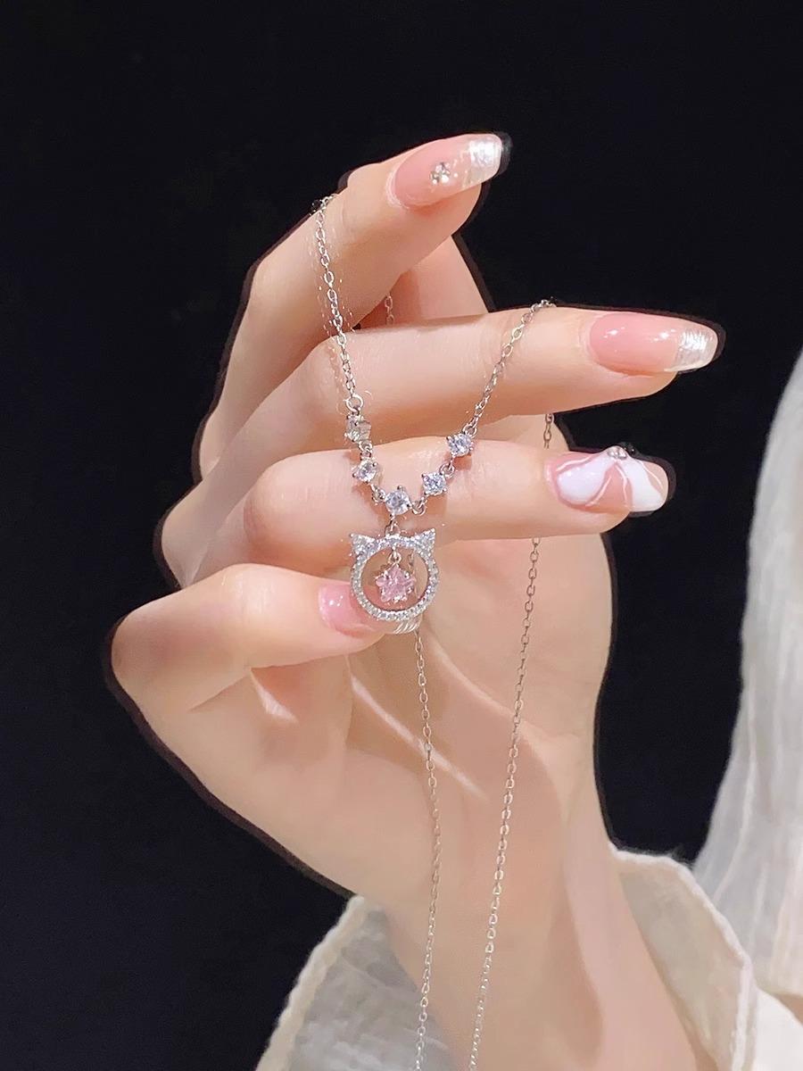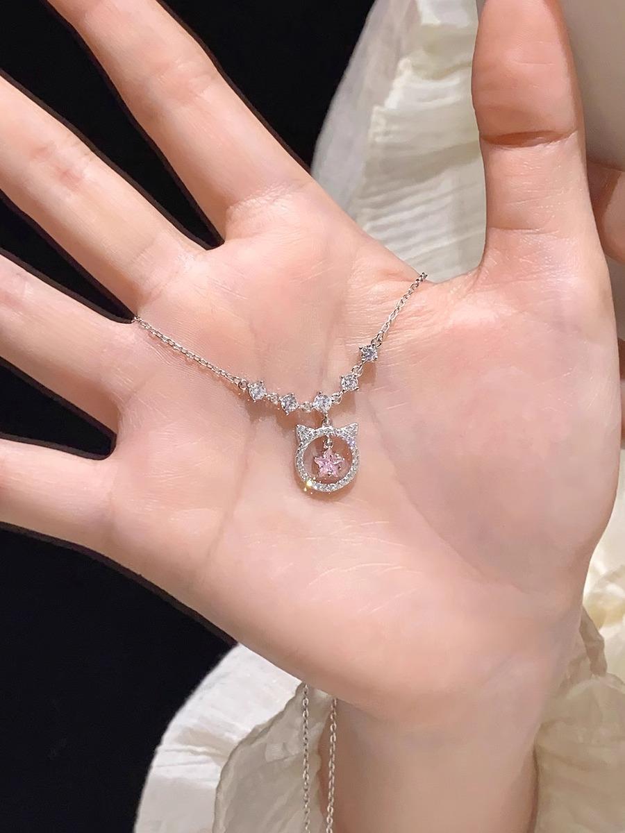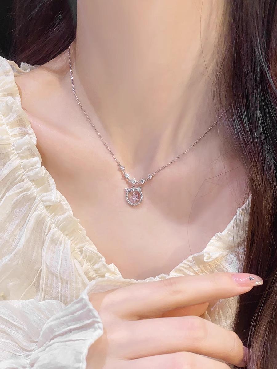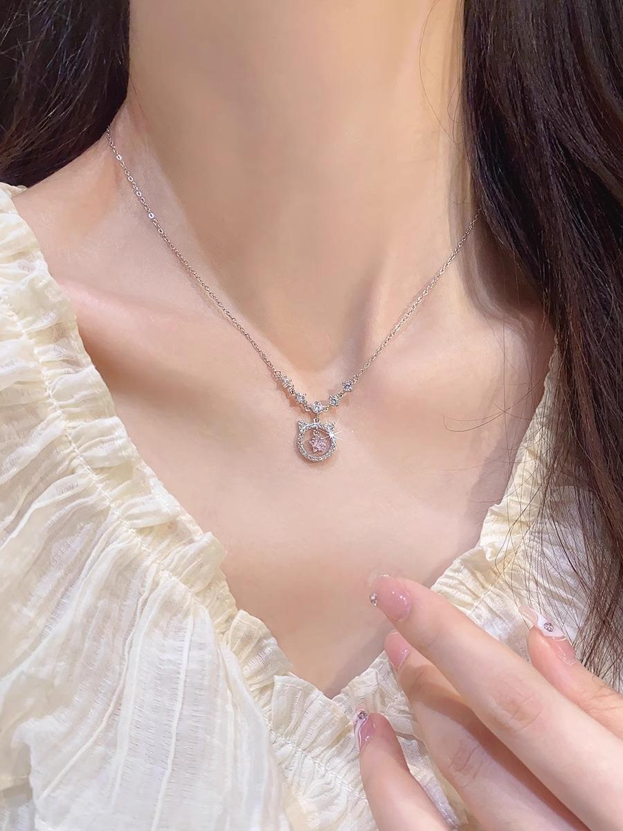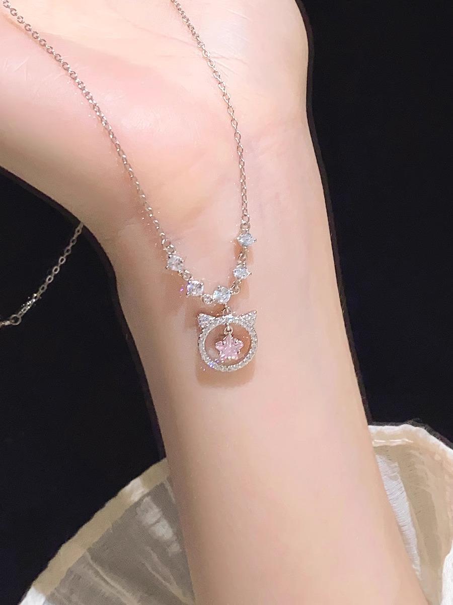 Collar de gato con diamante rosa para mujer, nicho de lujo ligero, exquisito, simple, combinable con todo, cadena para clavícula de alto sentido, nuevo popular 2024