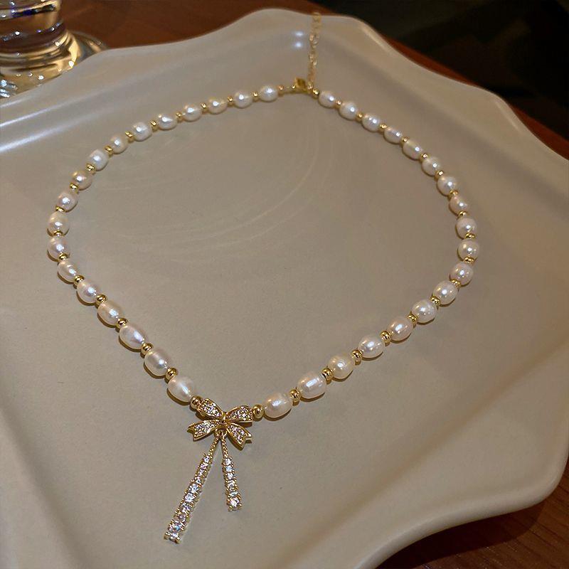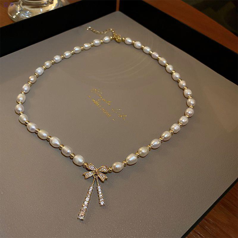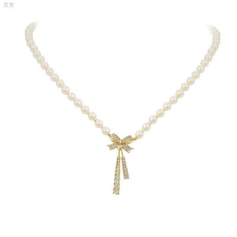 Collar de perlas y lazo de circón para mujer, de verano, ligero, de lujo, de alta gama, elegante, con colgante de mariposa, cadena de clavícula para mujer