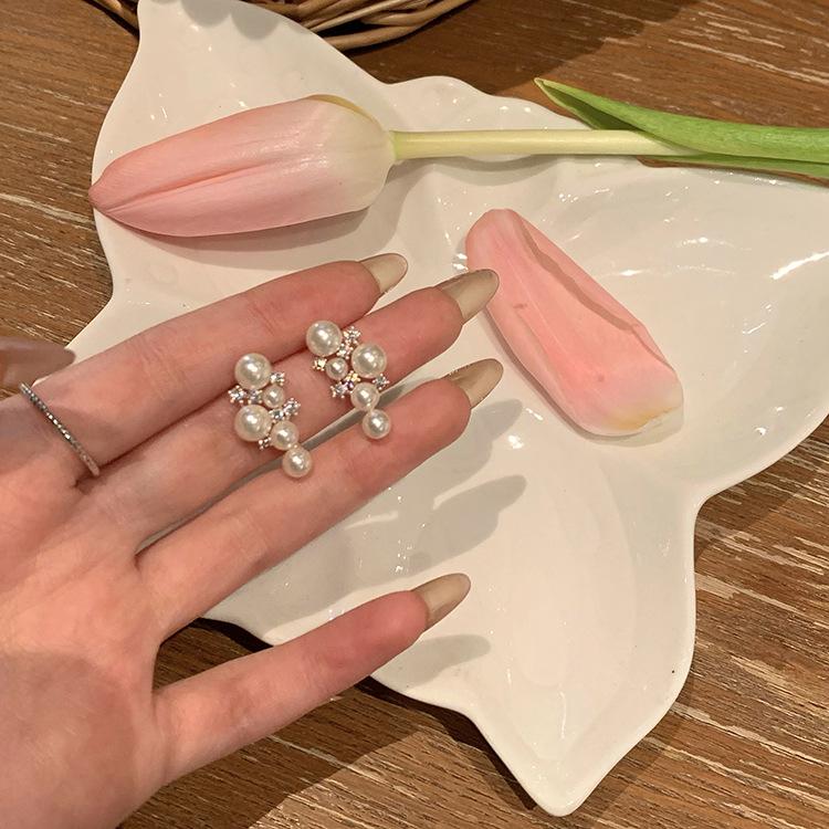 Pendientes de perlas elegantes estilo retro francés, pequeños pendientes de uva para uso diario, ligeros y lujosos, con clip para las orejas para mujer.